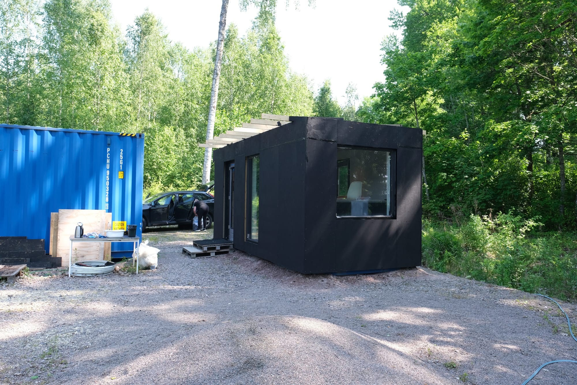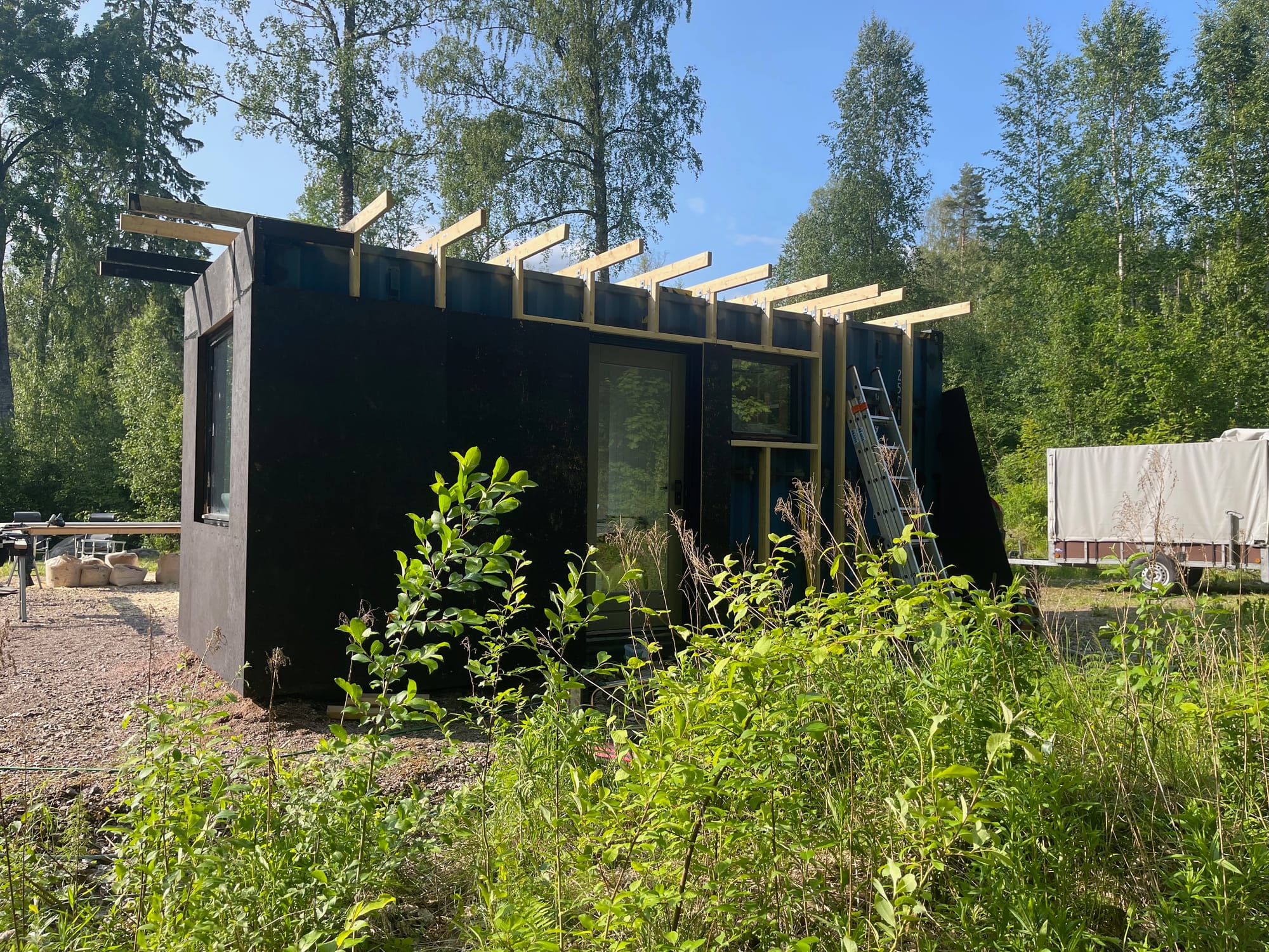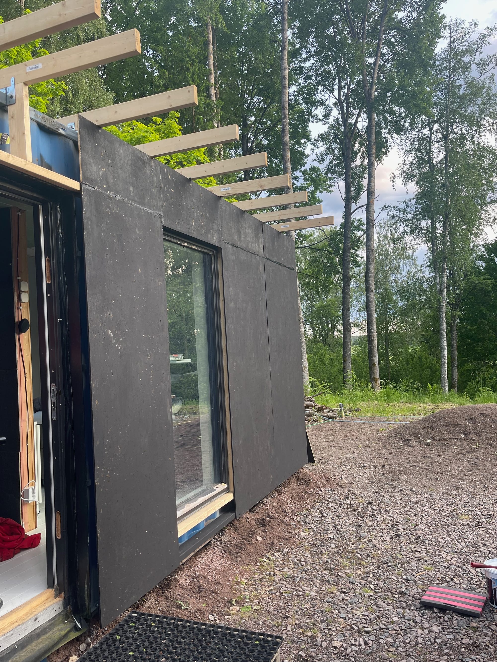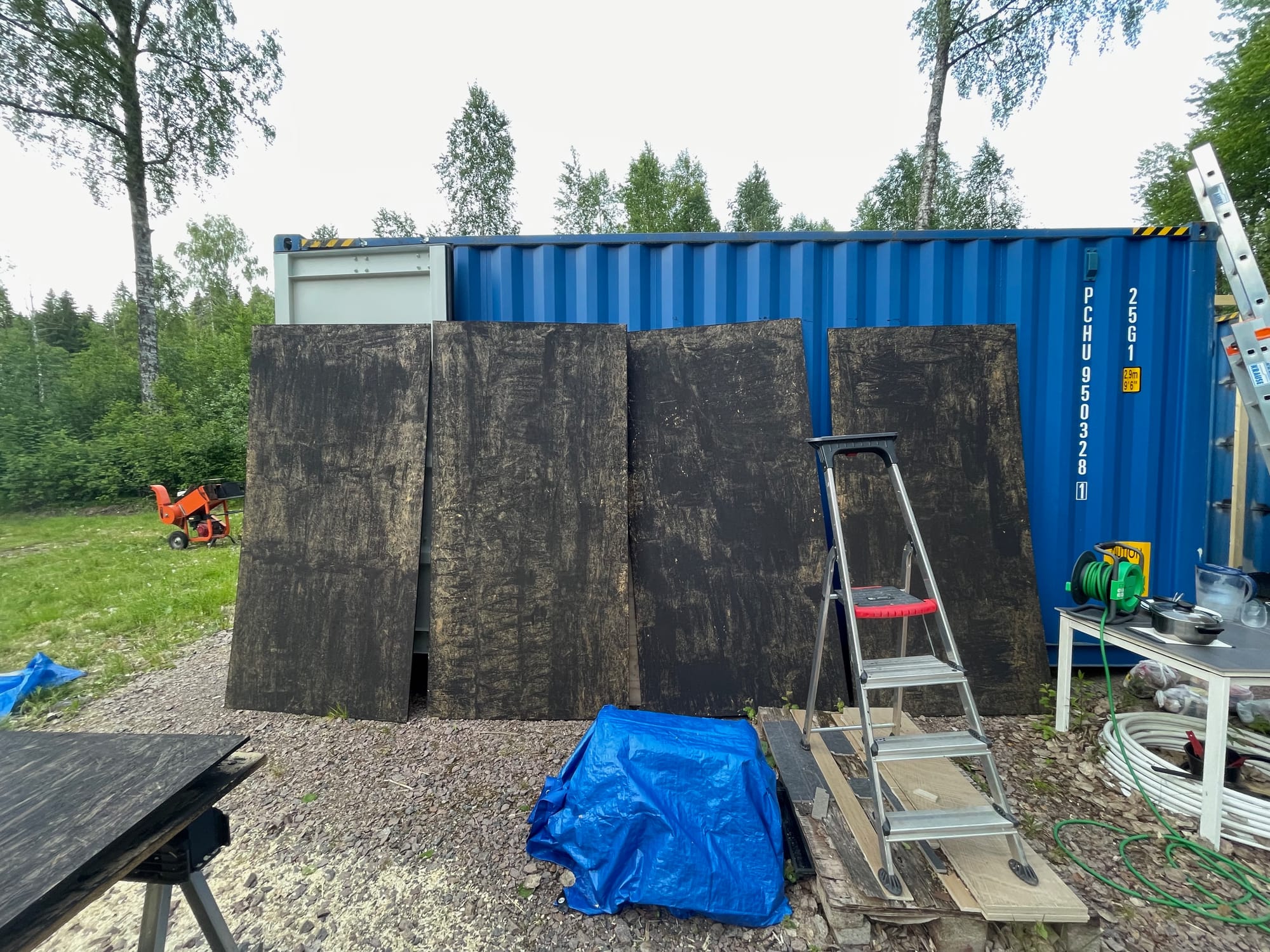 De "oude-blauwe" container is steeds minder zichtbaar nu we de platen erop bevestigd hebben. En het begint steeds meer te lijken op wat we voor ogen hebben. Wel is het schilderwerk een vreselijke klus en de Rodfarg (traditionele Zweedse verf) die wij in de kleur Svart (zwart) hebben gekocht, houdt niet op alle platen even goed. Nu is dat voor de ondergrond niet heel erg belangrijk maar toch willen we proberen om het zo goed dekkend te krijgen als mogelijk is. Dus veel schuren en schilderen deze dagen.