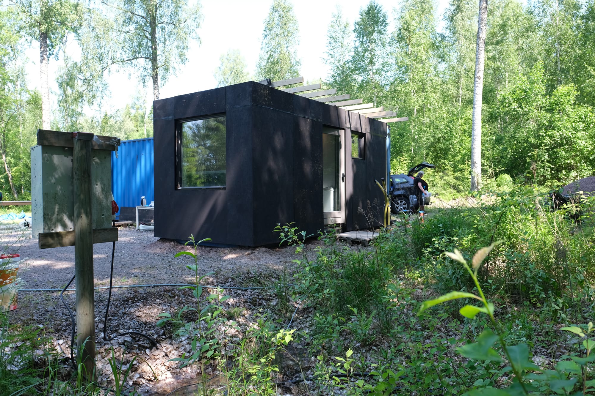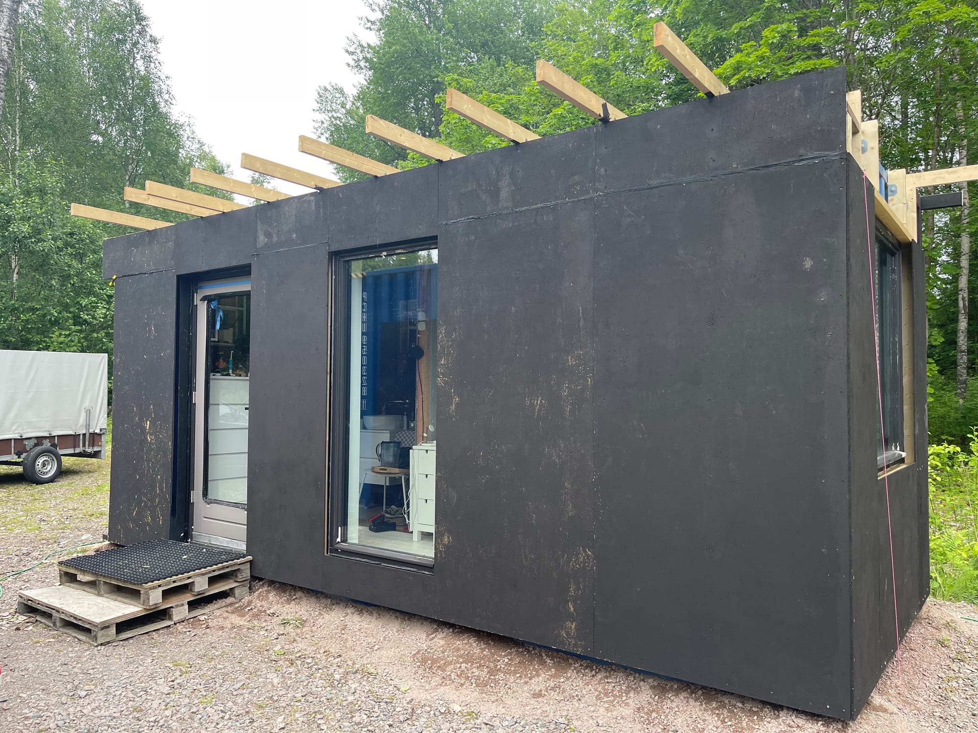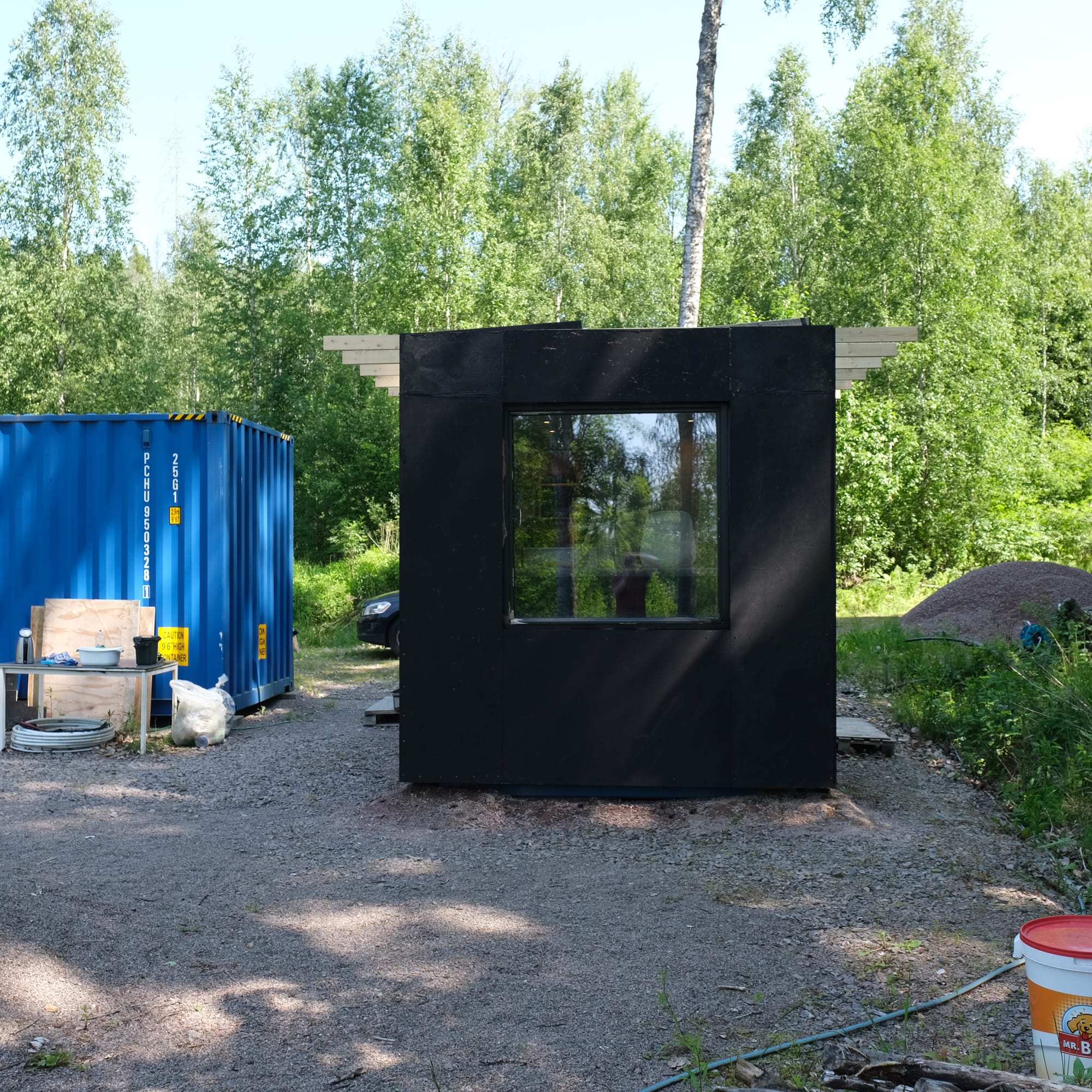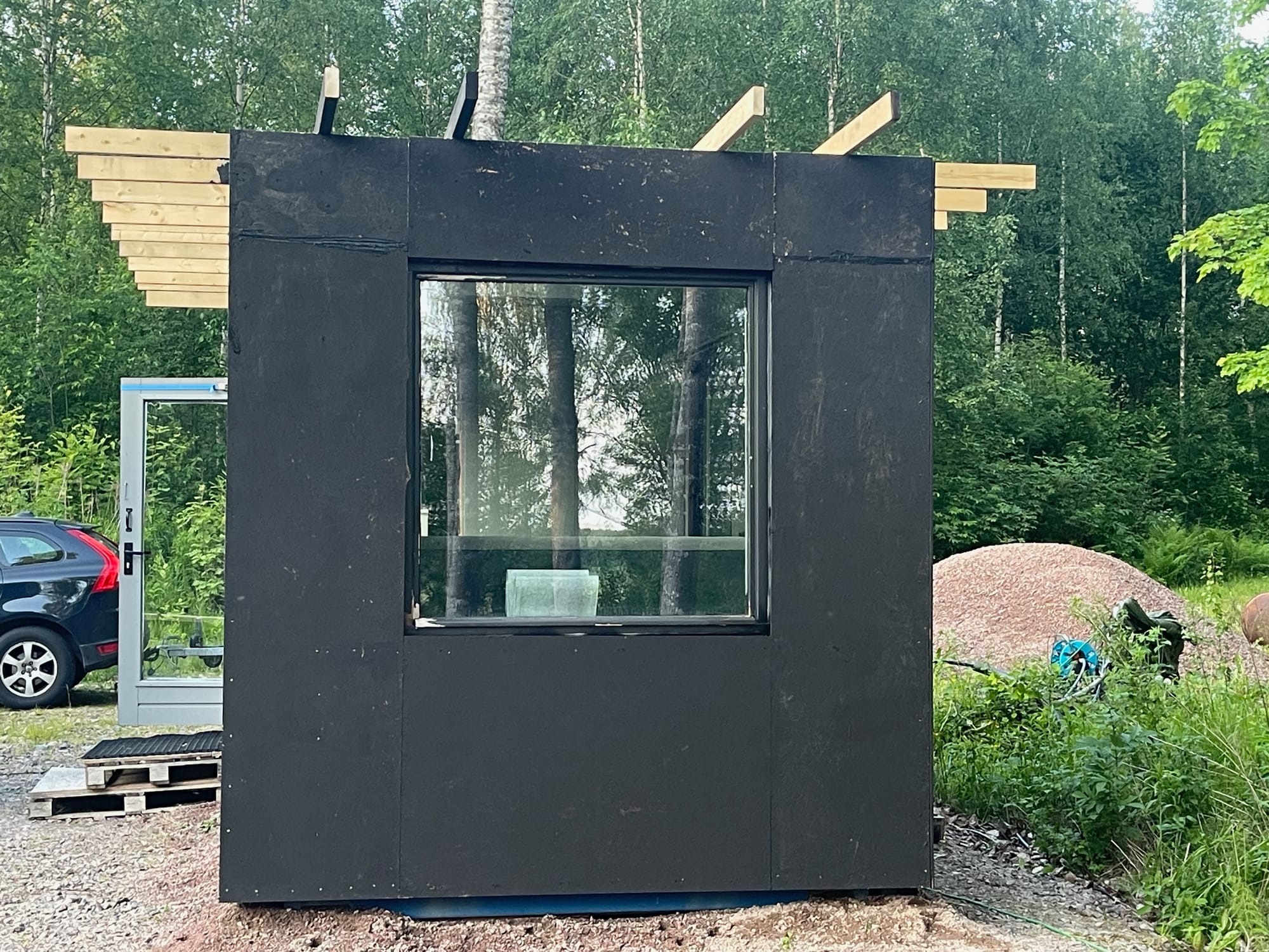 De "oude-blauwe" container is steeds minder zichtbaar nu we de platen erop bevestigd hebben. En het begint steeds meer te lijken op wat we voor ogen hebben. Wel is het schilderwerk een vreselijke klus en de Rodfarg (traditionele Zweedse verf) die wij in de kleur Svart (zwart) hebben gekocht, houdt niet op alle platen even goed. Nu is dat voor de ondergrond niet heel erg belangrijk maar toch willen we proberen om het zo goed dekkend te krijgen als mogelijk is. Dus veel schuren en schilderen deze dagen.