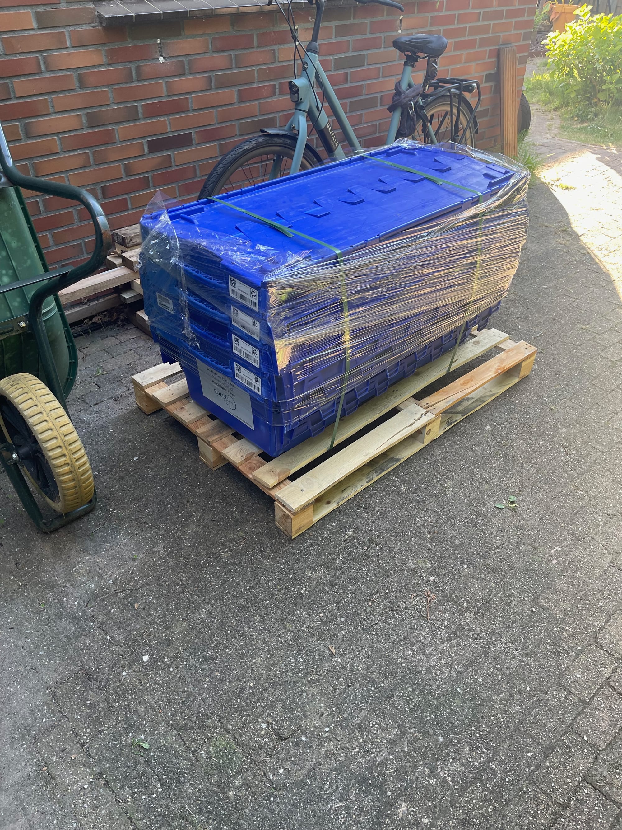 Om het meenemen van gereedschappen en klusspullen nog makkelijker te maken, hebben we grote blauwe transportboxen gekocht. De boxen zijn 1.30 meter lang en ca. 50 cm breed. We kunnen dus razendsnel ons gereedschap en andere spullen in de aanhanger krijgen.