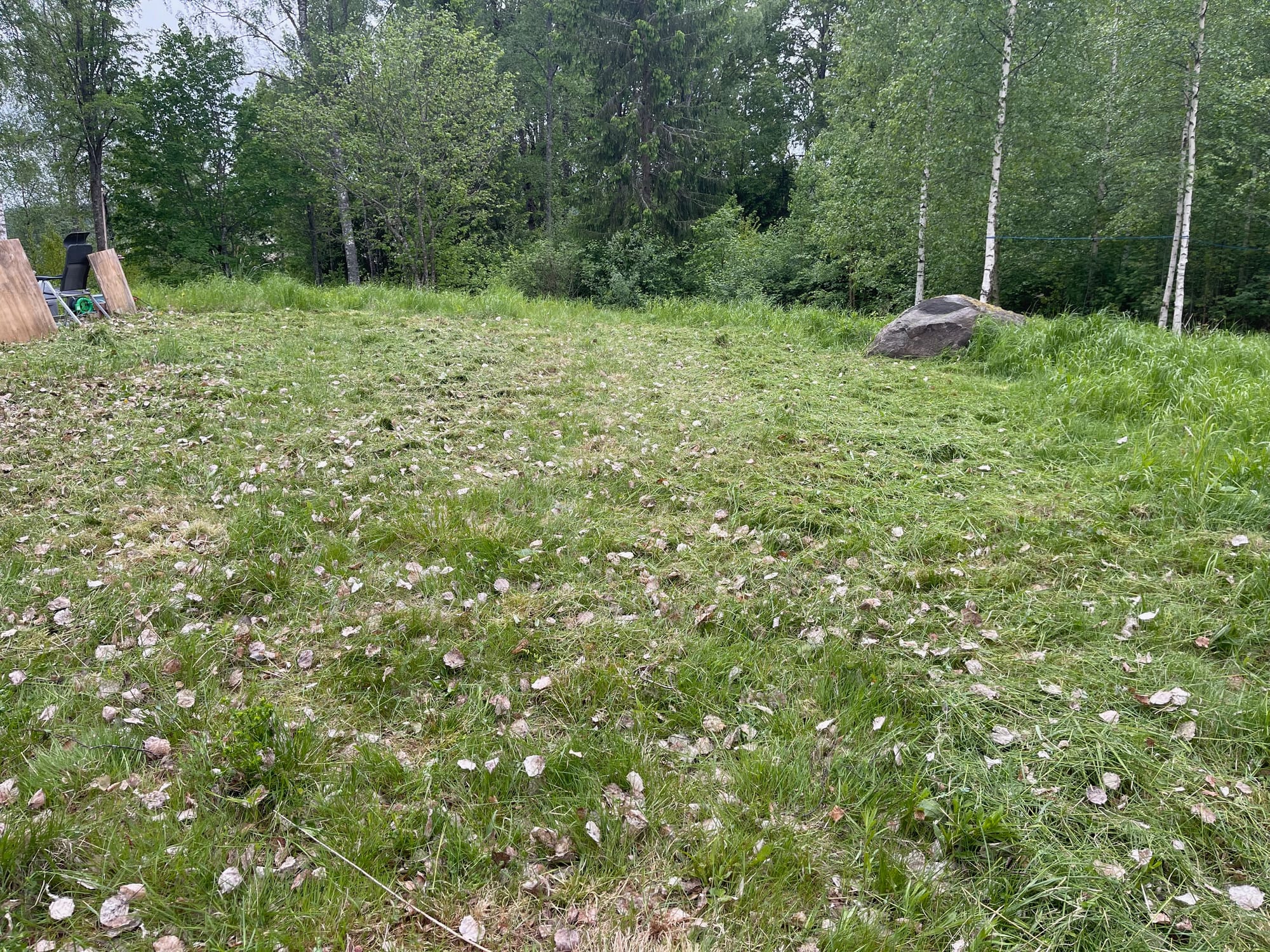 We waren dit jaar al een keer eerder een paar dagen op Baldrskogen (1e week april) en toen was er qua gras nog helemaal niets gegroeid. Nu - 8 weken later - staat het gras inmiddels al weer kniehoog, dus tijd om de bosmaaier er maar weer eens flink over heen te halen.
