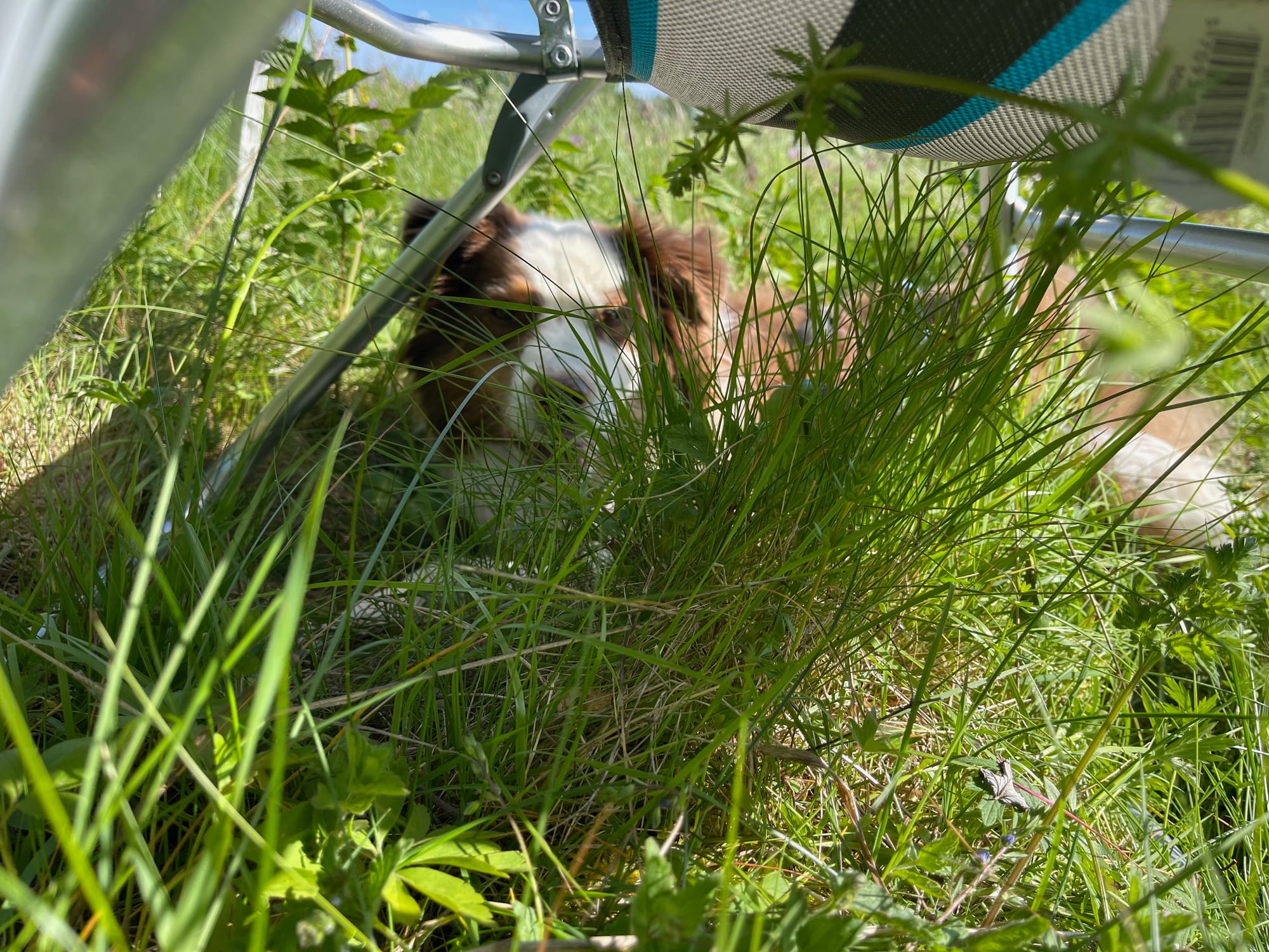 Eenmaal thuis verzamelen we alle spullen die we nodig hebben voor het installeren van Starlink en met alles onder de arm (tafel, stoelen, schotel, gereedschap) dalen we af naar de plek op ons plot aan de rand van het weiland. We zitten er heerlijk bij en Jillz is ook lekker mee.