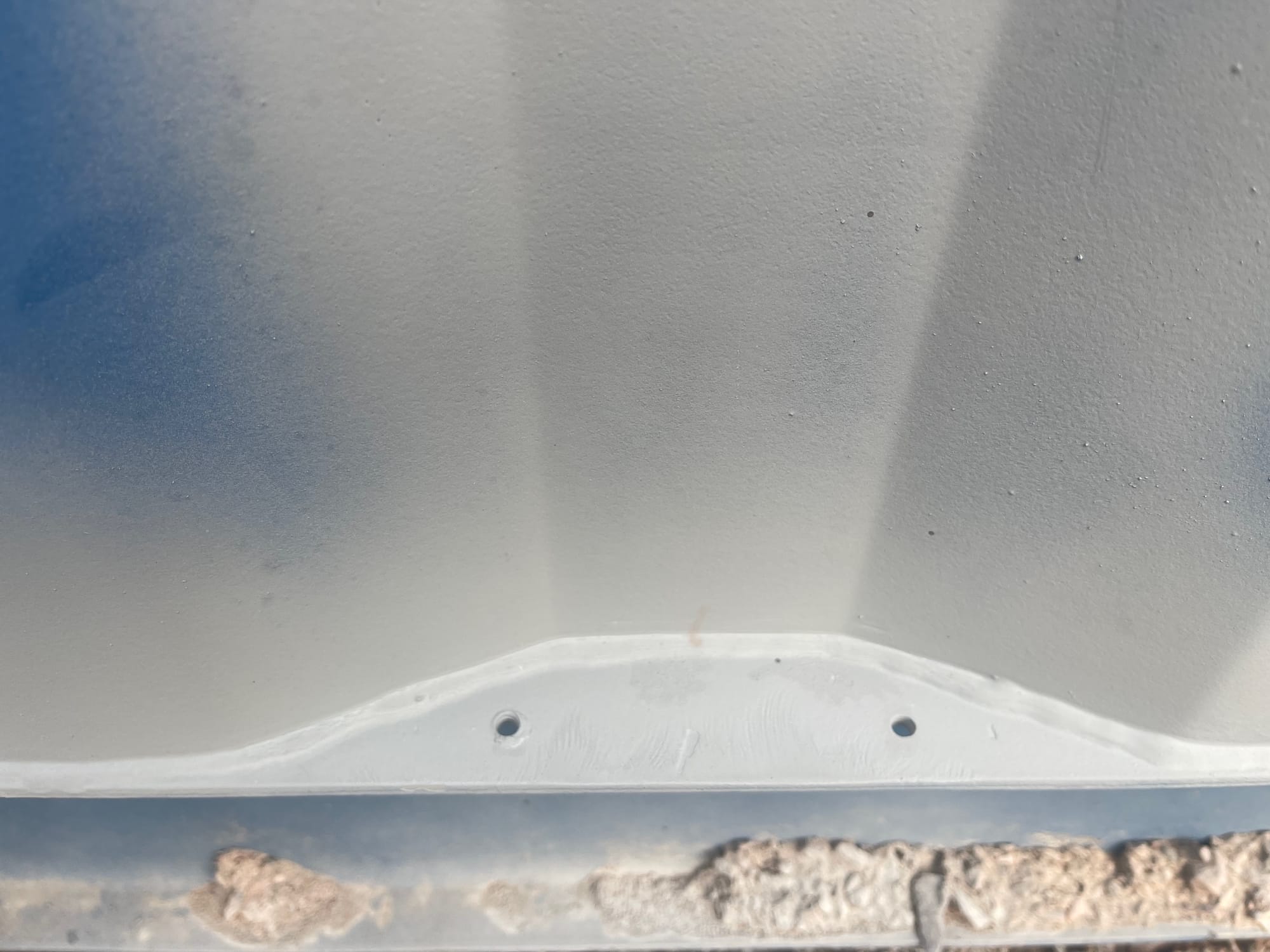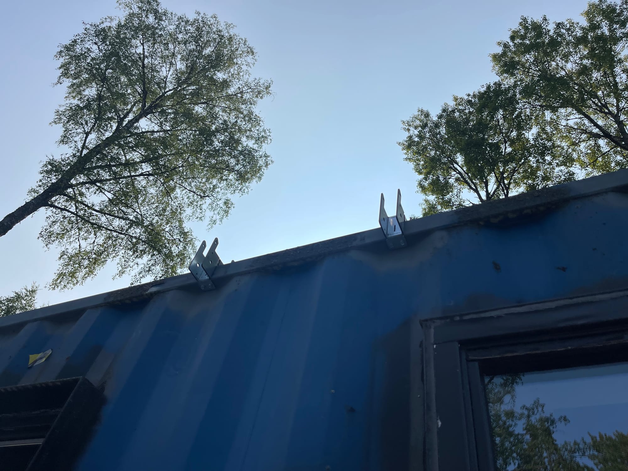 We verwijderen de stalen strips die we op de buitenkant van de container hadden gemaakt. Niet meer nodig nu we met de Canadese brackets gaan werken. We maken de container schoon (verwijderen aanslag van bomen, bladeren etc), boren de gaten voor de brackets en doen zinkspray op de plekken waar straks de brackets komen. De spray moet 24 uur drogen.