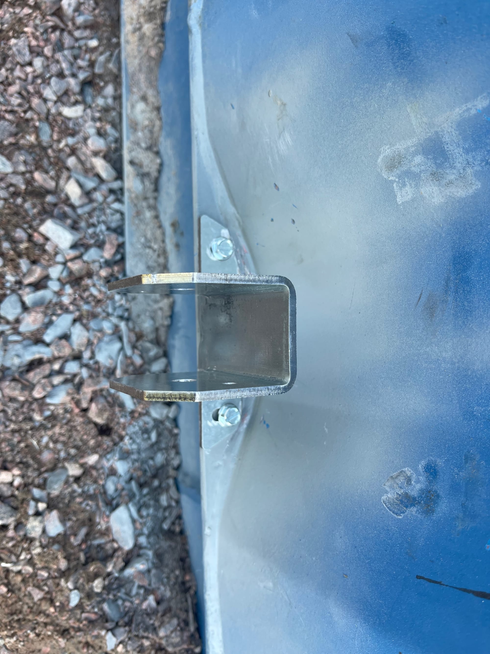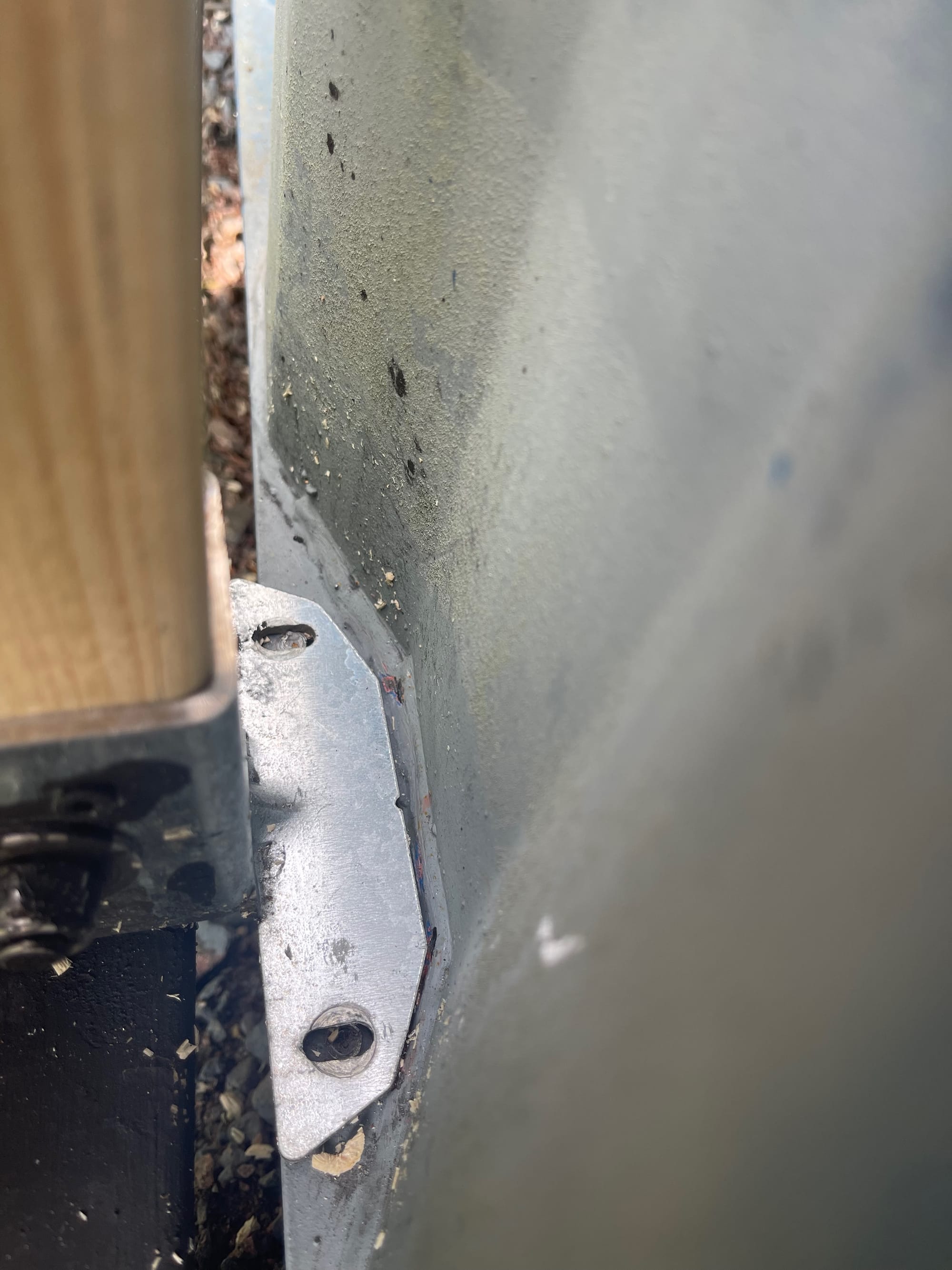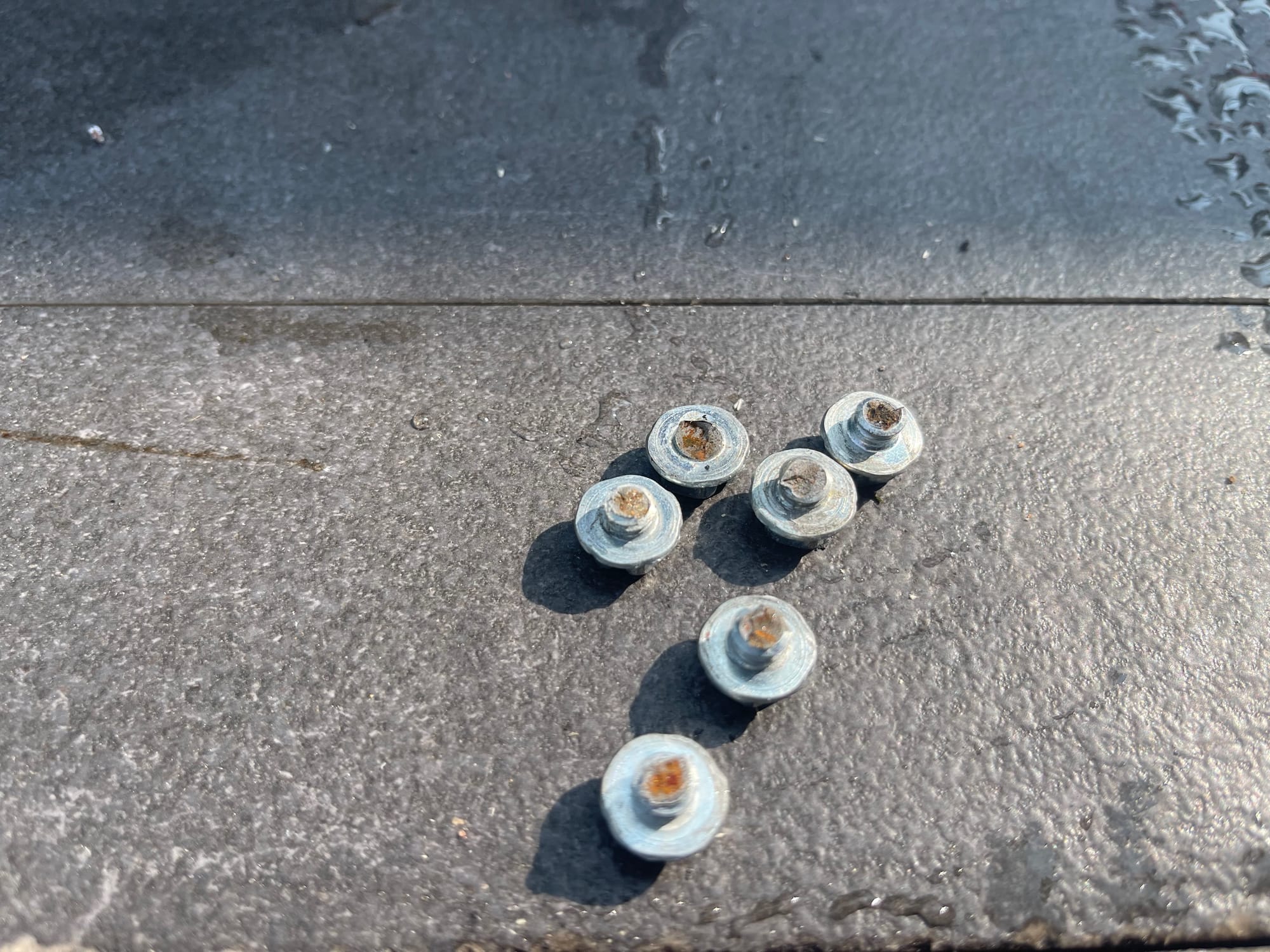 Wat ons opvalt is dat we af en toe een vreemde "ploink" horen. Het geluid heeft iets metaligs en lijkt op het loskomen van de stalen strips van vorige week. Als we een inspectierondje om de container lopen zien we dat er koppen van de zelftappende schroeven op de grond liggen. We vrezen dat het vastzetten van de brackets met de zelftappende schroeven in kleine boorgaten voor teveel spanning zorgt. We lopen alle schroeven na en diegene die loskomen vervangen we waar mogelijk voor nieuwe nadat we eerst het gat iets groter hebben geboord. Gelukkig is de constructie als geheel zo stevig dat het her en der ontbreken van een schroef geen verschil zal maken.