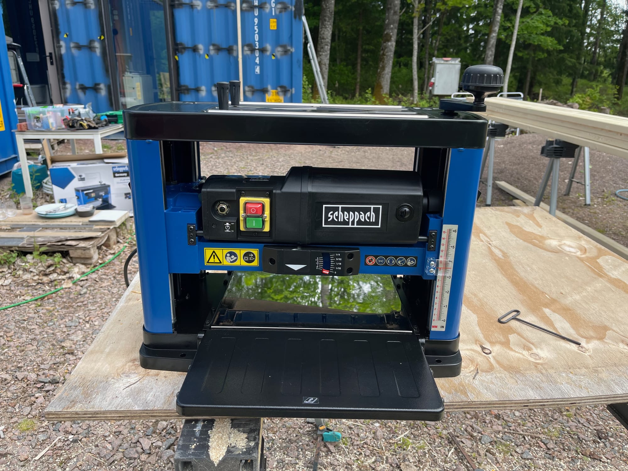 Om de balken in de brackets te kunnen krijgen, moeten we ze op maat schaven. Een hele klus want voor het mooi willen we de hele lengte van de balk geschaafd hebben. Om een inschatting te maken hoe vaak de schaafmachine over de balk gehaald moet worden, ga ik dus tellen en wat denk je..... ik moet minimaal 8 keer schaven om het op maat te krijgen. Okay, niet zeuren, gewoon doen.... Maar dan, bij de 2e balk, is de accu van de schaafmachine leeg. Dat gaat dus echt niet werken en ik besluit dat we echt niet zonder een ............... vlakschaafmachine (eng: planer) kunnen. Jippie, we mogen weer naar de Bauhaus ;-).