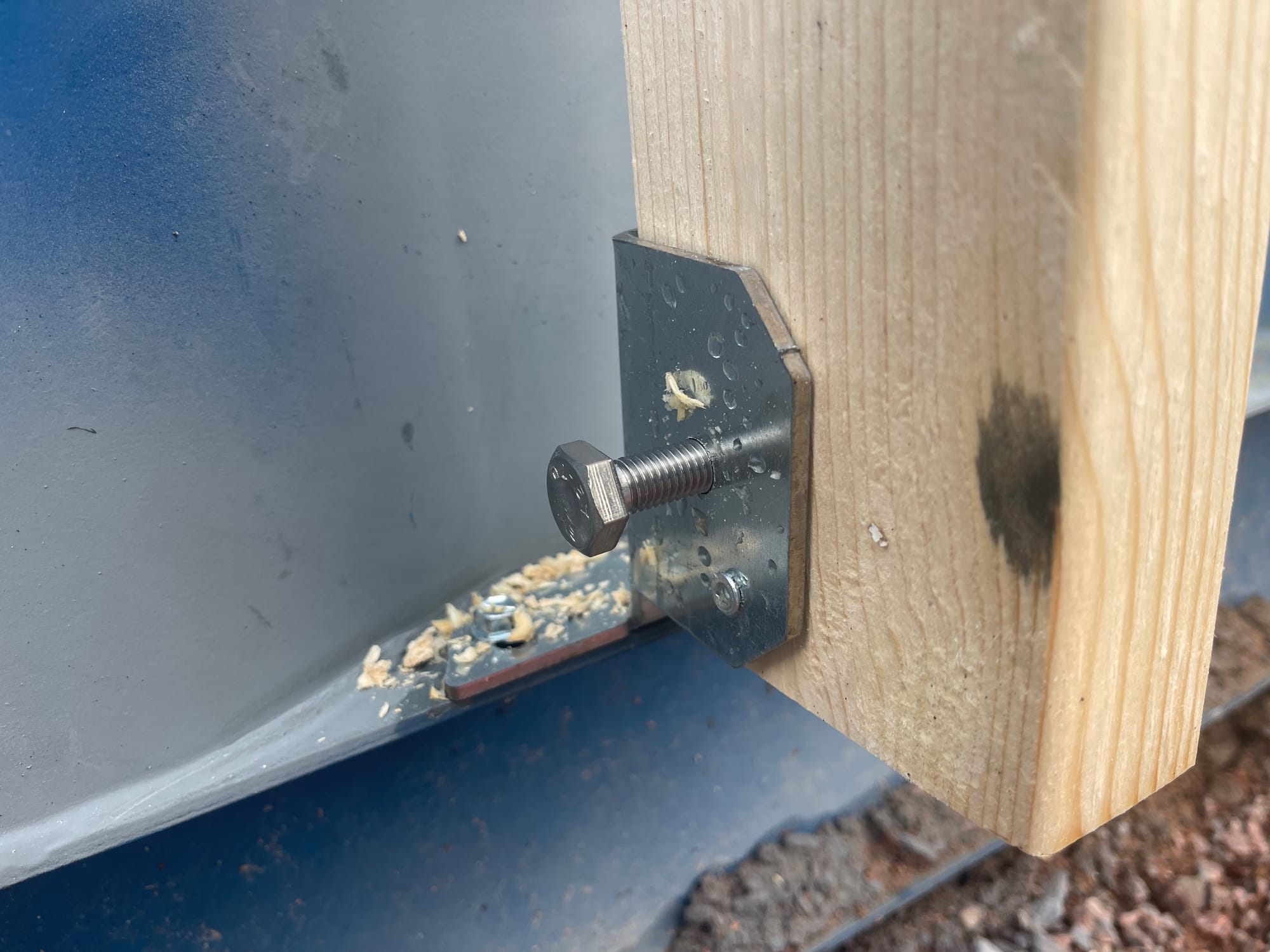Eenmaal terug gaat het schaven als een malle en net voor de regen zijn we klaar met alle 30 balken 3 x schaven. Tijdens de regen kijken we het filmpje van de Canadese container guy nog een keer en horen dat hij een tip heeft om de balken in de brackets vast te zetten met een bout en een moer in plaats van met schroeven. We besluiten dat wij dat ook willen en we realiseren ons dat we deze materialen niet in ons bezit hebben. Dus ook vandaag, voor de 2e keer naar de Bauhaus. Heel blij dat we hiervoor gekozen hebben want de balken zitten nu echt muurvast.