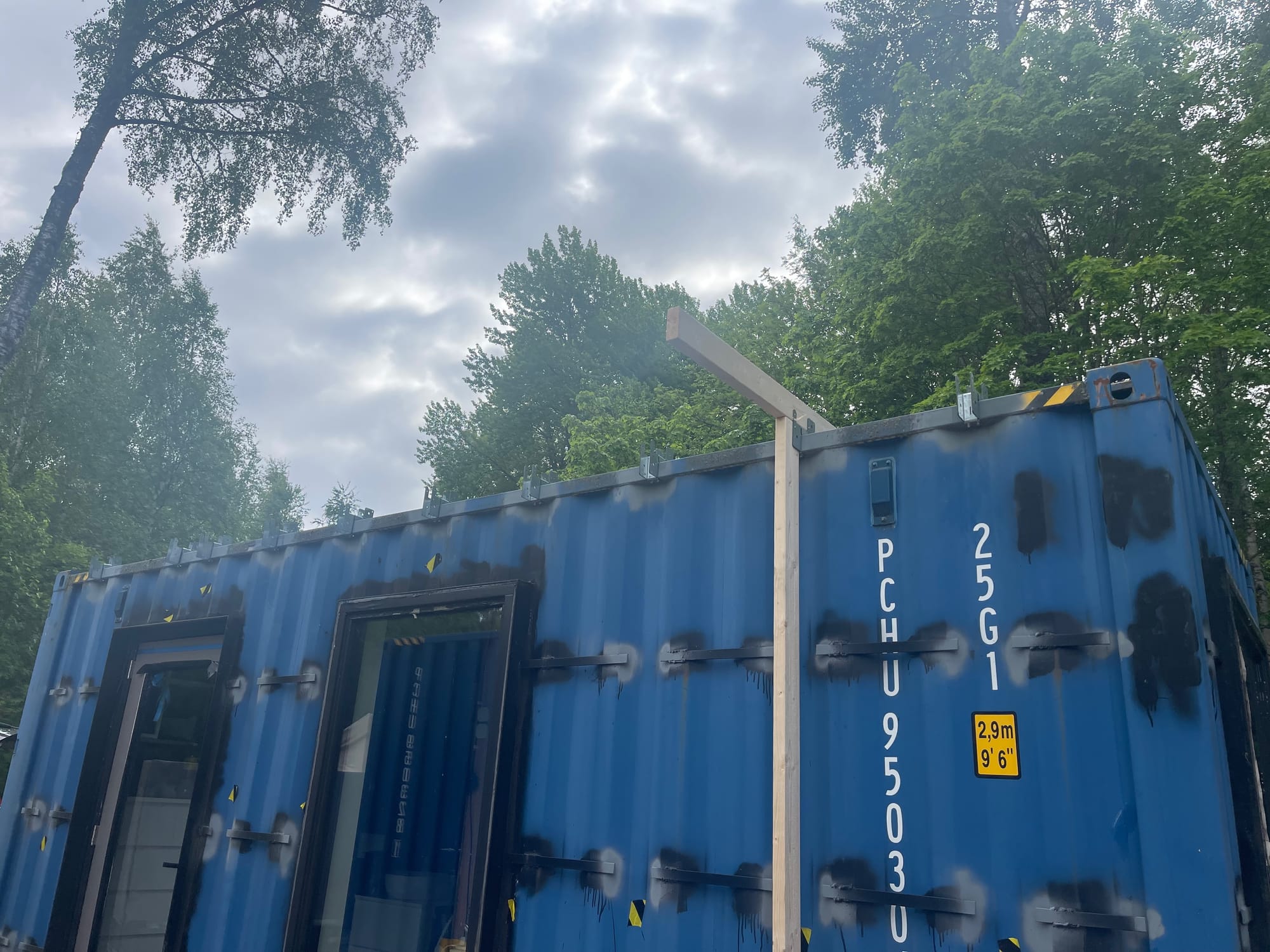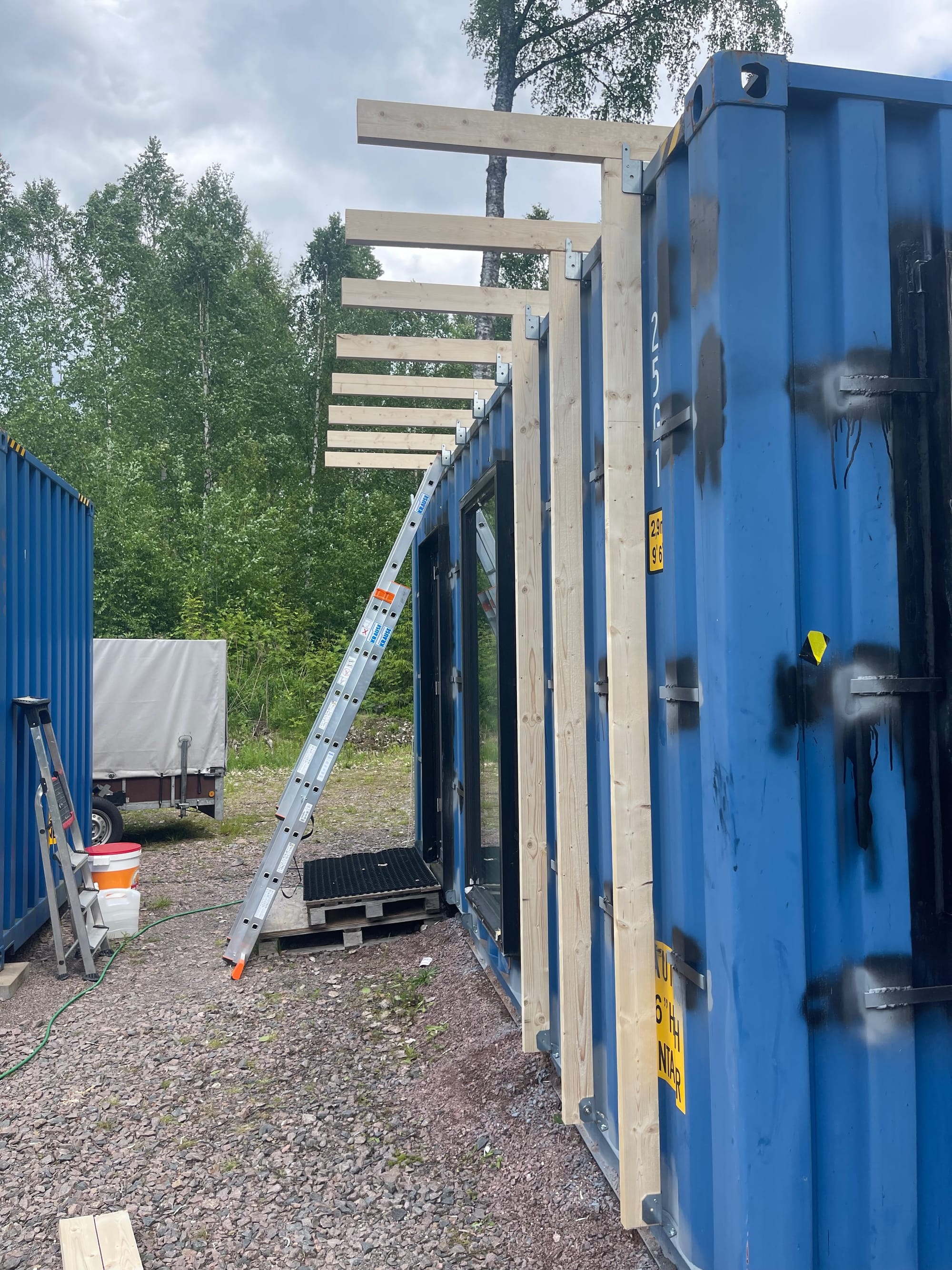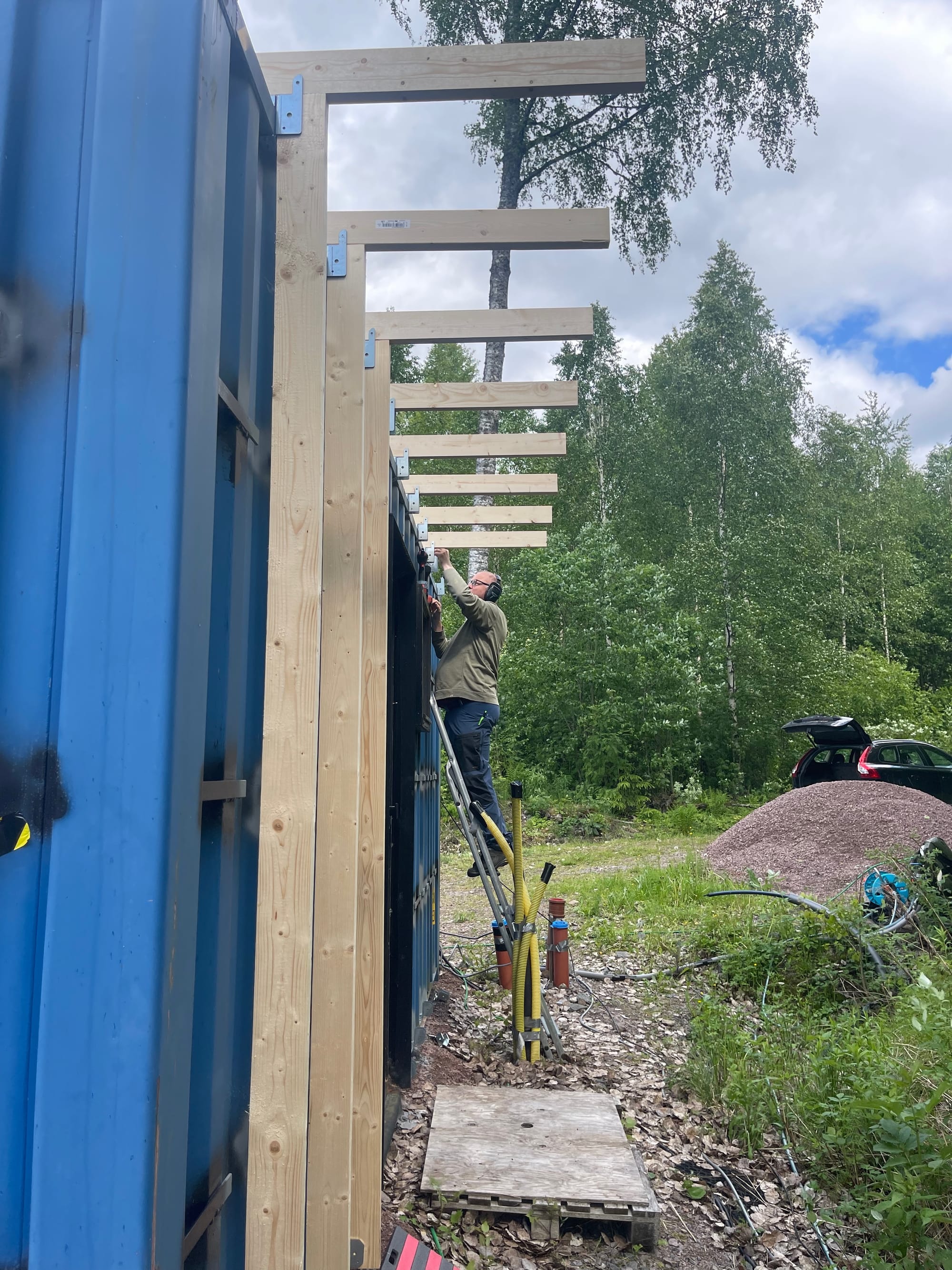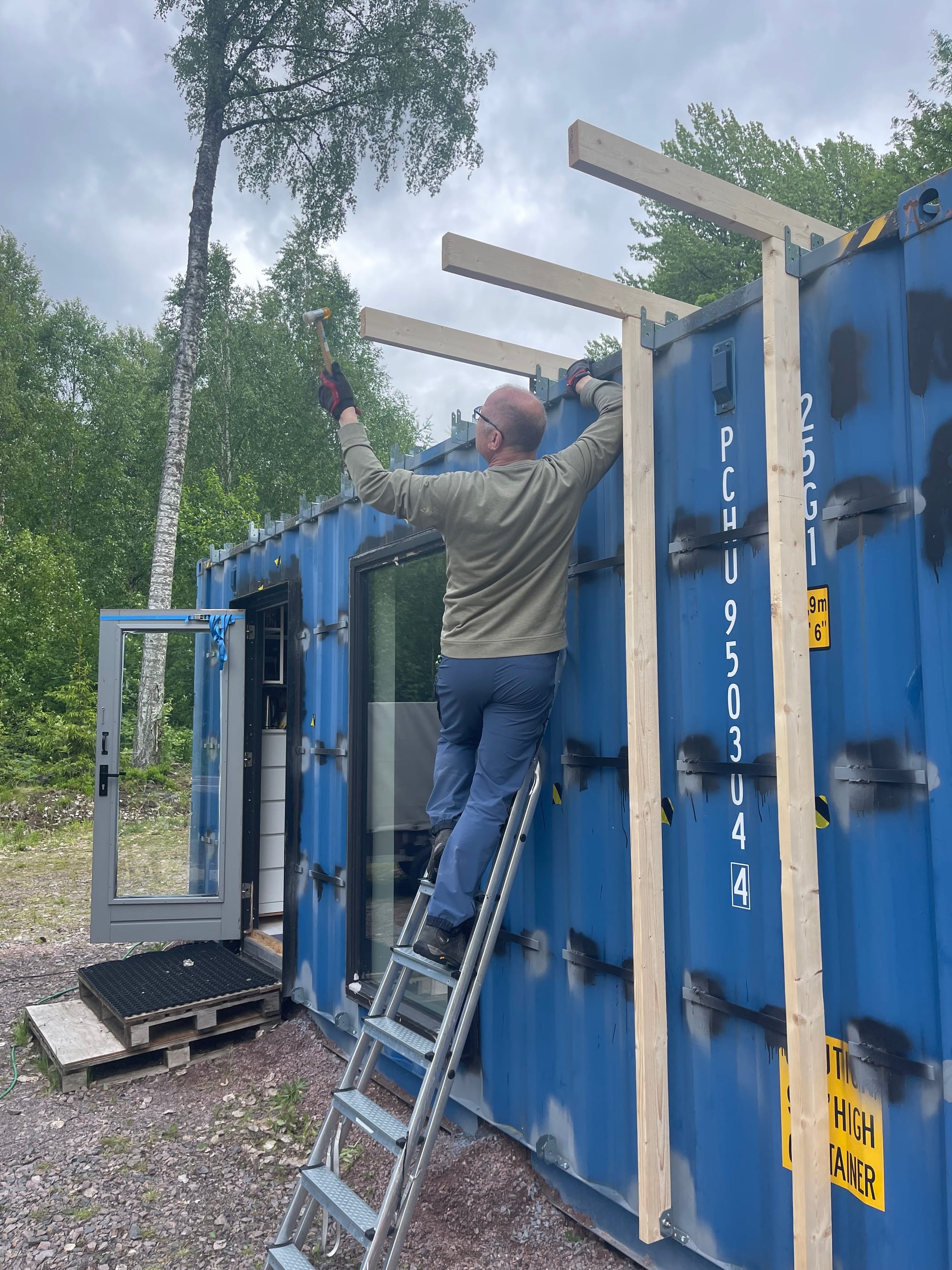 De volgende dagen van ons verblijf in Zweden staan in het teken van het plaatsen van de balken, het schilderen van de platen en deze bevestigen aan de container. Omdat veel dagen het werk veel van hetzelfde is, laten we jullie hier liever de foto's van de voortgang zien dan iedere dag opnieuw een beetje van hetzelfde te beschrijven.