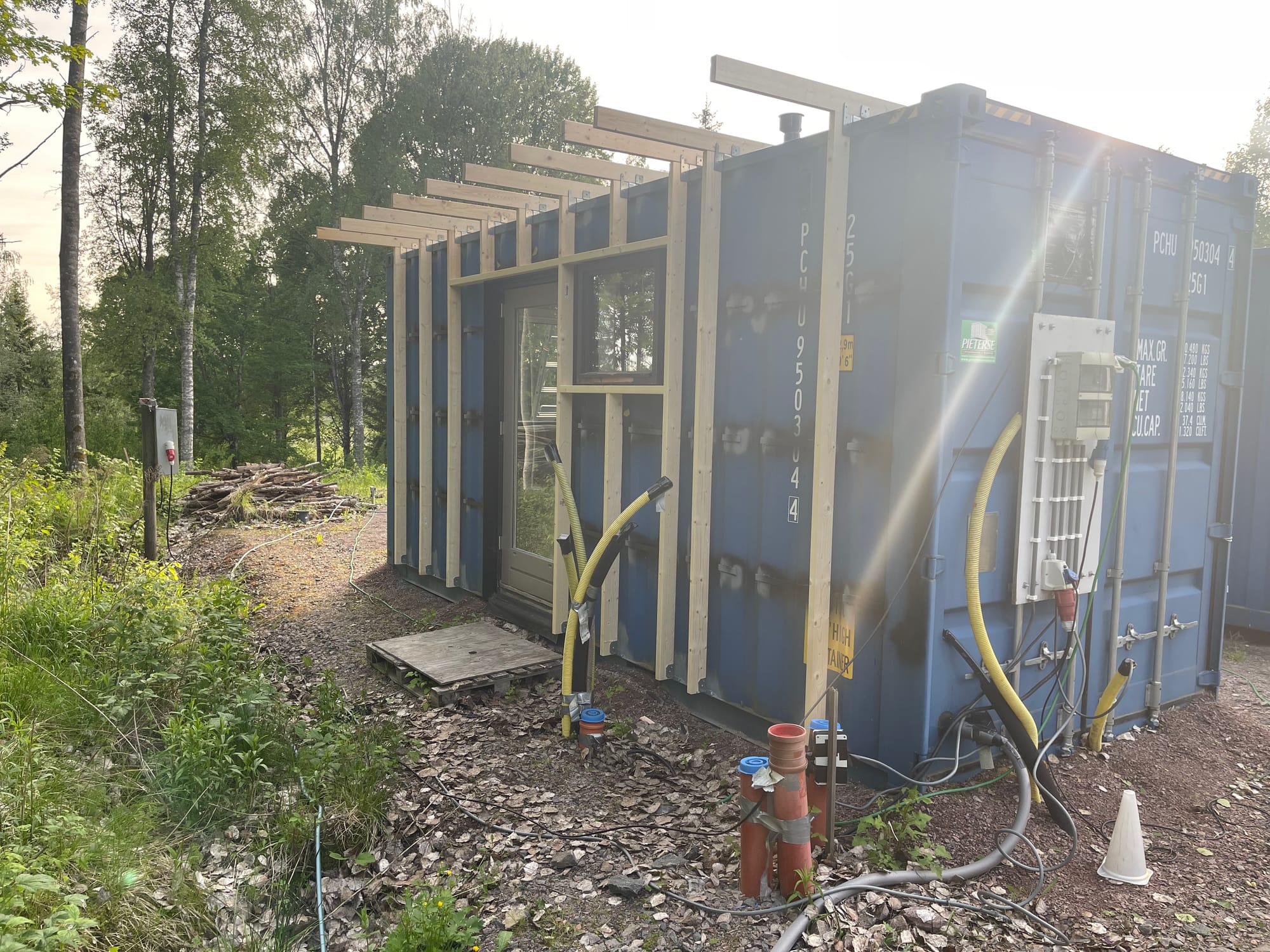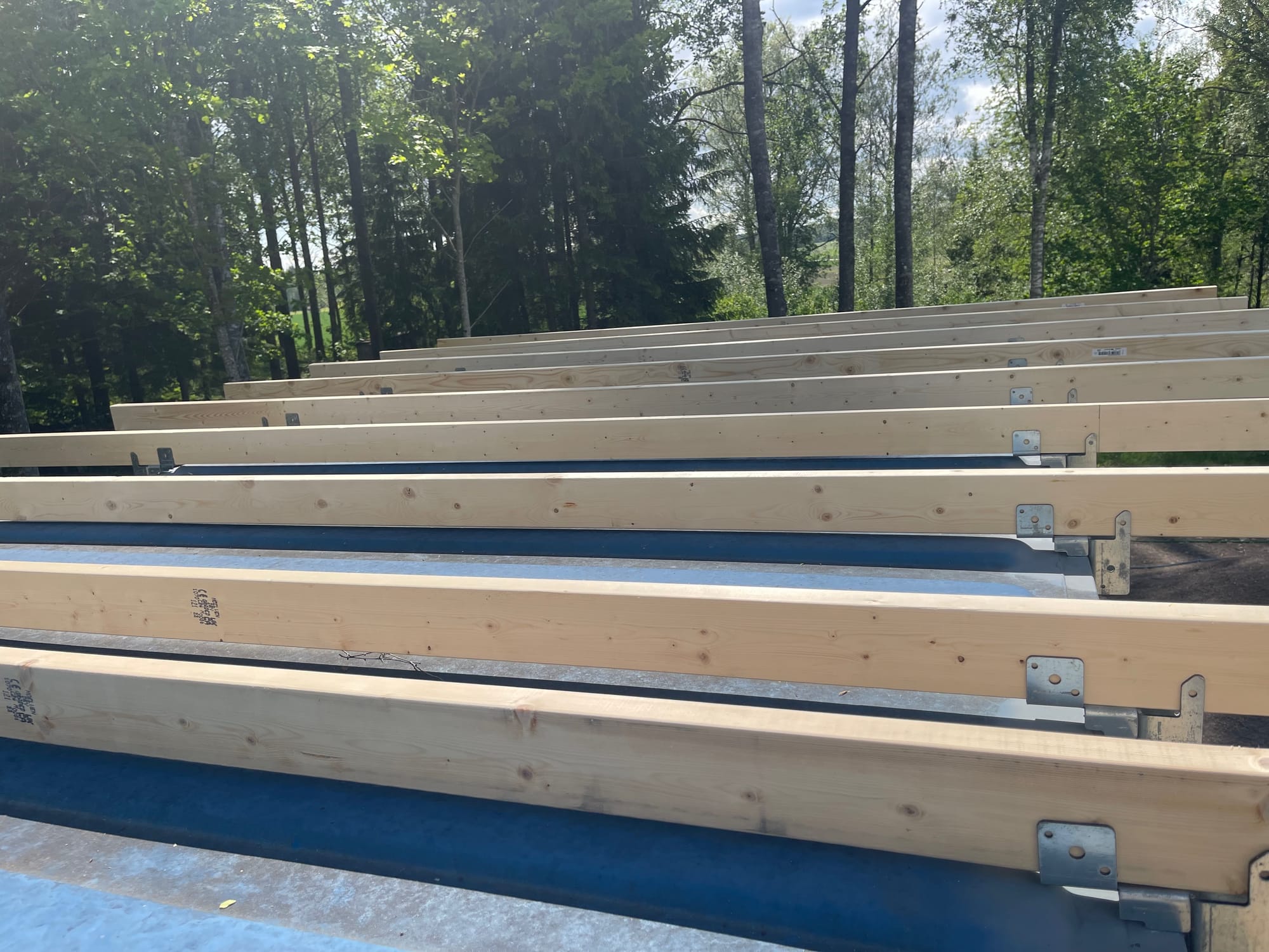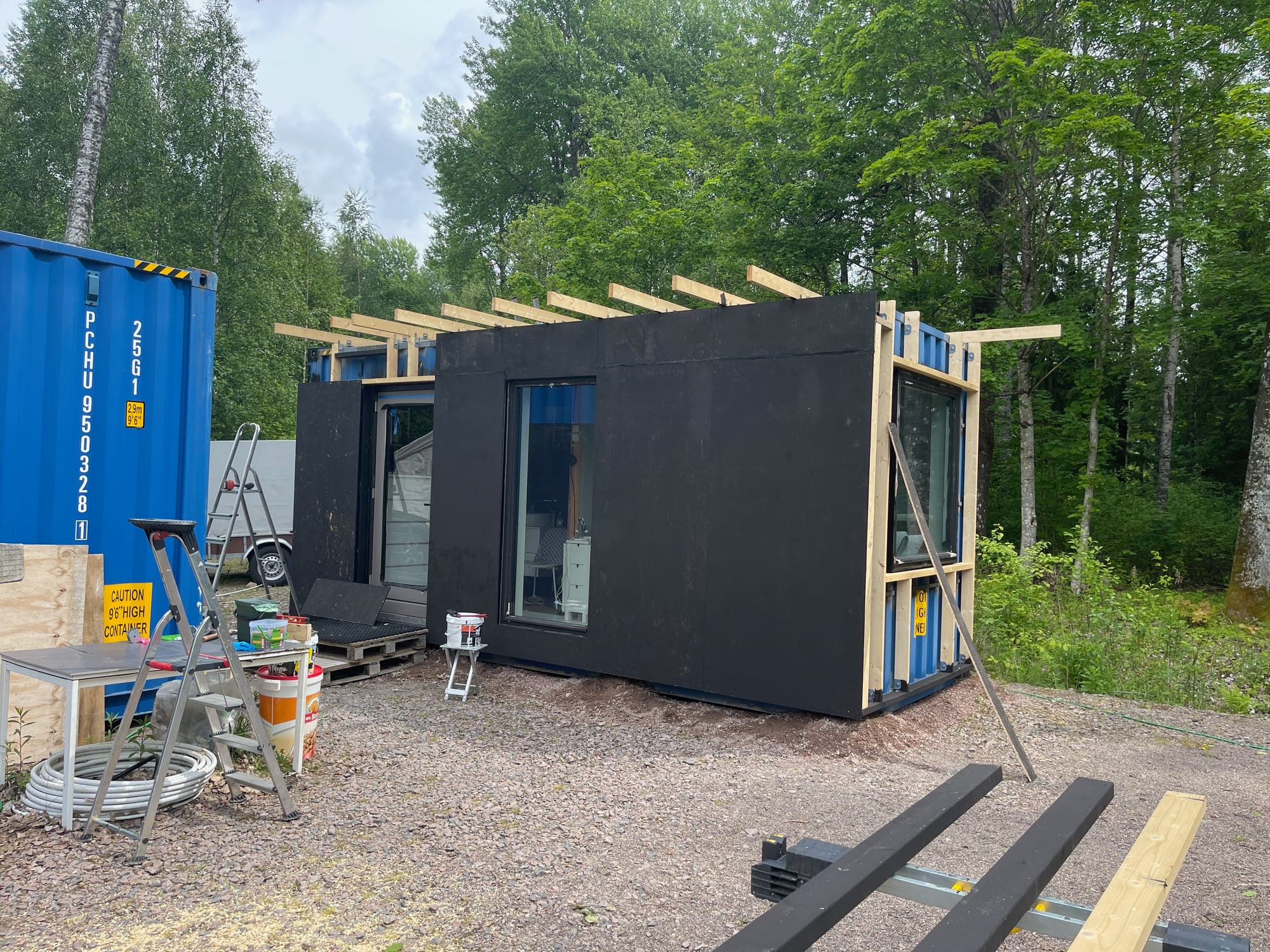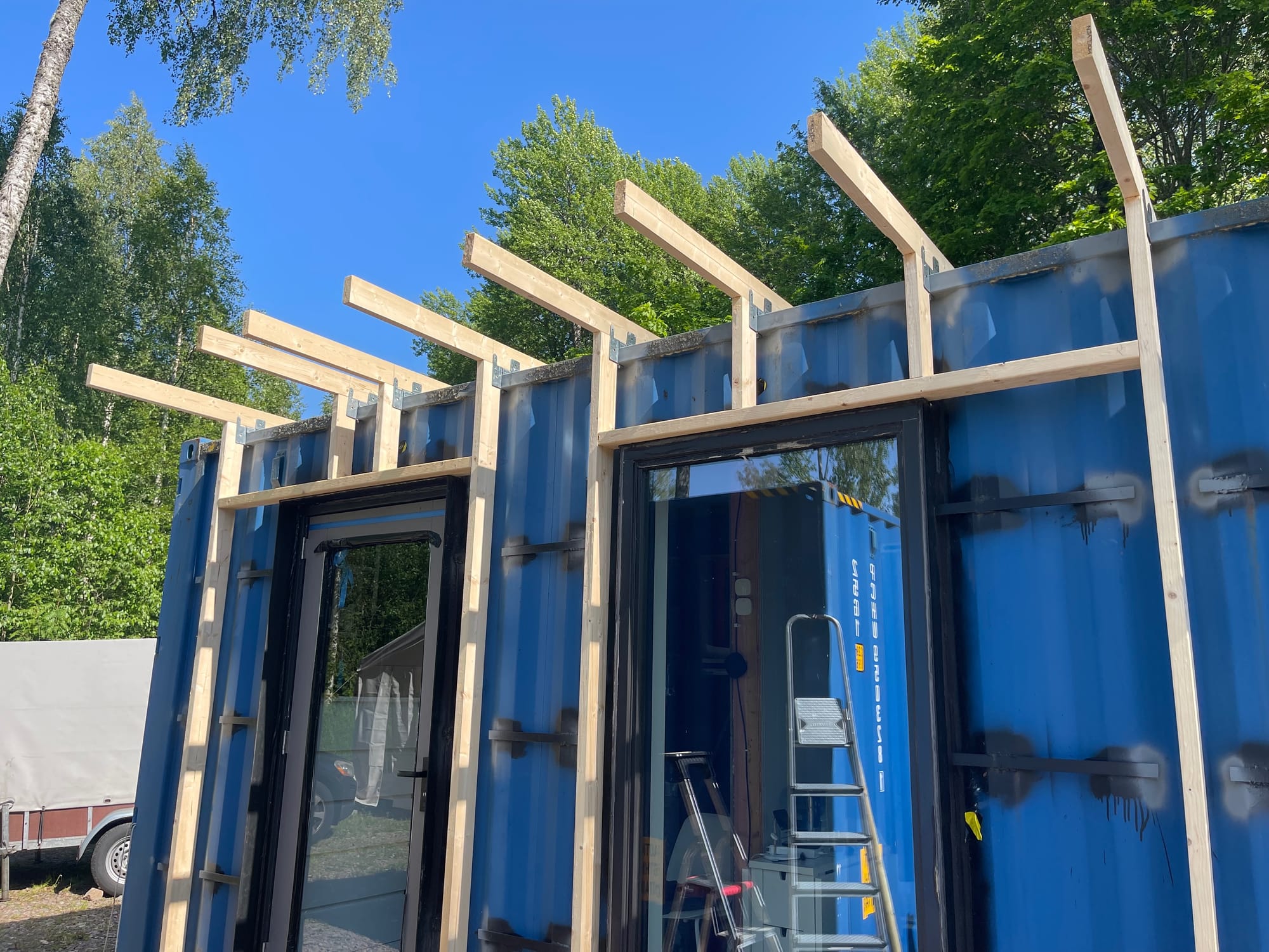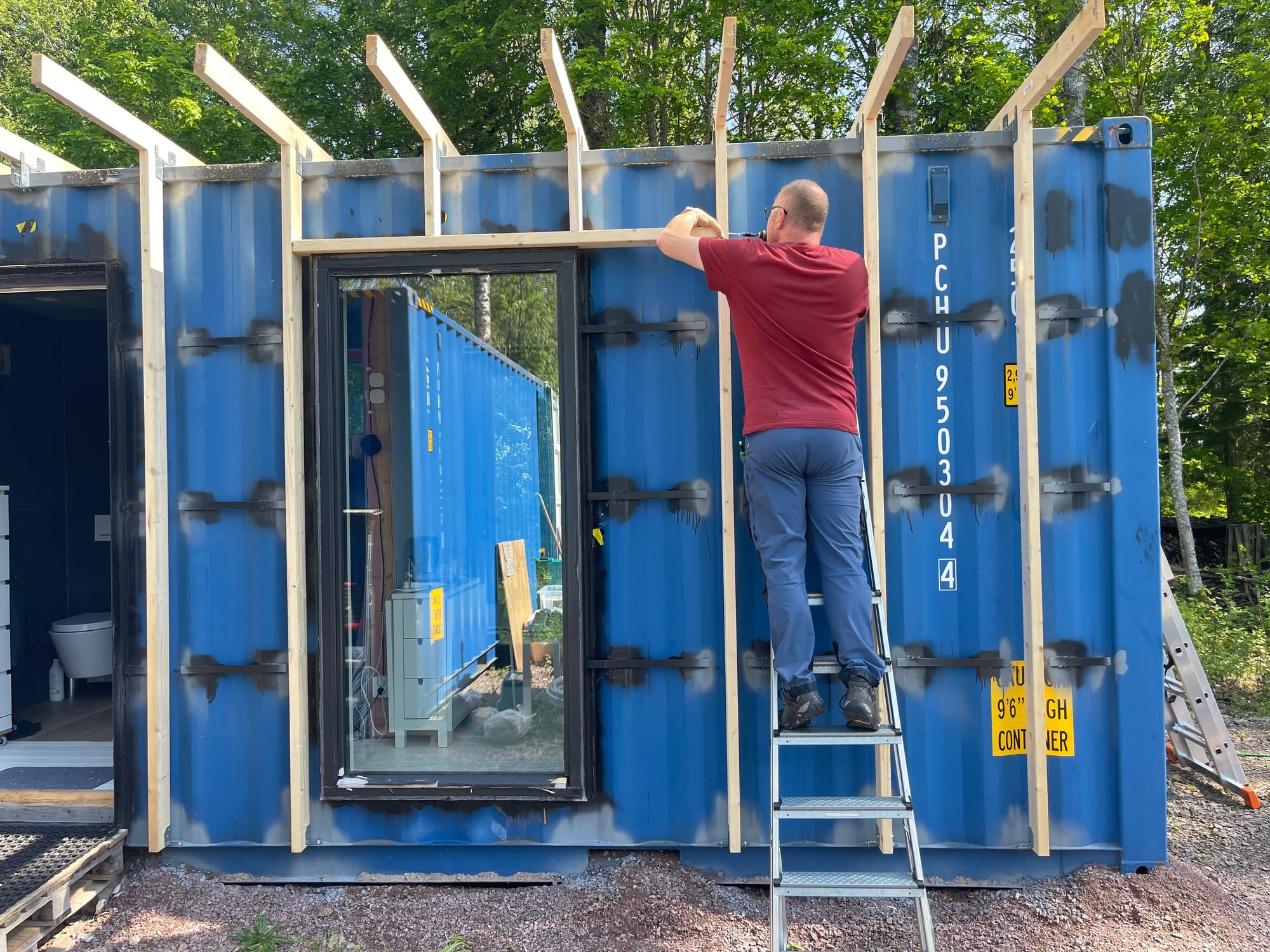 De volgende dagen van ons verblijf in Zweden staan in het teken van het plaatsen van de balken, het schilderen van de platen en deze bevestigen aan de container. Omdat veel dagen het werk veel van hetzelfde is, laten we jullie hier liever de foto's van de voortgang zien dan iedere dag opnieuw een beetje van hetzelfde te beschrijven.