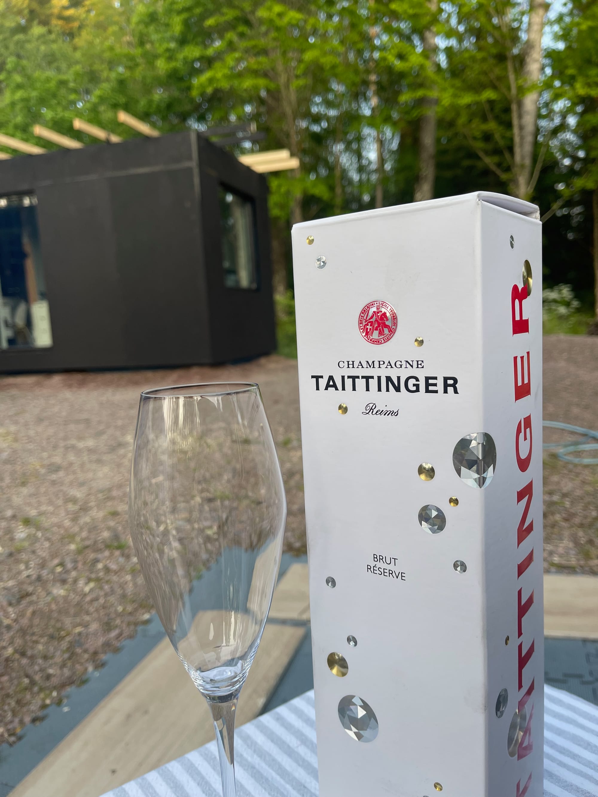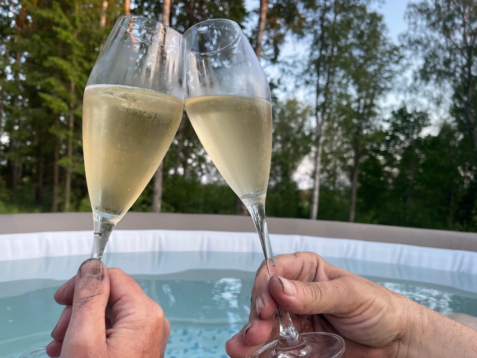 We springen voor het laatst deze vakantie in de jacuzzi en poppen we de champagne open die al een jaar hier in de koelkast ligt. Het werk zit erop!