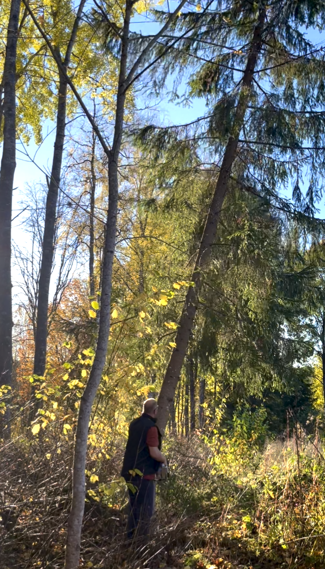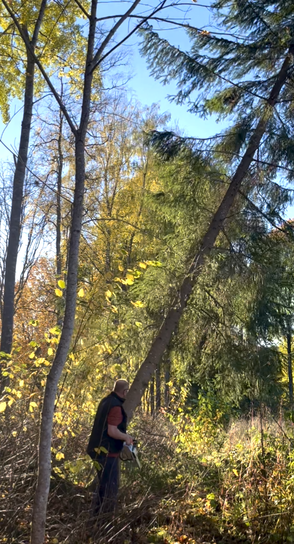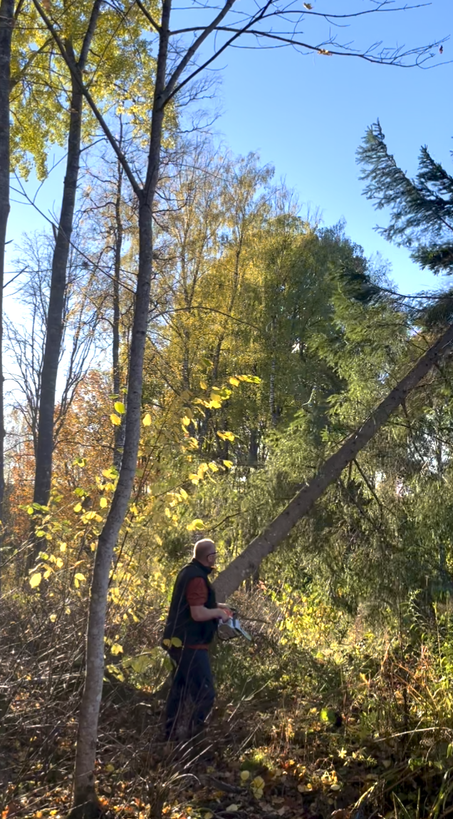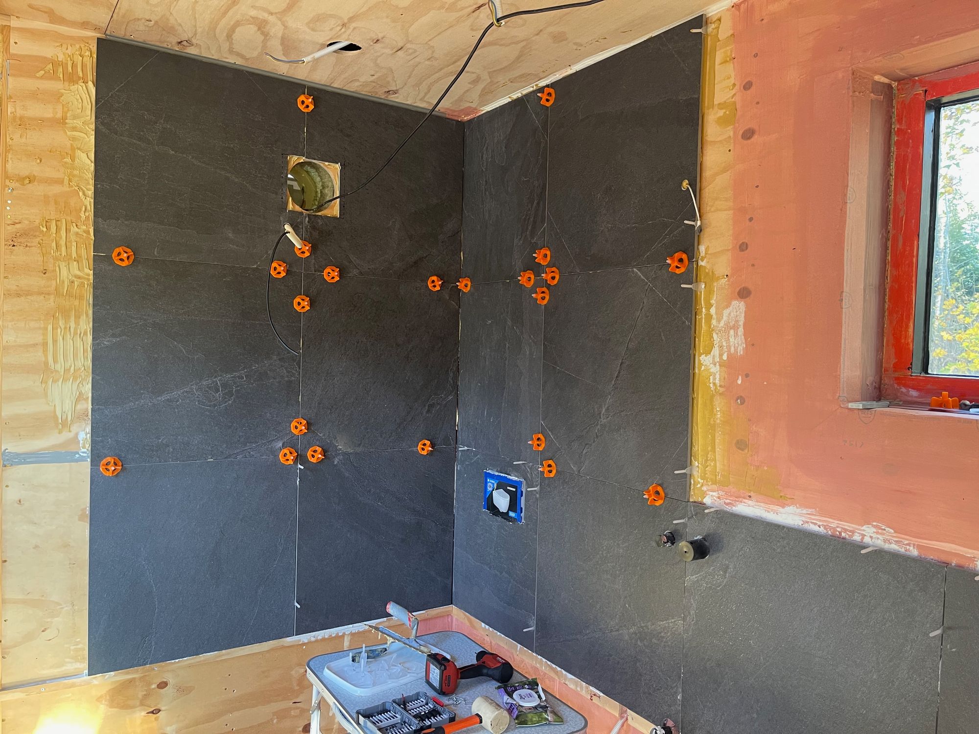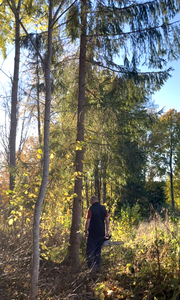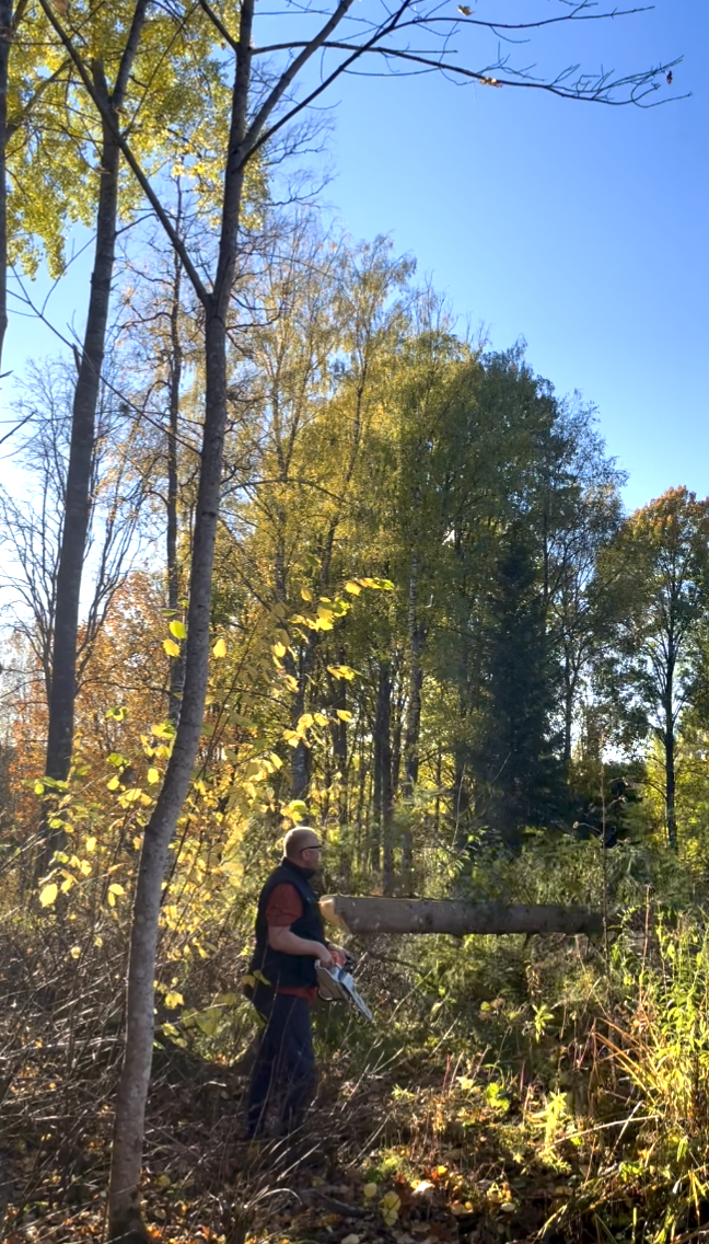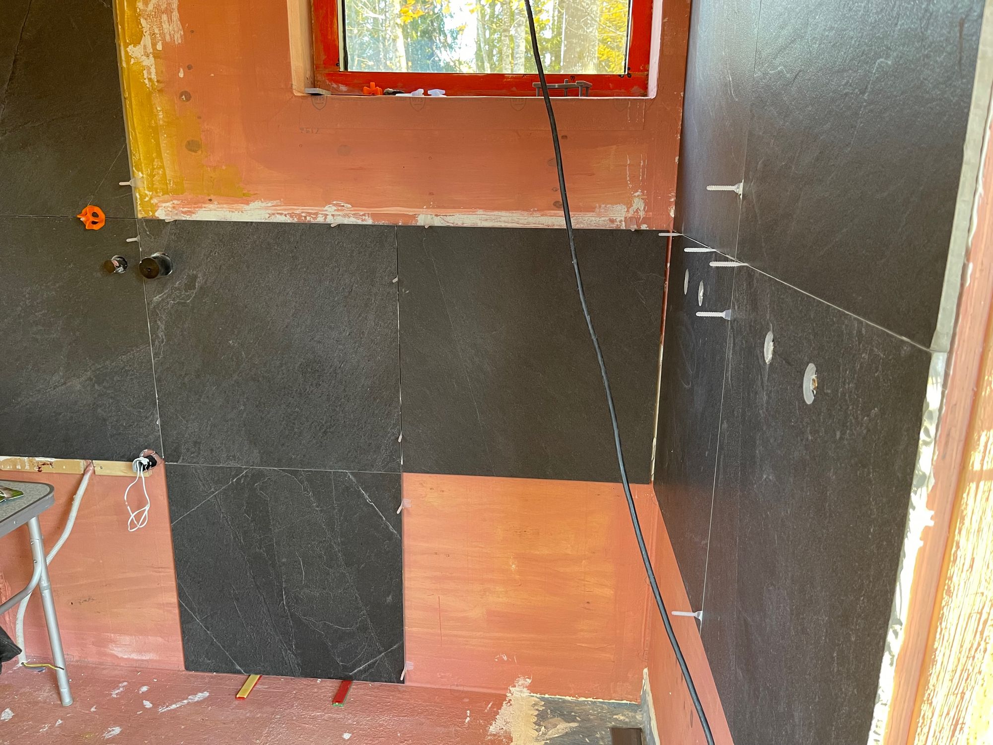 Vandaag gaan we - hoe verrassend - verder met tegelen. Er zijn een paar lastige tegels zoals bij het toilet en de kraan van de wastafel die heel precies gezaagd moeten worden. Omdat ik daar niet zoveel bij kan helpen, ga ik met de bosmaaier en de kettingzaag aan de slag om de oprit netjes te maken en me een tijdje met forest management bezig te houden.