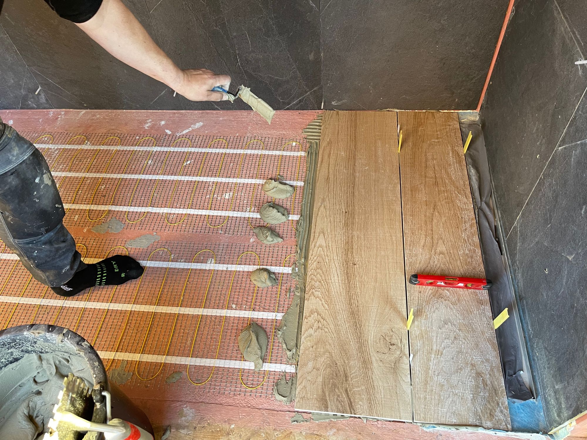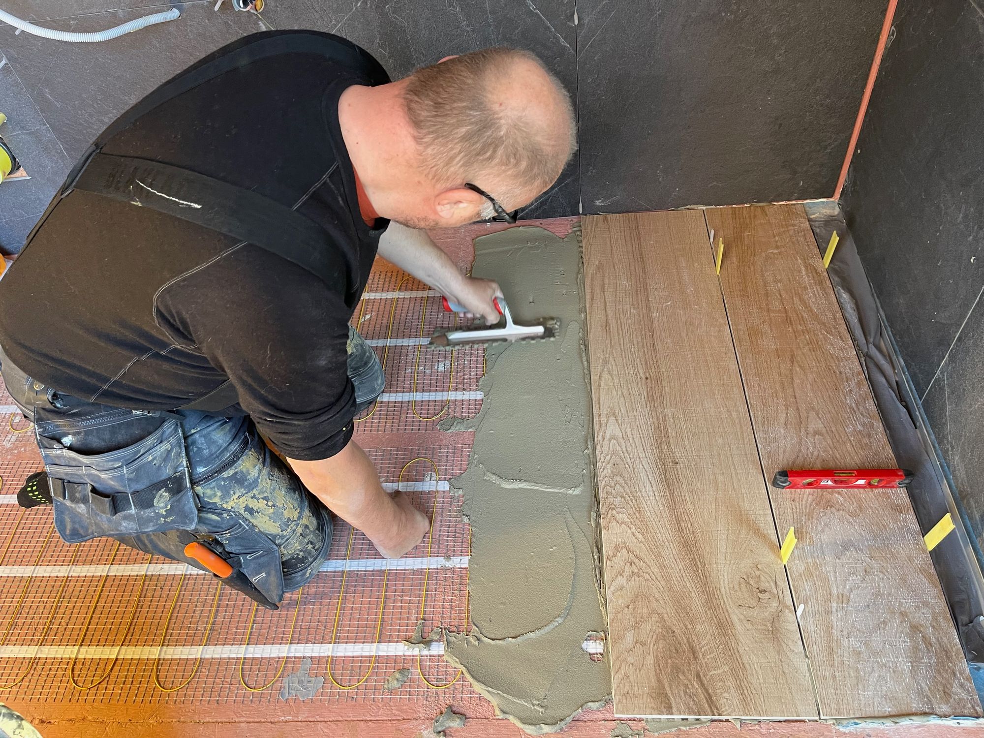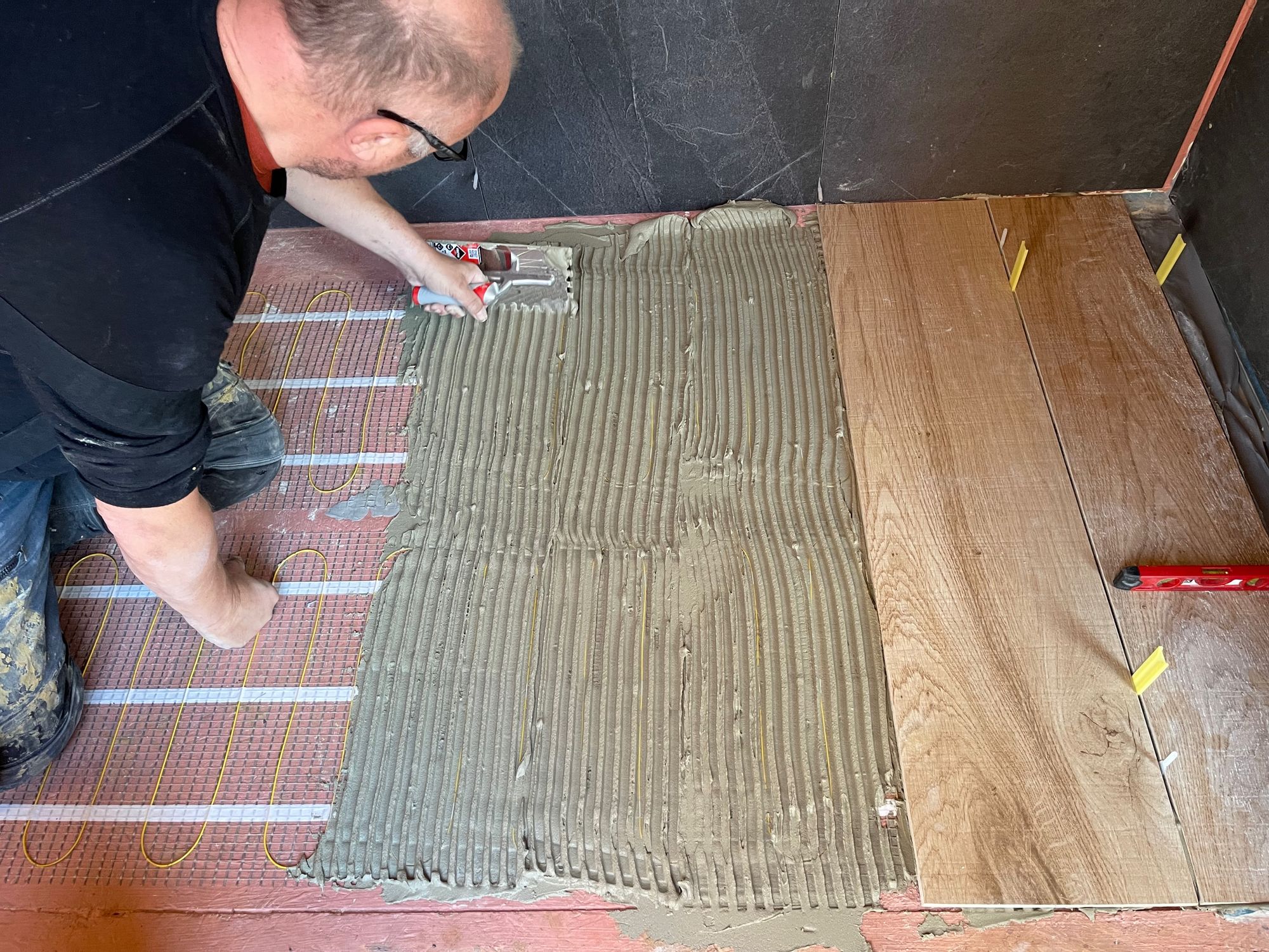 Vandaag is het tijd voor de vloertegels. Omdat we hebben besloten om ze in de breedte te leggen, hoeven we maar weinig te zagen en het leggen gaan dan ook razend snel.