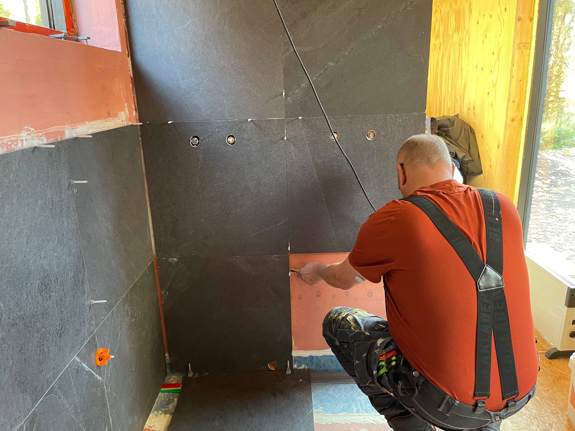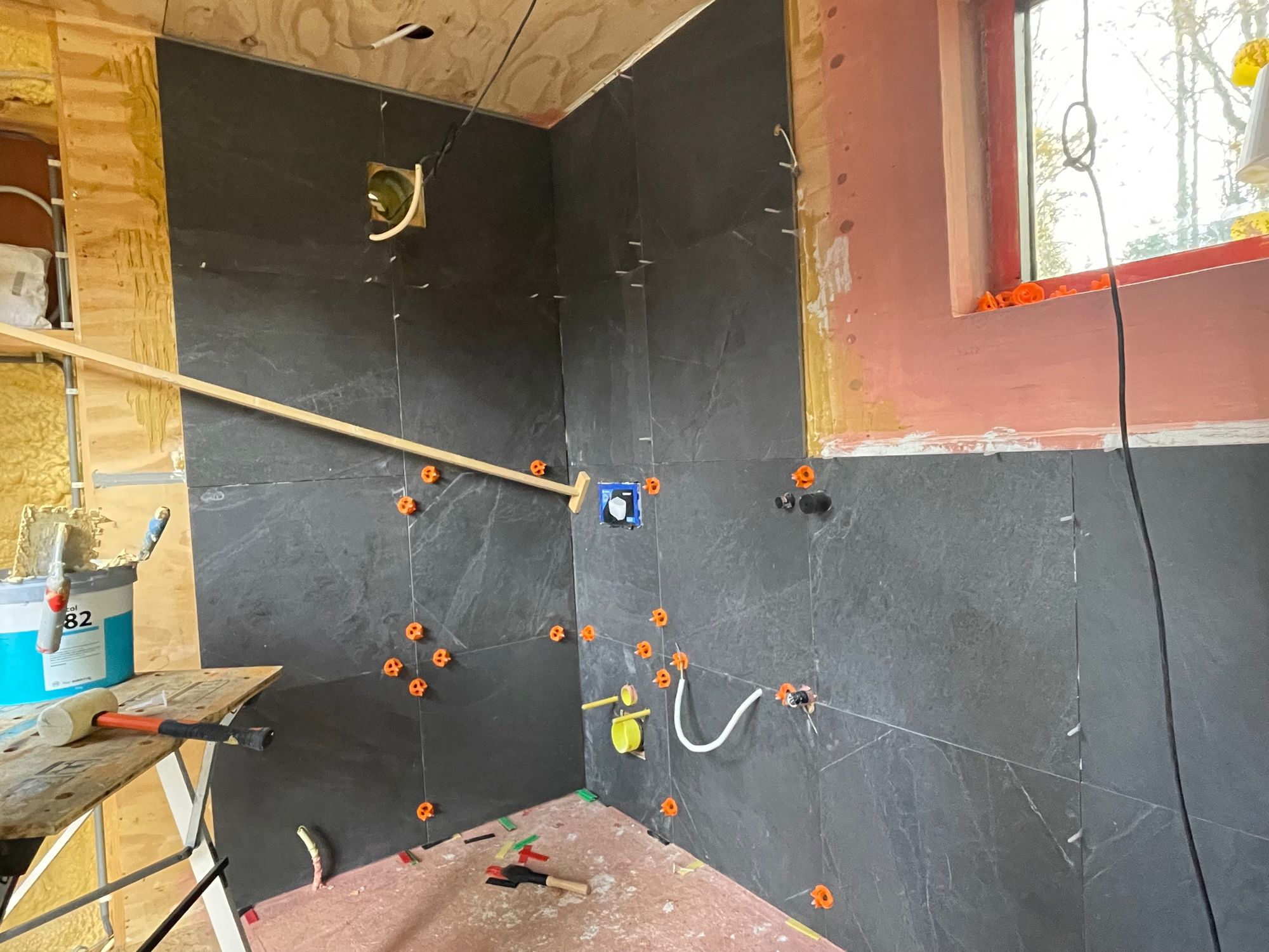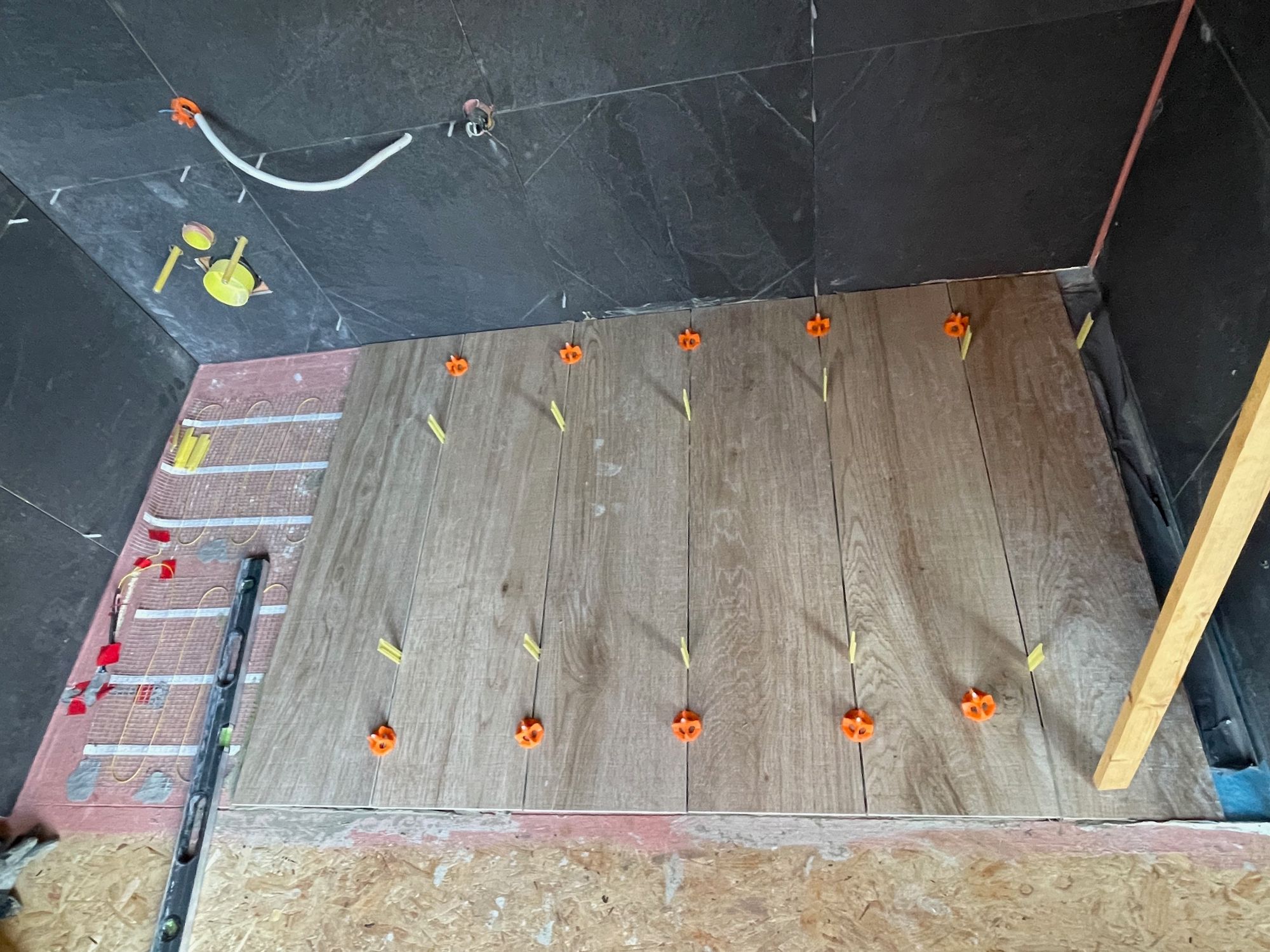 Vandaag is het tijd voor de vloertegels. Omdat we hebben besloten om ze in de breedte te leggen, hoeven we maar weinig te zagen en het leggen gaan dan ook razend snel.
