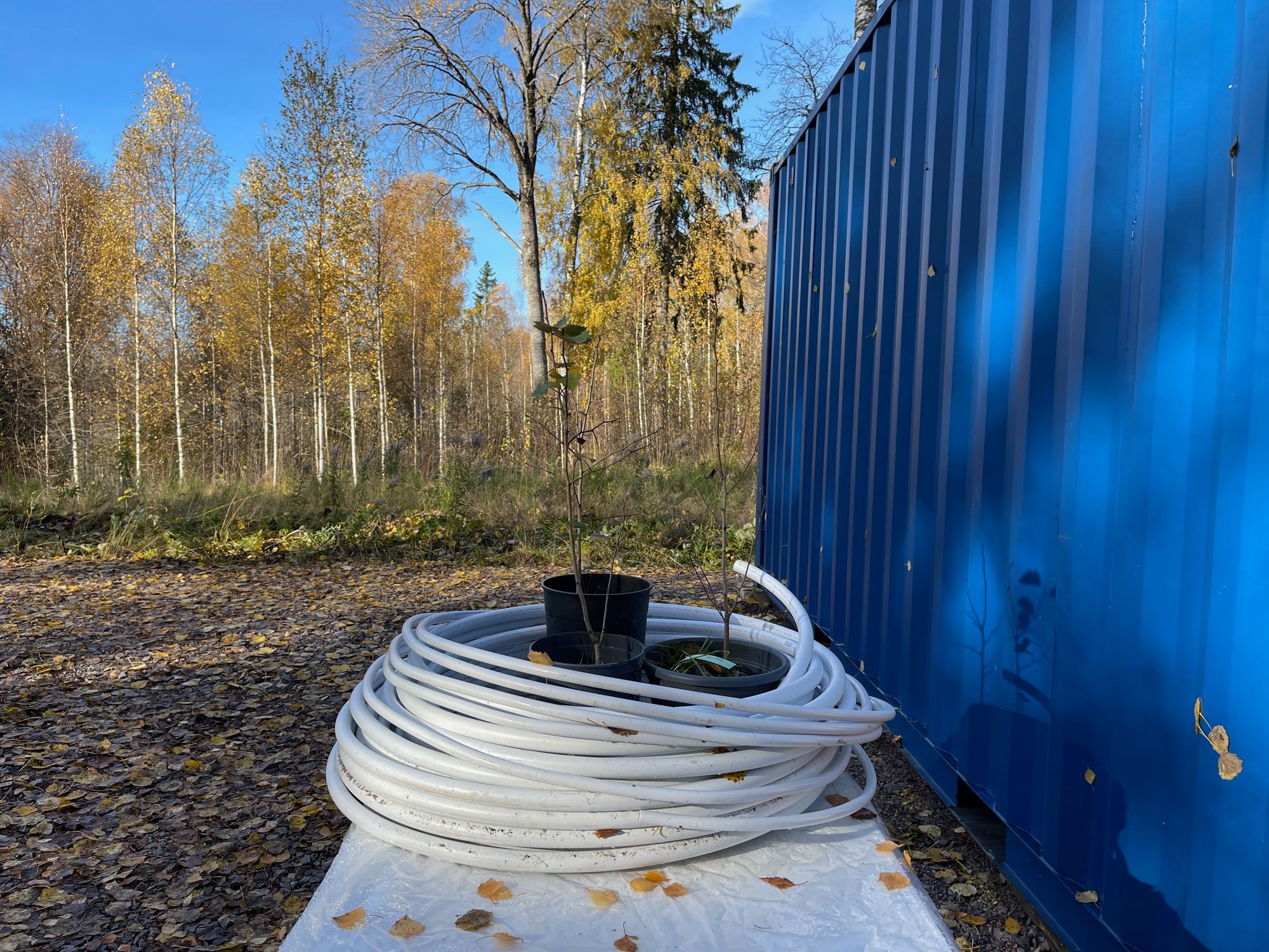 Tussen de middag gaan we naar Gunilla die ons meeneemt naar de kantine van de hogeschool in Molkom. We rijden met haar mee in haar elektrische auto. In de kantine is het best druk, Gunilla legt uit dat ook werklui in de omgeving hier komen schaften omdat het eten zo goed is. En inderdaad, we hebben een heerlijke warme middag maaltijd. De terugweg is iets langer dan de heenreis want Gunilla maakt van de gelegenheid gebruik om ons ook een beetje van de omgeving te laten zien. Weer terug bij haar huis, laat ze ons haar voedselopslagkelder zien. Een half ondergronds kelder waar ze haar eigen verbouwde wortelen en aardappelen opslaat. Wij vertellen haar dat we een appelboom hebben geplant en hopen dat de bijen in de toekomst voor de bevruchting kunnen zorgen. Dit is aanleiding voor Gunilla om ons van 3 boompjes te voorzien die ze zelf had willen planten, maar waar ze helemaal geen tijd voor heeft - zegt ze... Ook krijgen we nog een grote pot honing mee en bepakt, bezakt en voldaan wandelen wij terug naar onze containers.