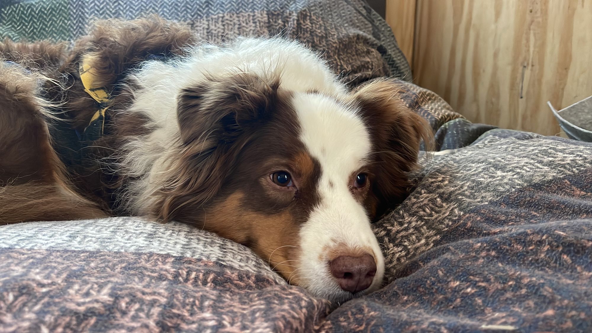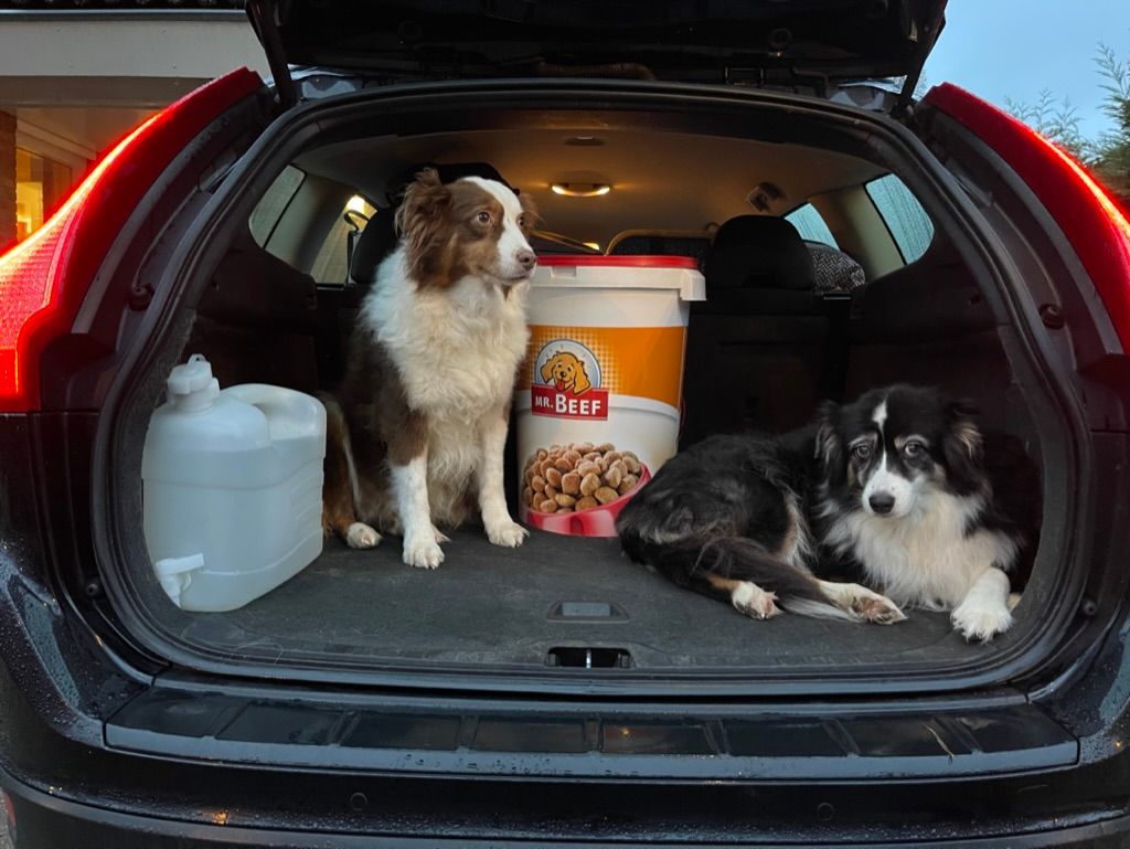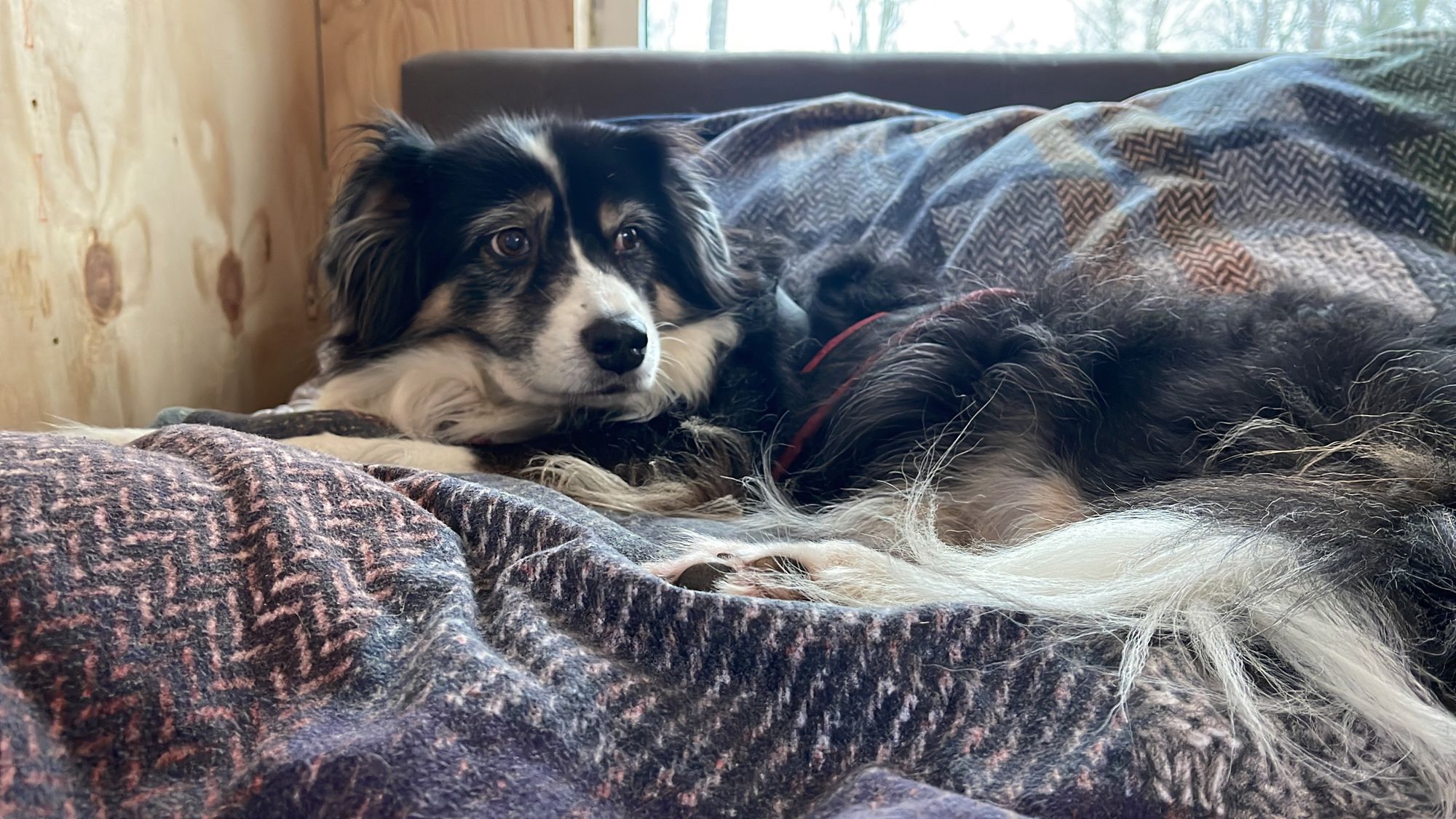 Het begint echt kouder te worden en er is ook een klein laagje sneeuw gevallen. Ook al vinden de honden het prima in de auto, wij vinden dat ze toch echt binnen moeten komen. Om te voorkomen dat ze ons bij het klussen voor de voeten lopen (wat natuurlijk onvermijdelijk is in een ruimte van 15m2) besluiten we dat ze op bed mogen liggen, onder het thermopaneel dat lekker staat te stralen. Ze genieten er zichtbaar van en ik ben benieuwd of we ze ooit nog van het bed af kunnen krijgen.
