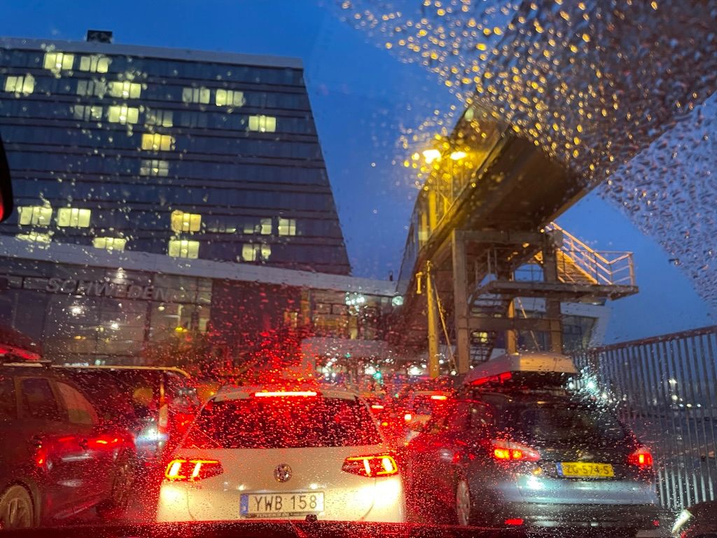 Na een goede nachtrust komen we om 9.15 uur aan in Göteborg. Zo soepel als het ging om aan boord te komen, zo langzaam gaat het van boord gaan. Het duurt ruim een uur om door de douane te komen en de reden waarom dit is, is voor ons totaal niet duidelijk. Nu is een uur op een mensenleven natuurlijk helemaal niets maar...... Myla en Jillz zijn tijdens de overtocht in de auto gebleven en we willen ze nu graag zo snel mogelijk uitlaten. Uiteindelijk besluiten we in de wachtrij de honden eruit te laten. Nergens een sprietje gras te bekennen, maar daar nemen de dames gelukkig genoegen mee.