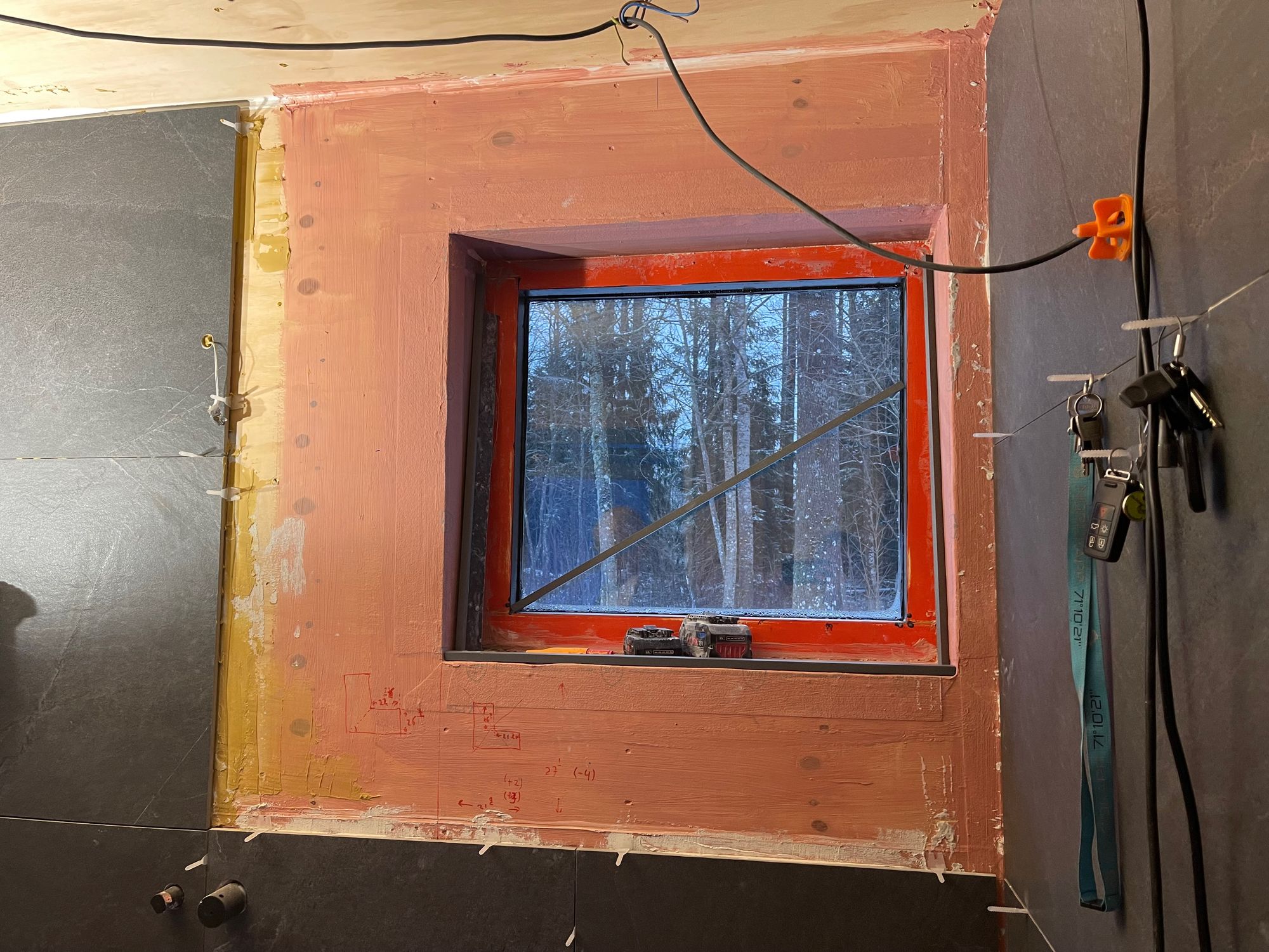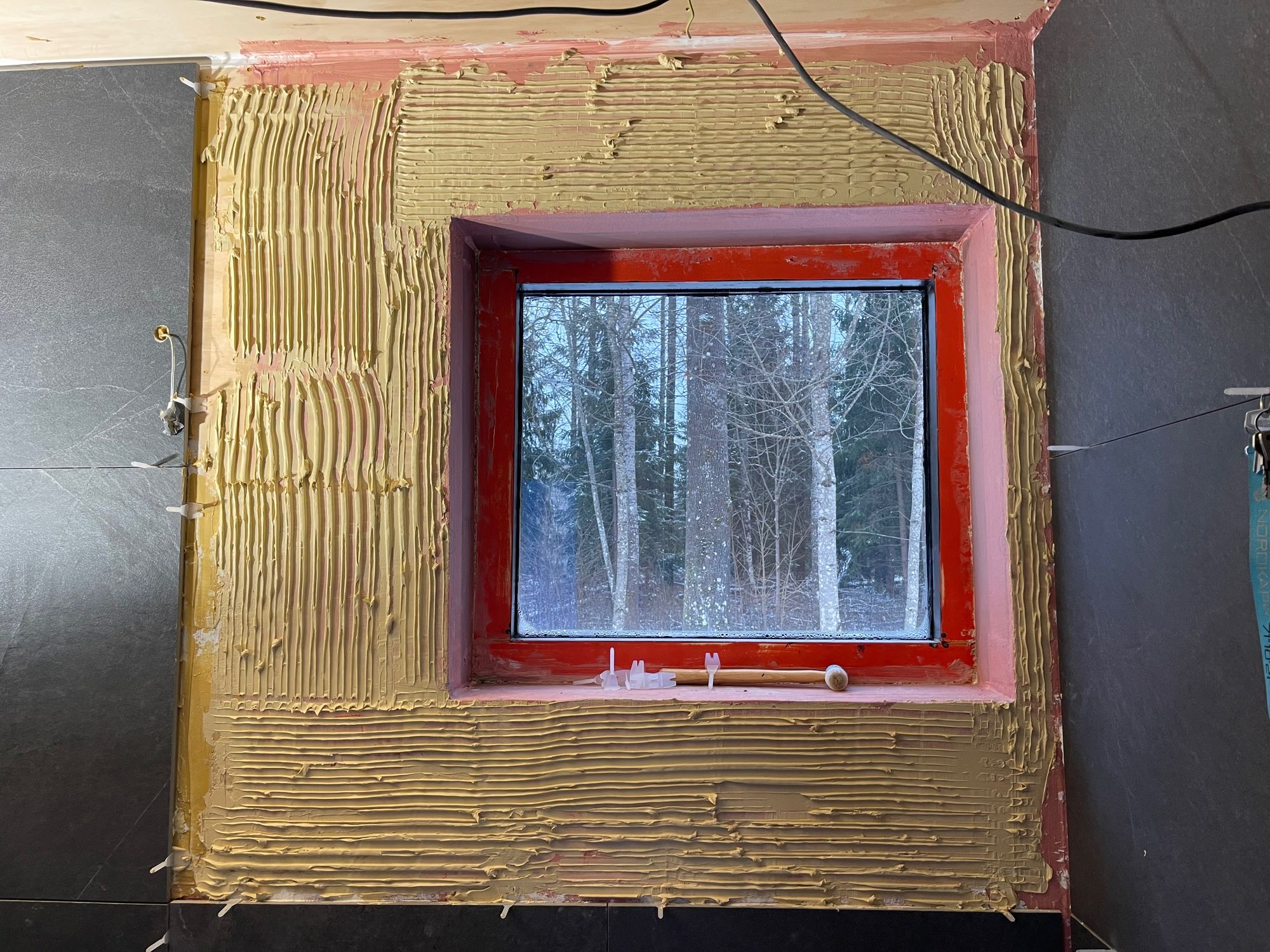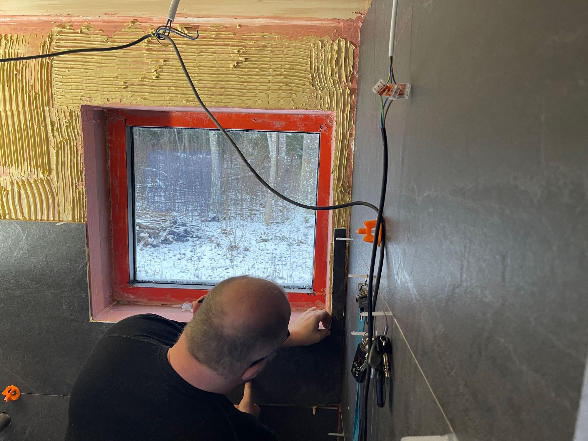 In de badkamer zijn nog 4 wandtegels rondom het raam die geplaatst moeten worden. Vandaag zaagt Remco ze op maat en voor je het weet ....... is het daglicht weer weg en stoppen we met klussen. Ik denk dat ik heel goed kan wennen aan die korte dagen ;-)