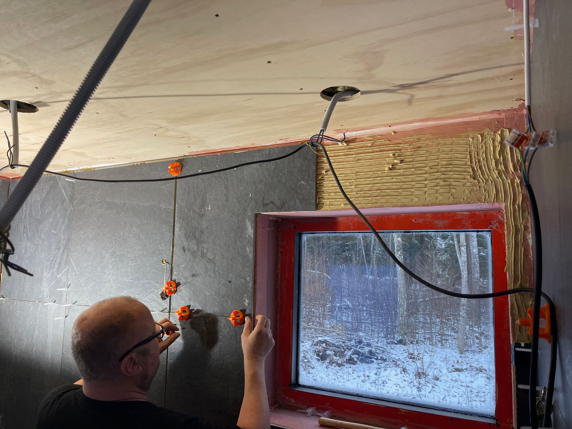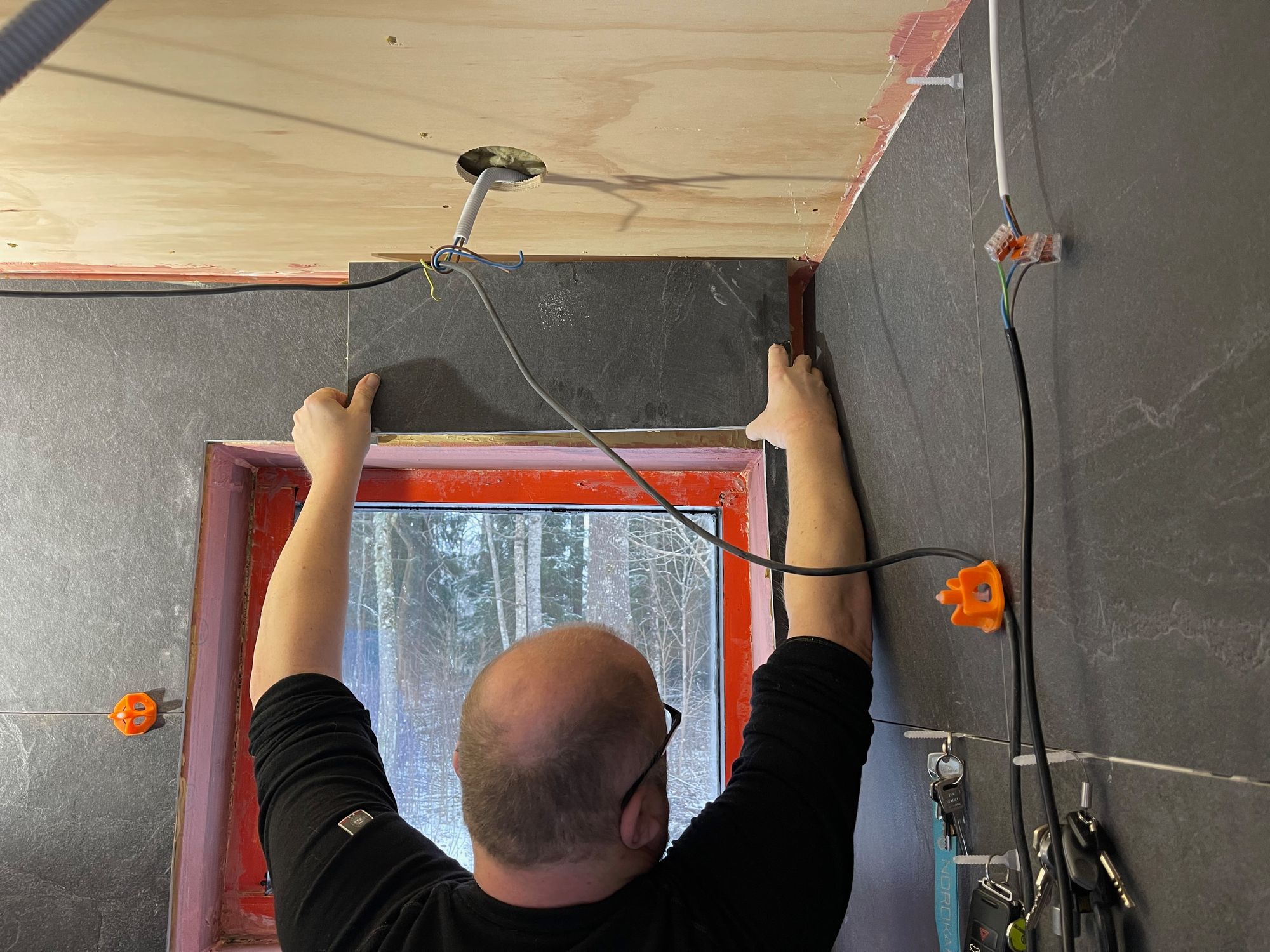 Tijdens ons vorige bezoek hadden we de vloertegels in de badkamer gelegd met uitzondering van de laatste. Dus die leggen we - nu de rest van de vloer droog is - nog even snel op zijn plaats. En vandaag koppelen we de spotjes aan de elektriciteit in het plafond. Dit is een tijdelijke voorziening want er moeten nog gipsplaten tegen het plafond en de lichtbronnen hebben we ook nog niet (wordt het Hue of toch een Ikea spot??).