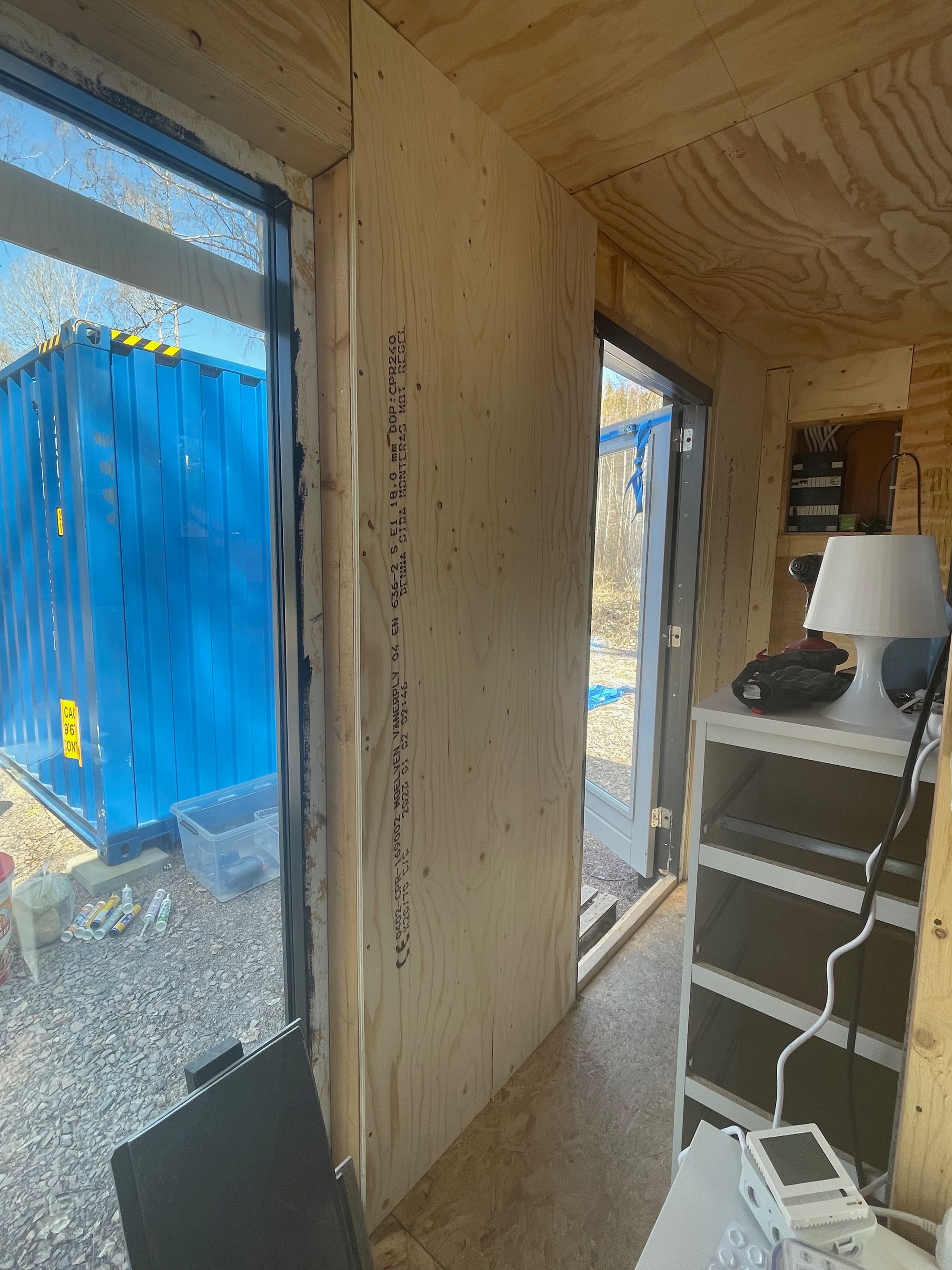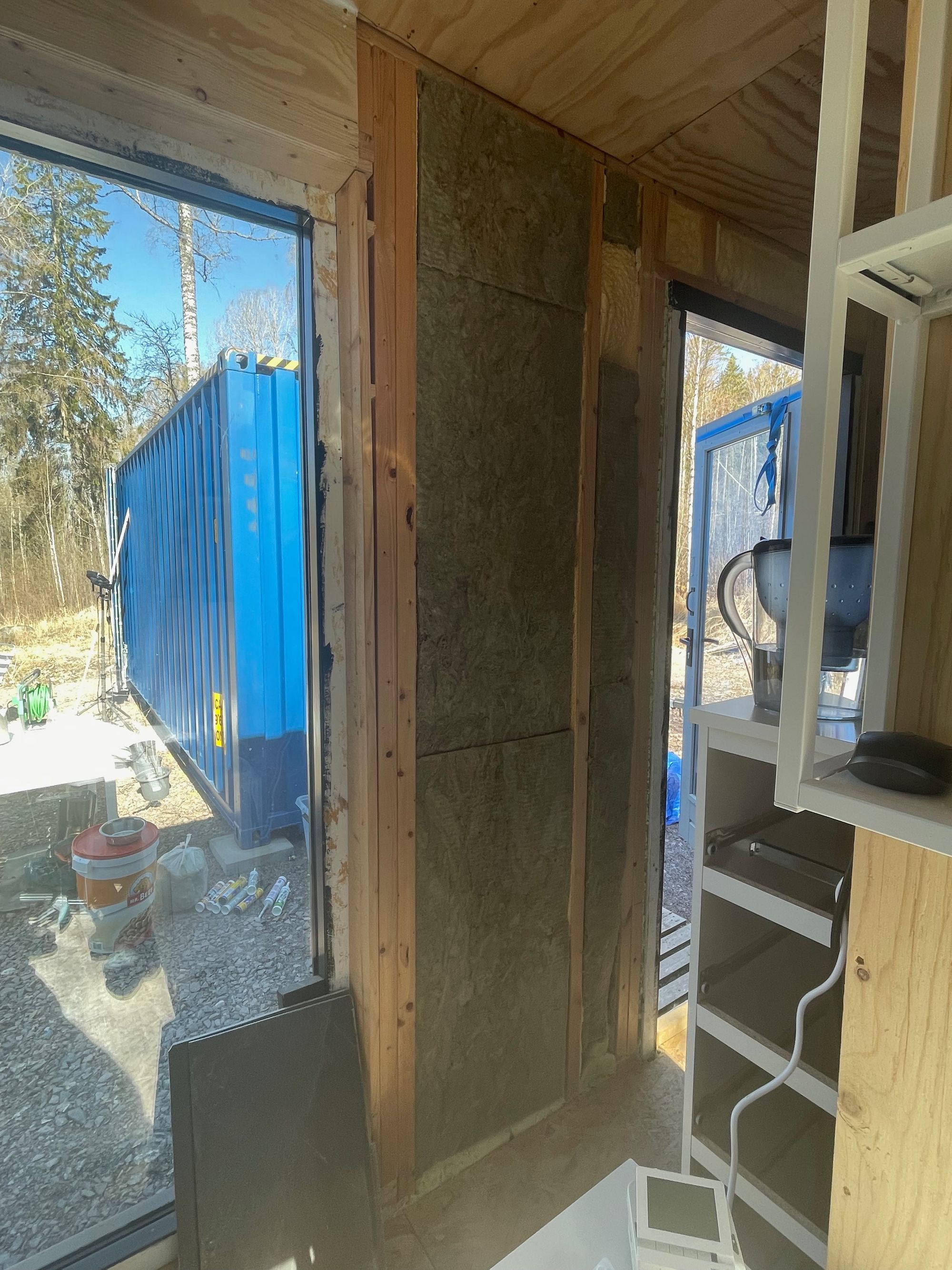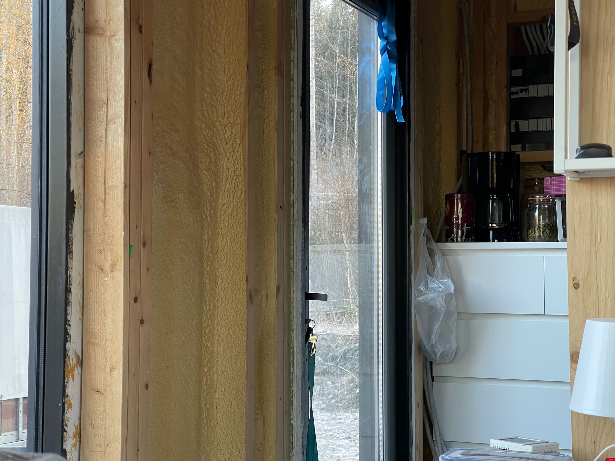 Nog zo'n klusje dat al een tijdje lag te wachten: aftimmeren van wanden rondom de deur. We hadden niet meer genoeg platen de vorige keer dus vandaar dat de klus is blijven liggen, we halen platen op bij de XXL Bygg in Karlstad en gaan aan de slag. Ik hijs me weer in mijn maanmannetjespak om de rockwool te plaatsen, Remco zaagt de platen op maat en bevestigt ze.