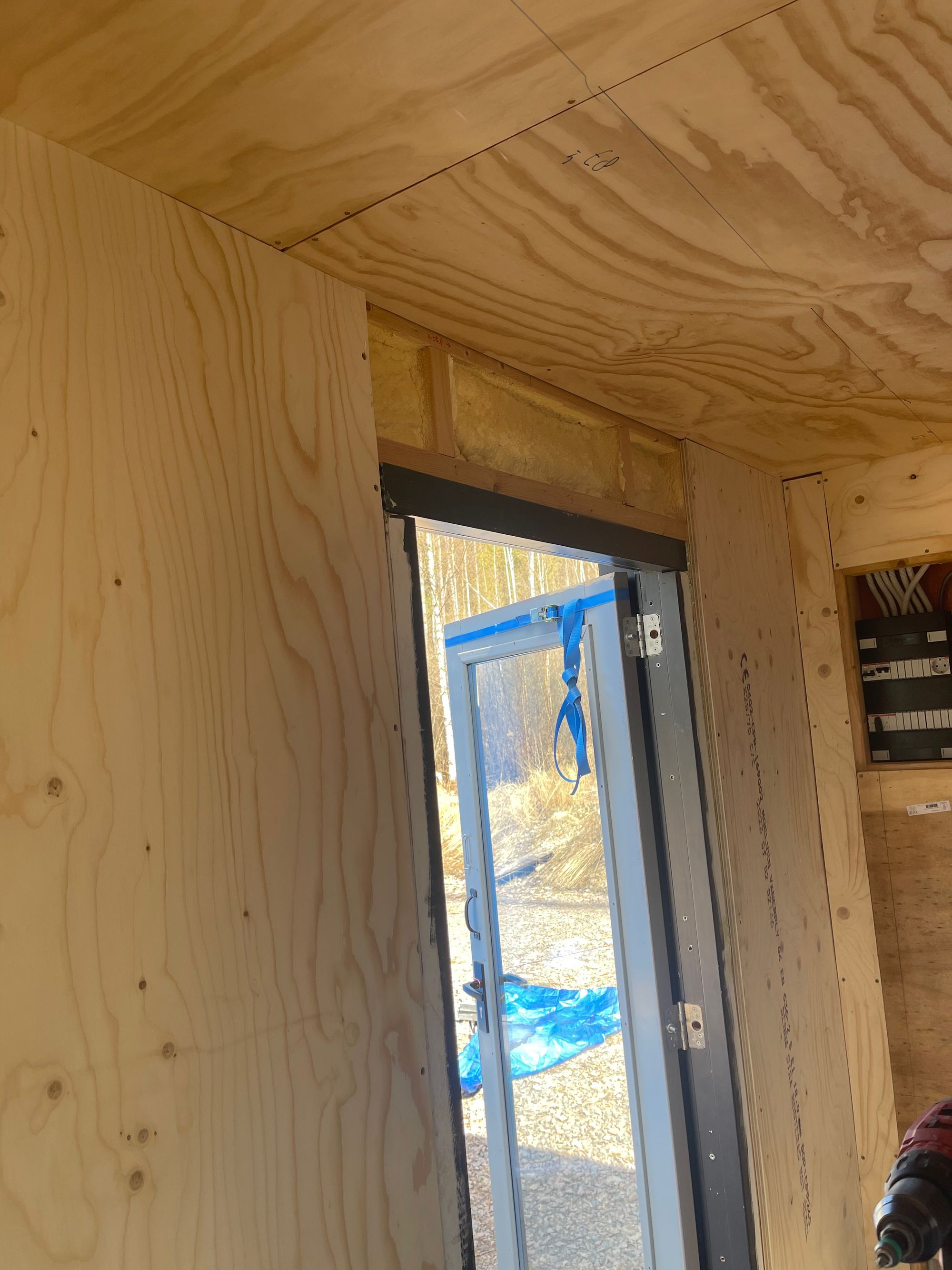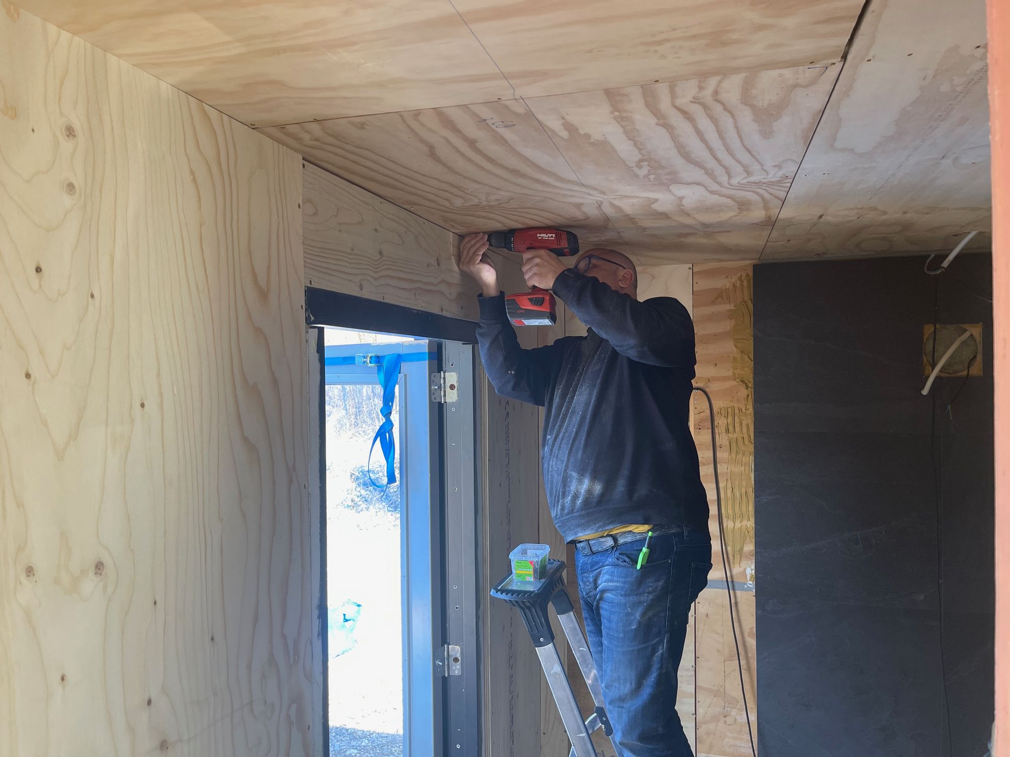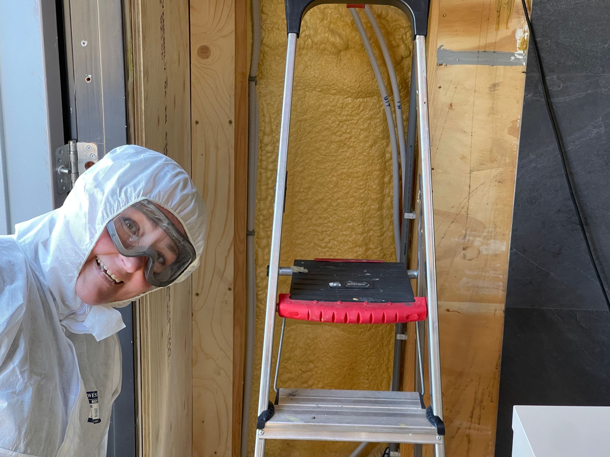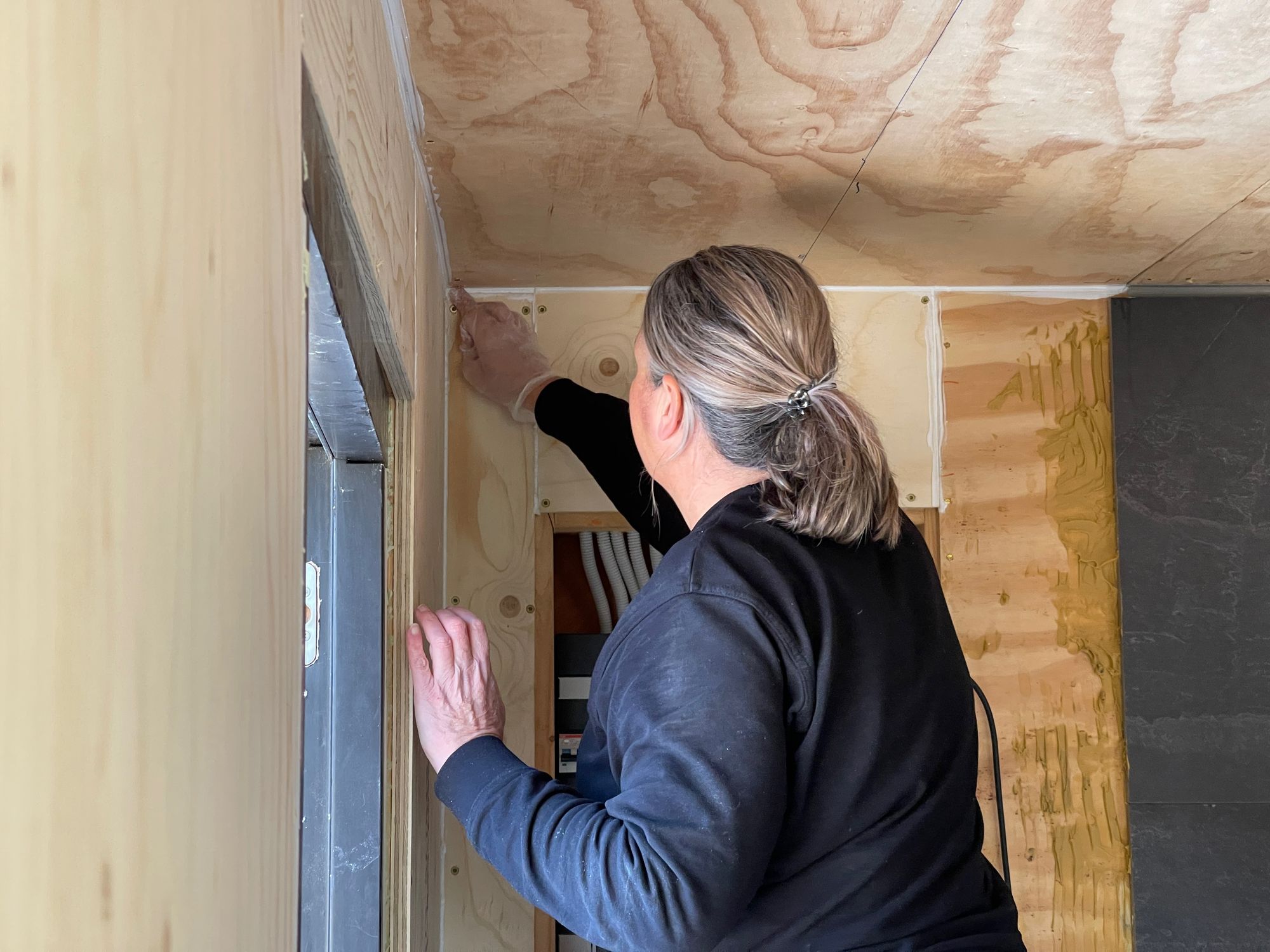 Nog zo'n klusje dat al een tijdje lag te wachten: aftimmeren van wanden rondom de deur. We hadden niet meer genoeg platen de vorige keer dus vandaar dat de klus is blijven liggen, we halen platen op bij de XXL Bygg in Karlstad en gaan aan de slag. Ik hijs me weer in mijn maanmannetjespak om de rockwool te plaatsen, Remco zaagt de platen op maat en bevestigt ze.
