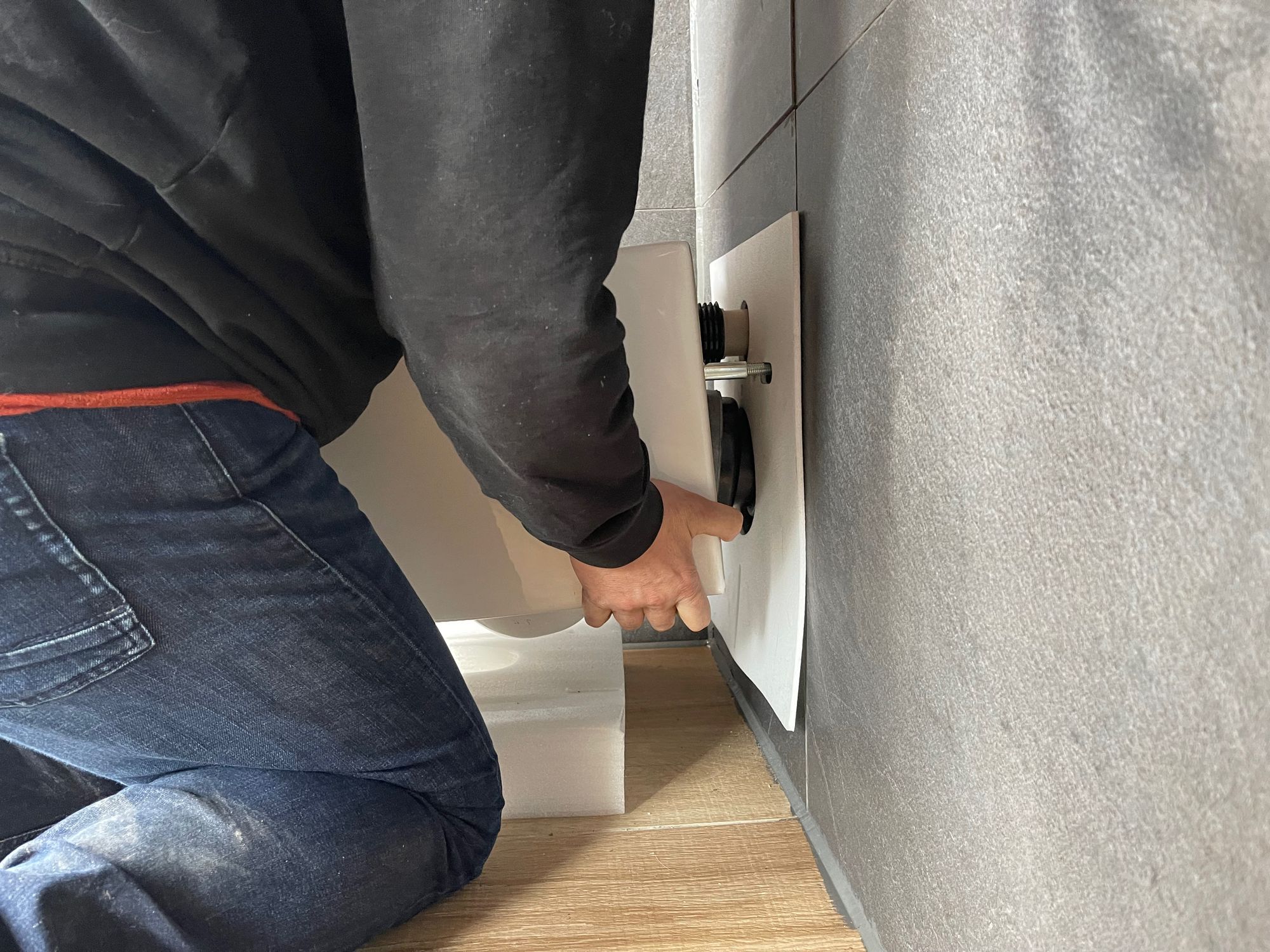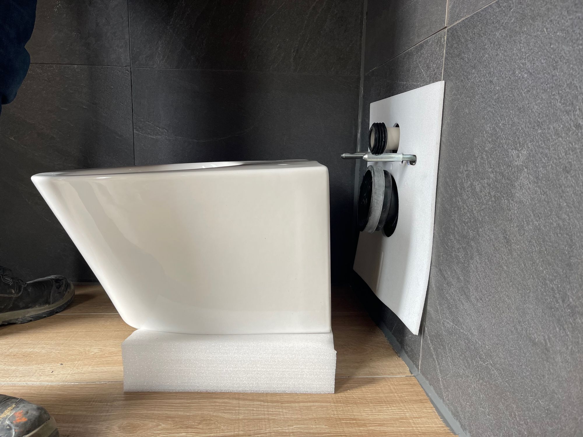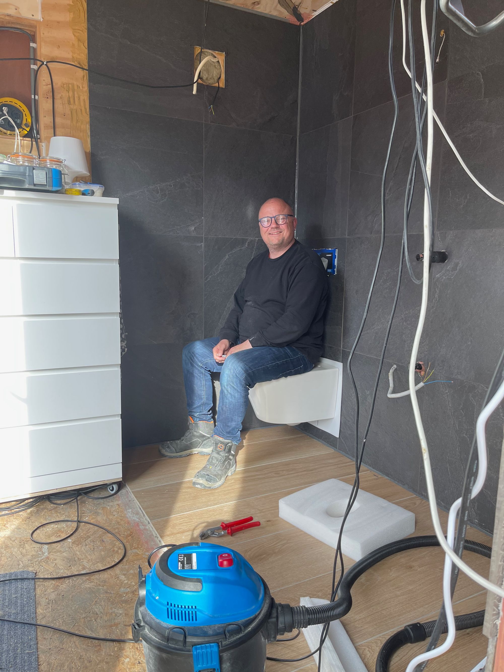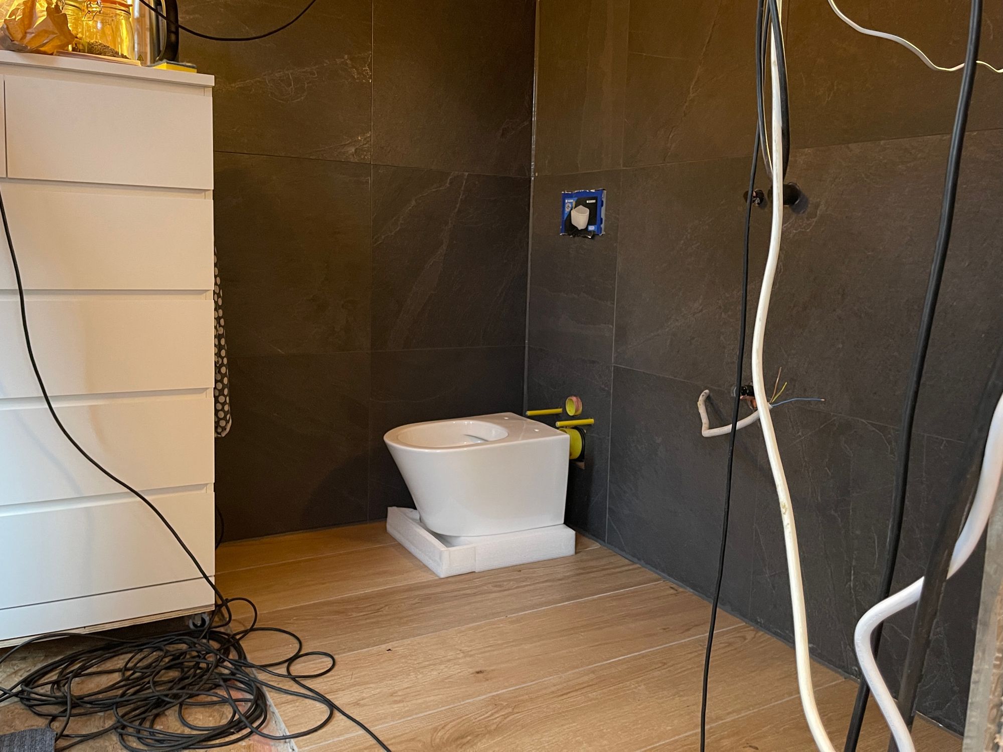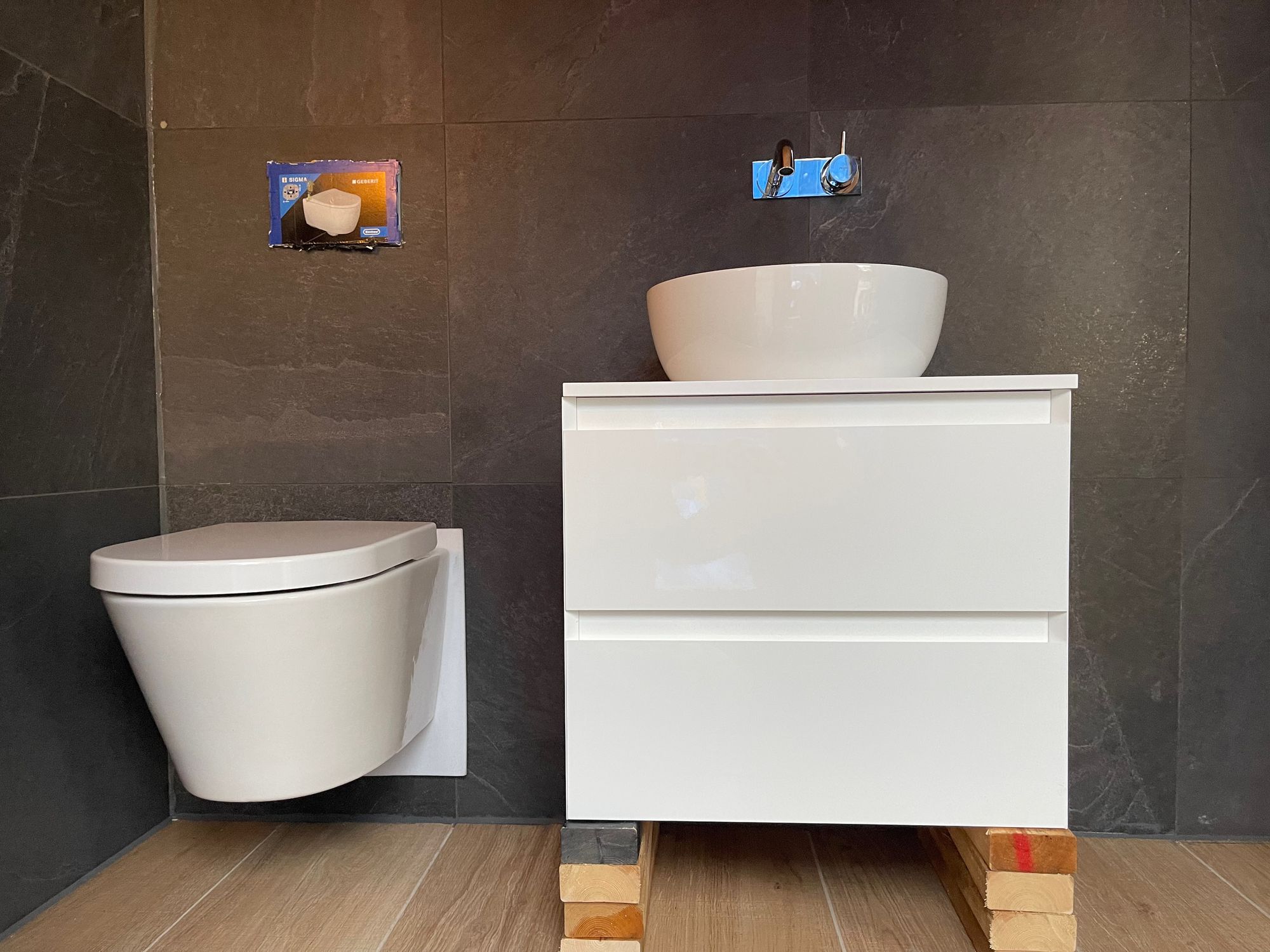 Het einde van ons verblijf komt in zicht. De laatste klus die we oppakken is het ophangen van de WC. En voor het oog zetten we het badkamermeubel op z'n plek.