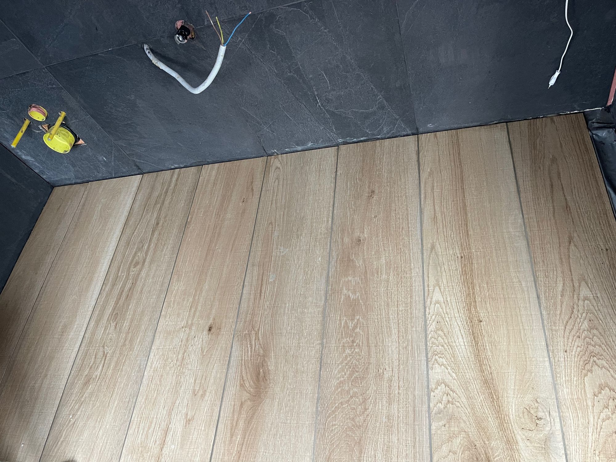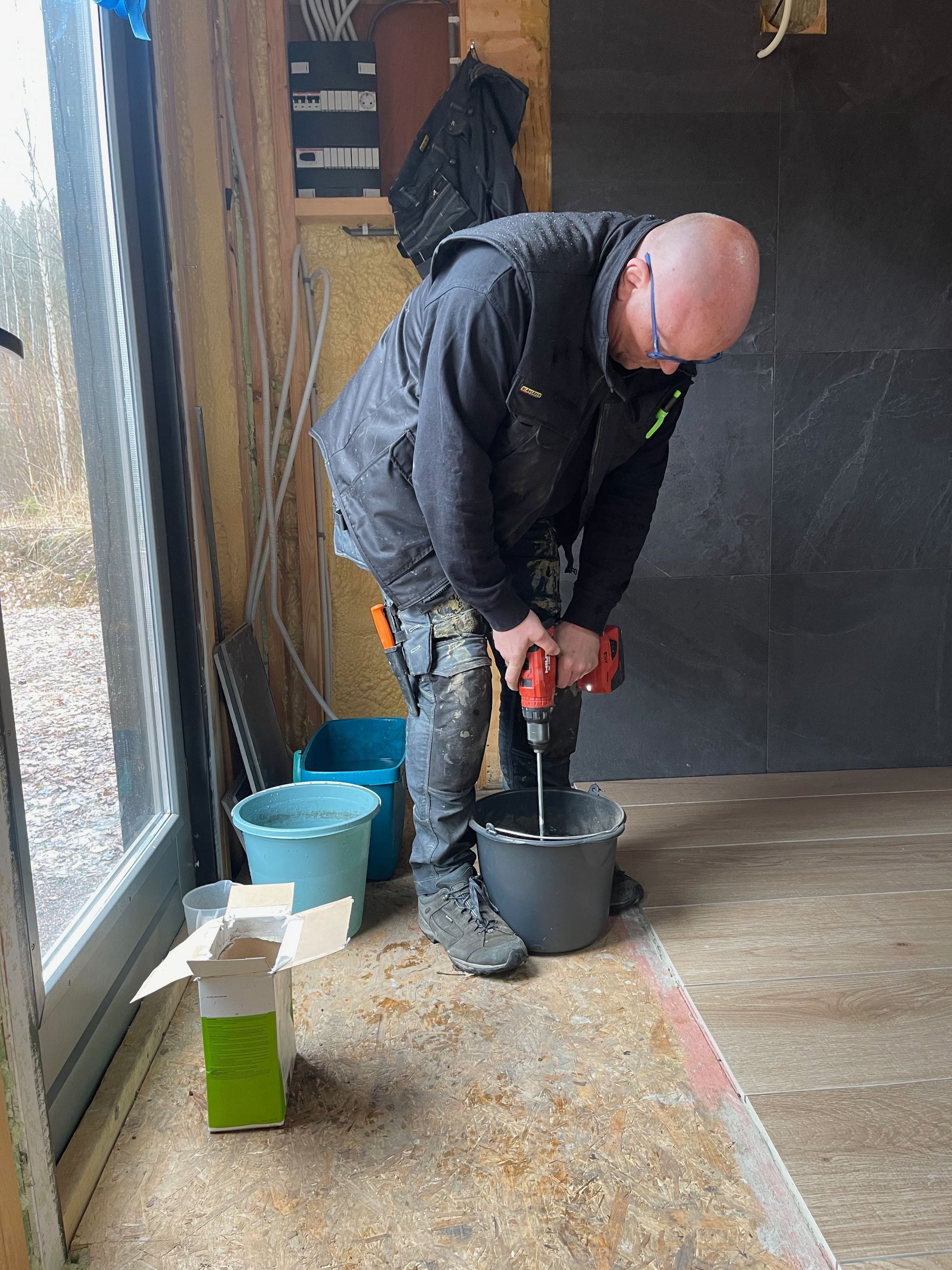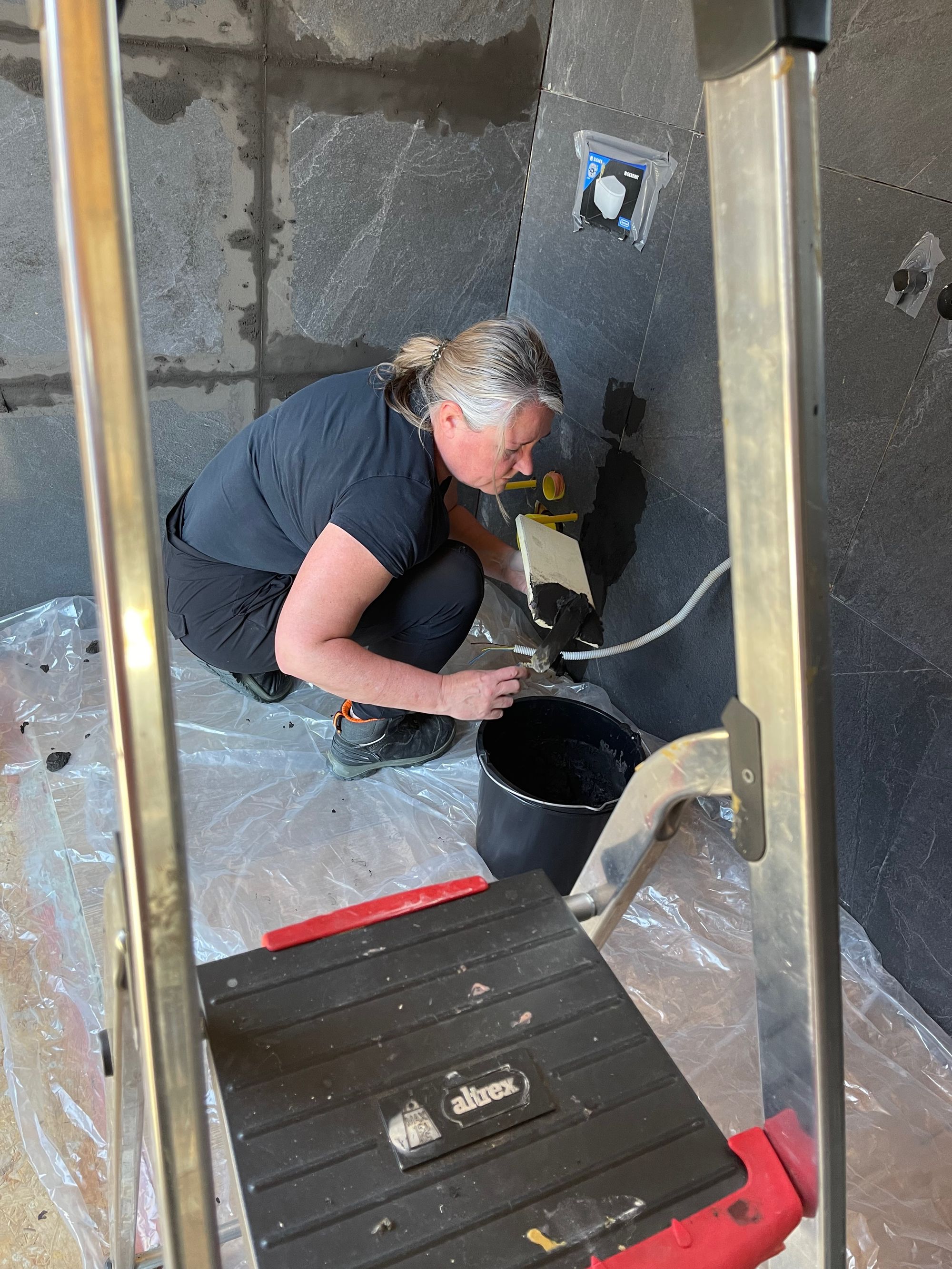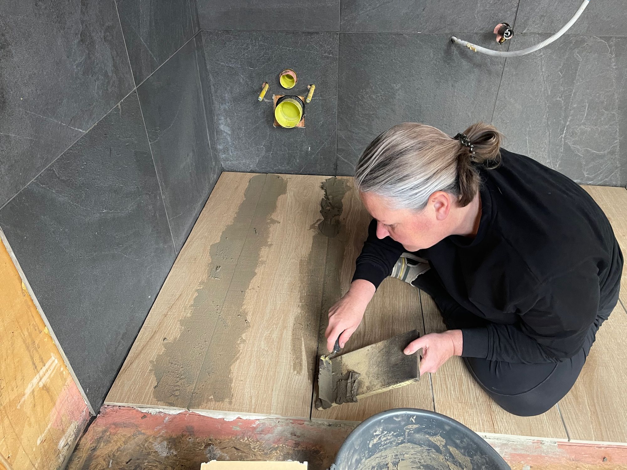 Nu de wandtegels klaar zijn, gaan we gelijk verder met het voegen van de vloer.
