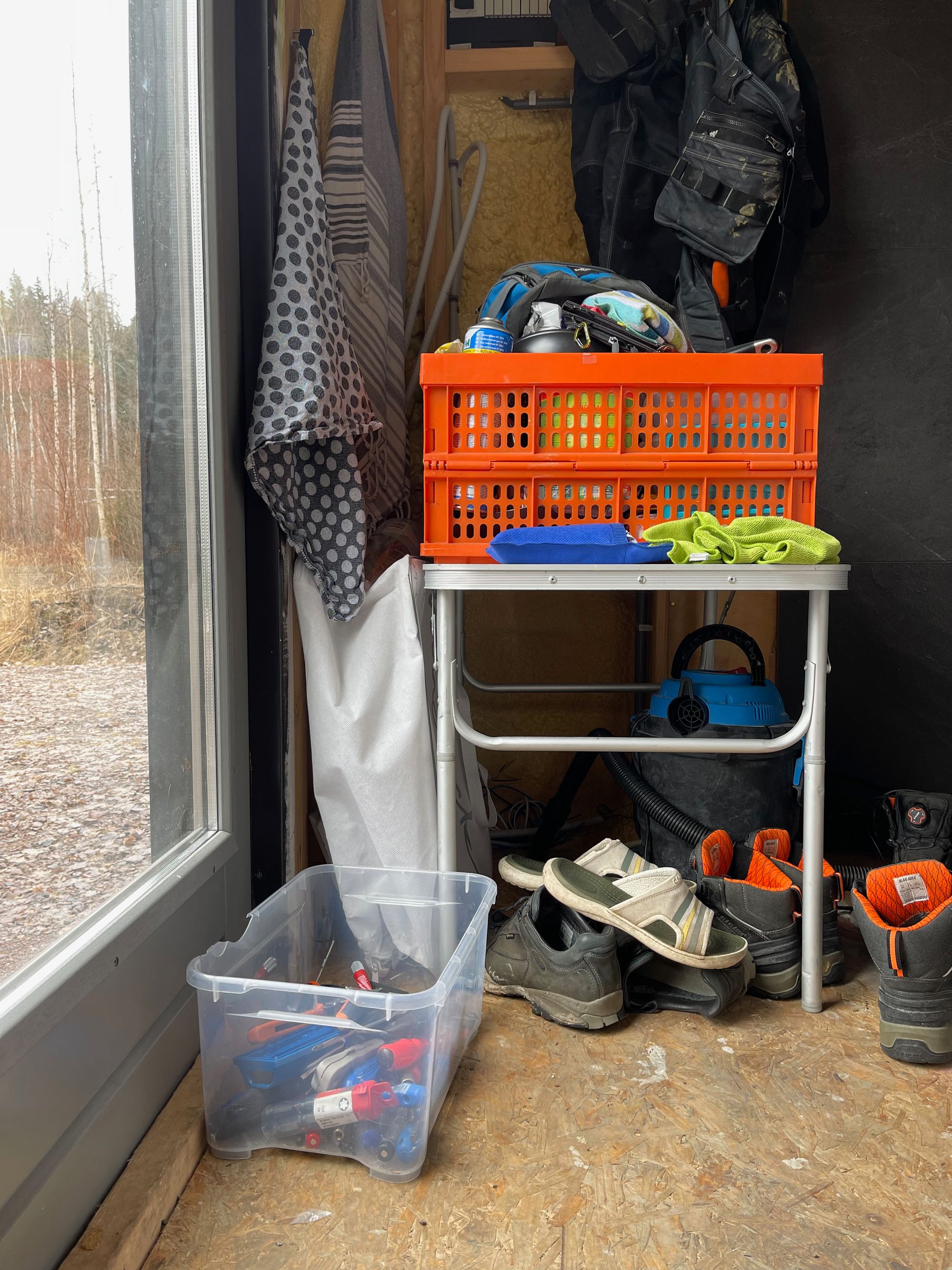 We zijn inmiddels bijna een week in Zweden en nu de badkamer gevoegd is vinden we het zonde om de ruimte weer helemaal vol te zetten met allerhande dingen die je nu eenmaal zo om je heen verzamelt. Zo hadden we een wankel kampeertafeltje voor het koffieapparaat, waterkoker, waterkan, een krat met borden, kopjes en pannen. Verder nog bigshoppers met kleding (niet echt handig als je iets nodig hebt, want dat zit altijd onder in die tas). Kortom: troep!