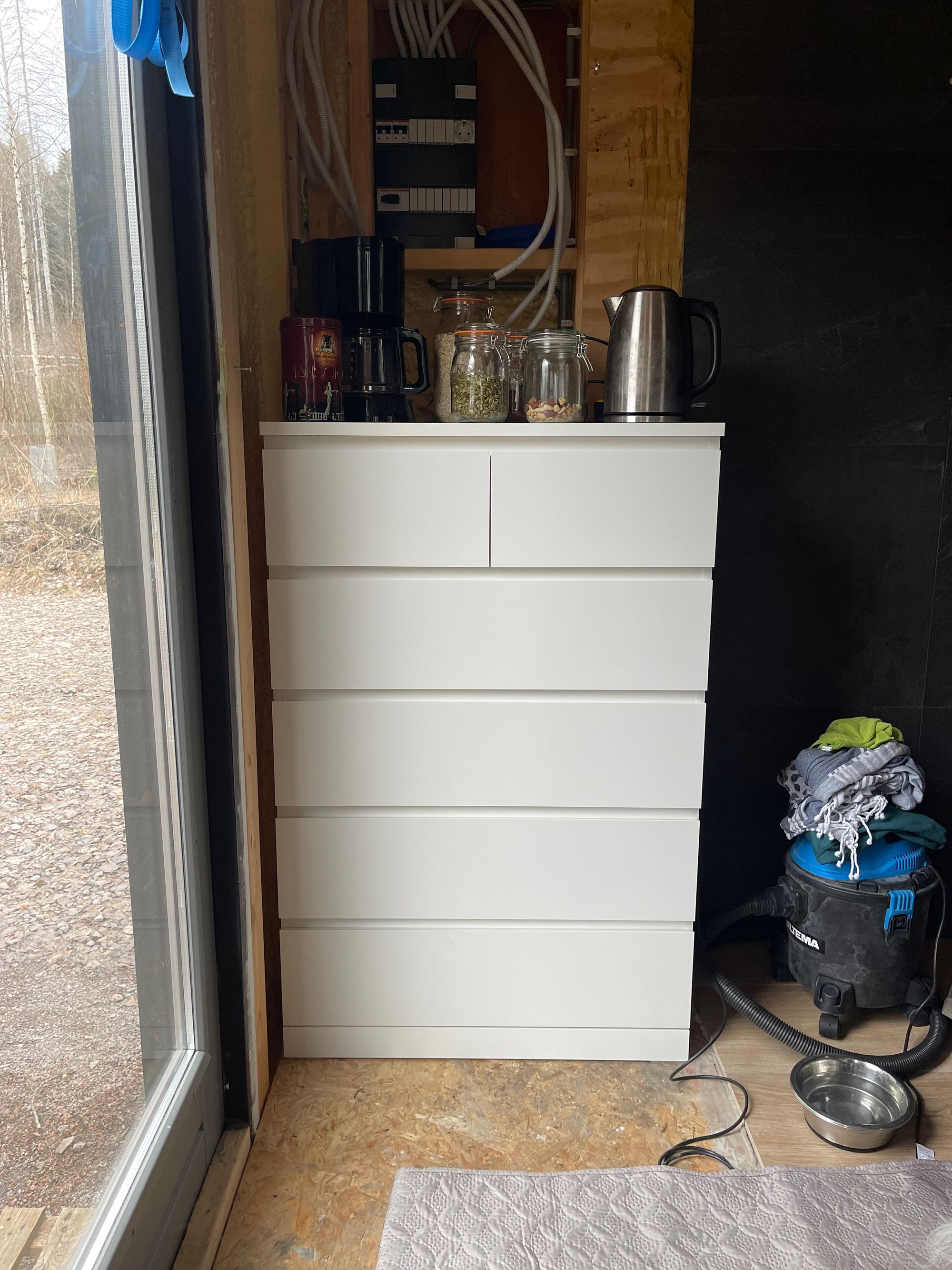 Bij de Ikea halen we een ladenkast die precies past op de plek naast de deur en onder de meterkast. Omdat we weten dat we de kast nog heel vaak van z'n plek moeten halen vanwege de meterkast erboven, maken we gelijk een "hondje" zodat verplaatsen makkelijker gaat. En in de kast ruimen we de kleding op, hebben we een lade met etenswaren en kunnen we ook de keukenspullen kwijt. Blij mee!
