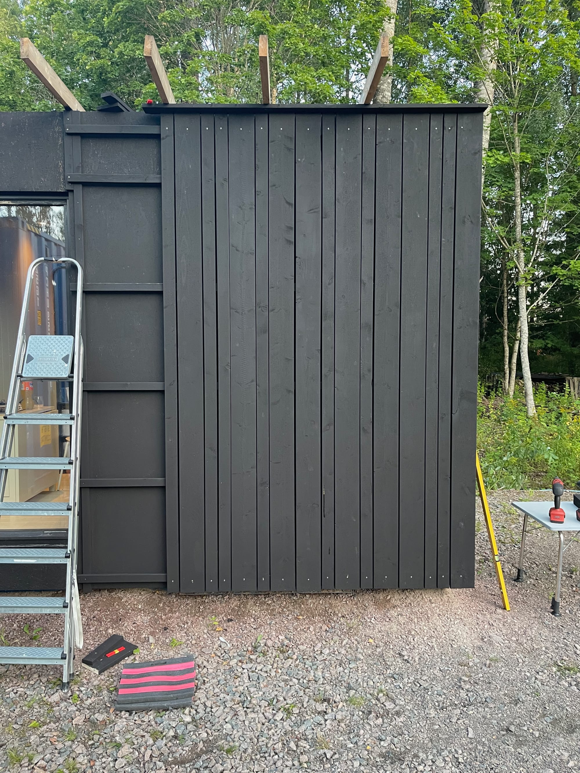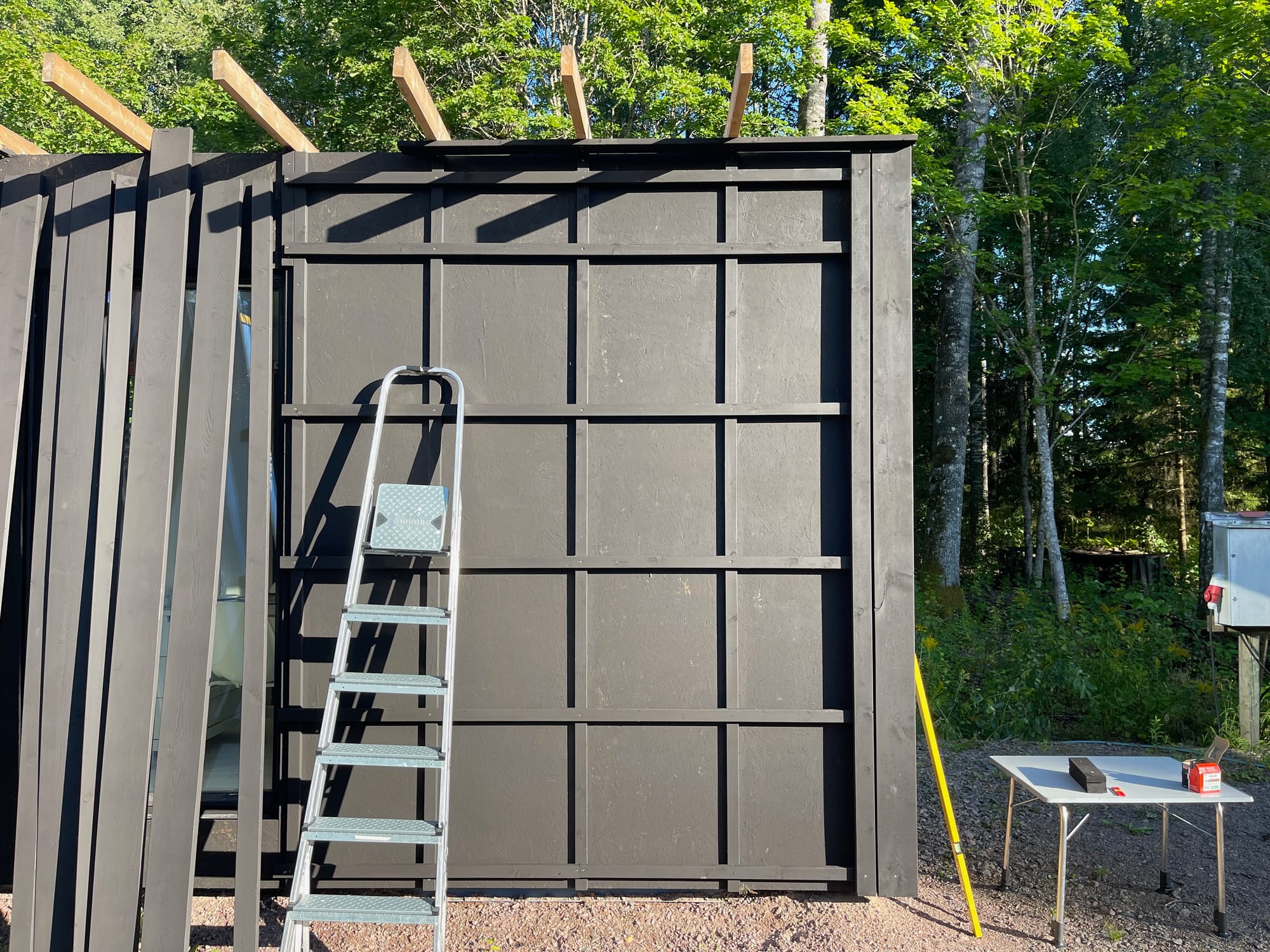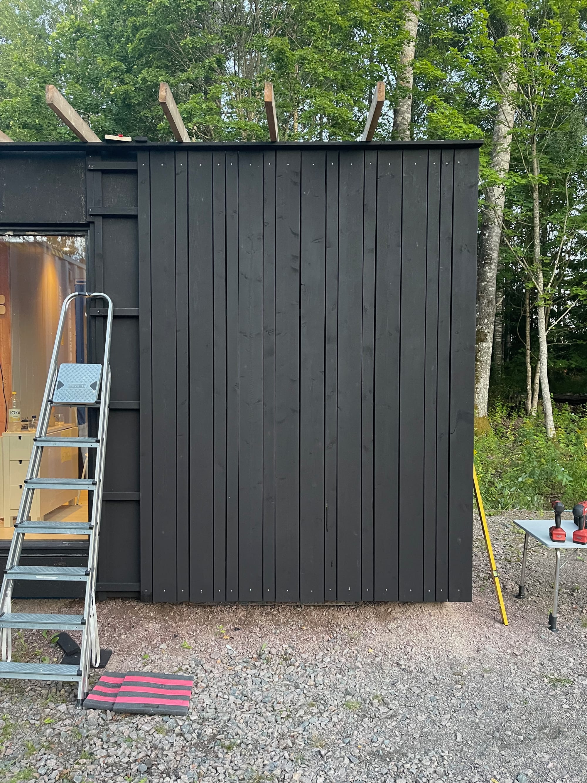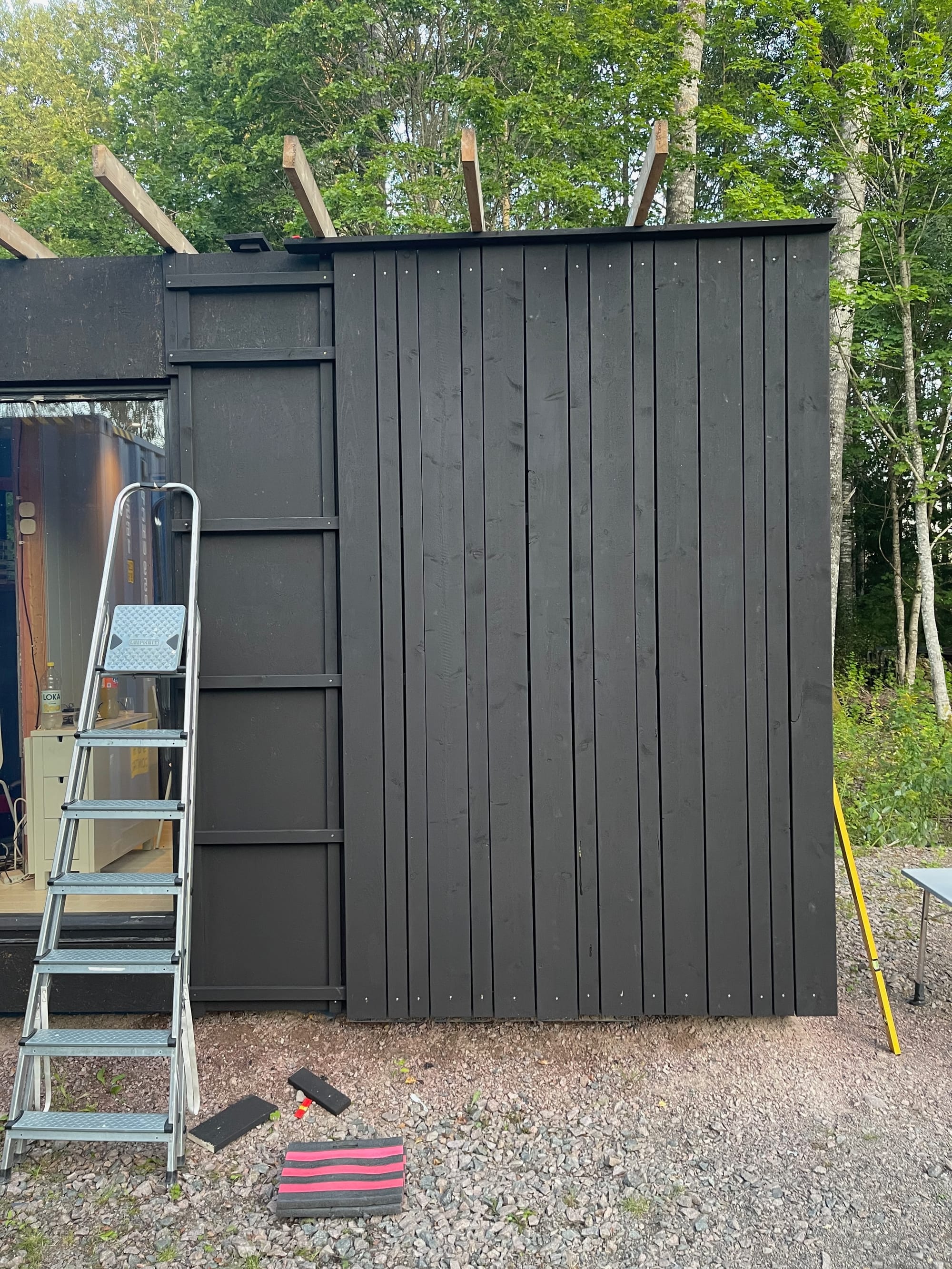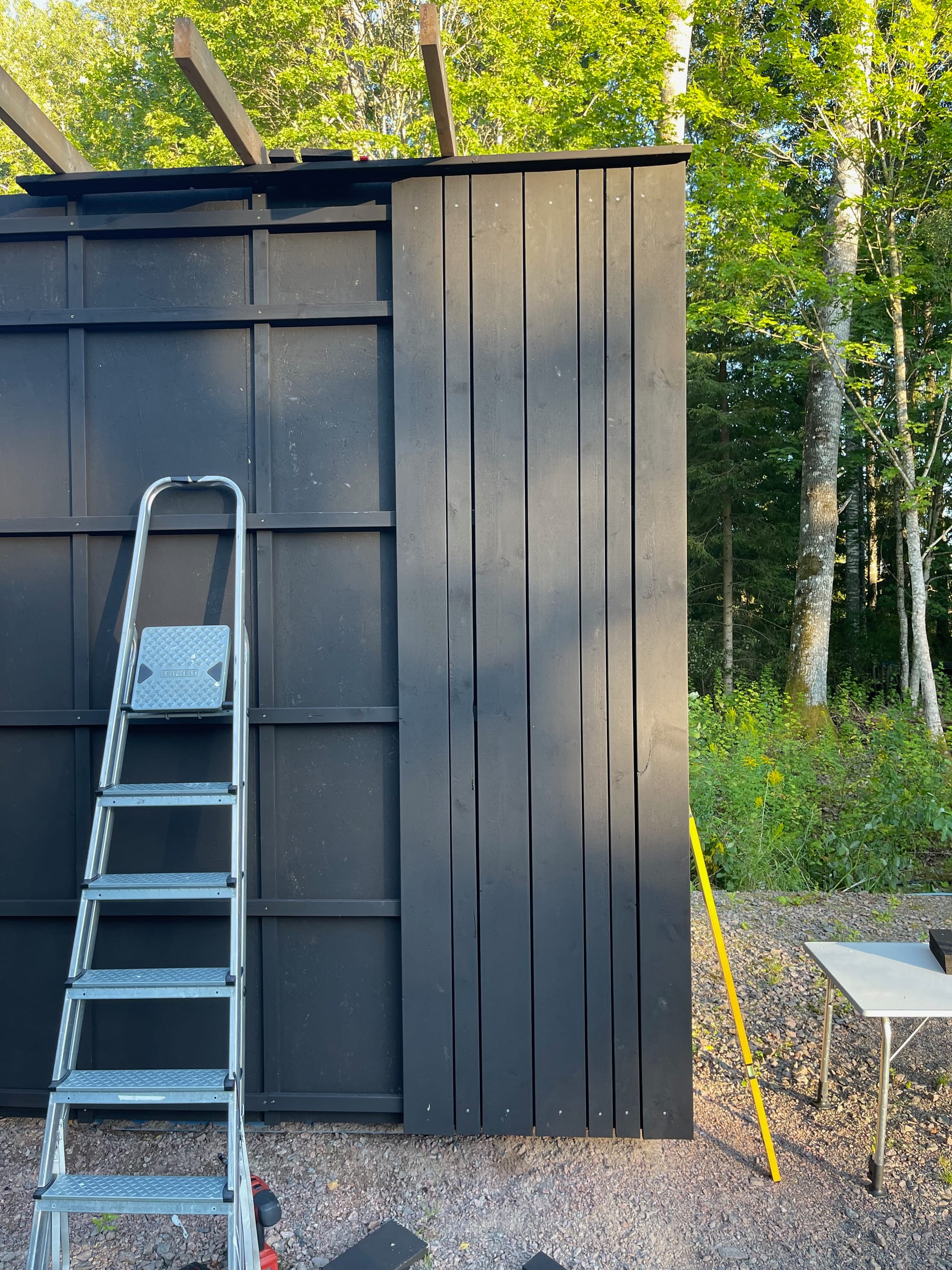 Dus misschien toch maar gebruik maken van de technieken die men hier gebruikt? En..... Yakisugi hebben we hier nog nergens gezien dus.... dan toch maar op onderzoek gaan naar een mogelijkheid om zwarte verf te vinden. En wat blijkt? Hier in Zweden, waar zo ongeveer alle huizen in het buitengebied de unieke en karakteristieke rode kleur hebben, bestaat van hetzelfde merk verf ook een zwarte variant. Prachtig diep zwart en mat, precies wat wij mooi vinden.