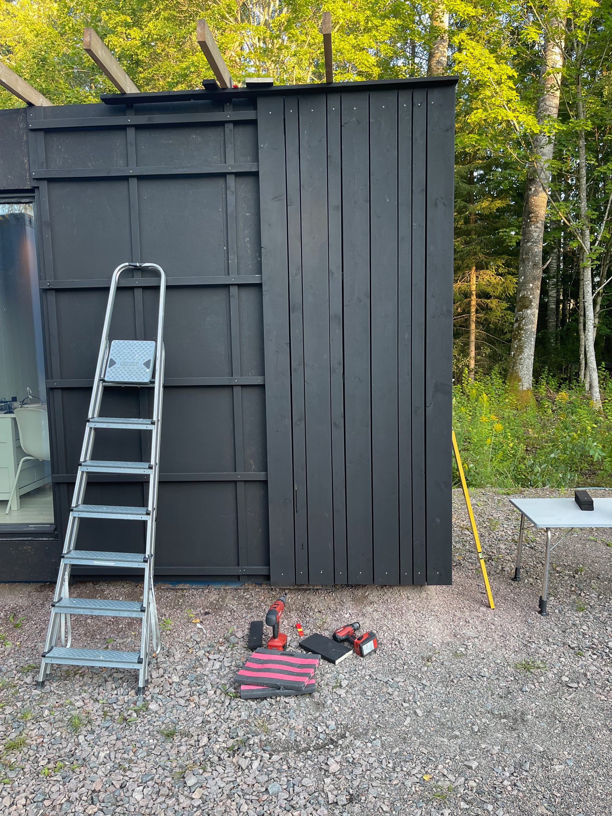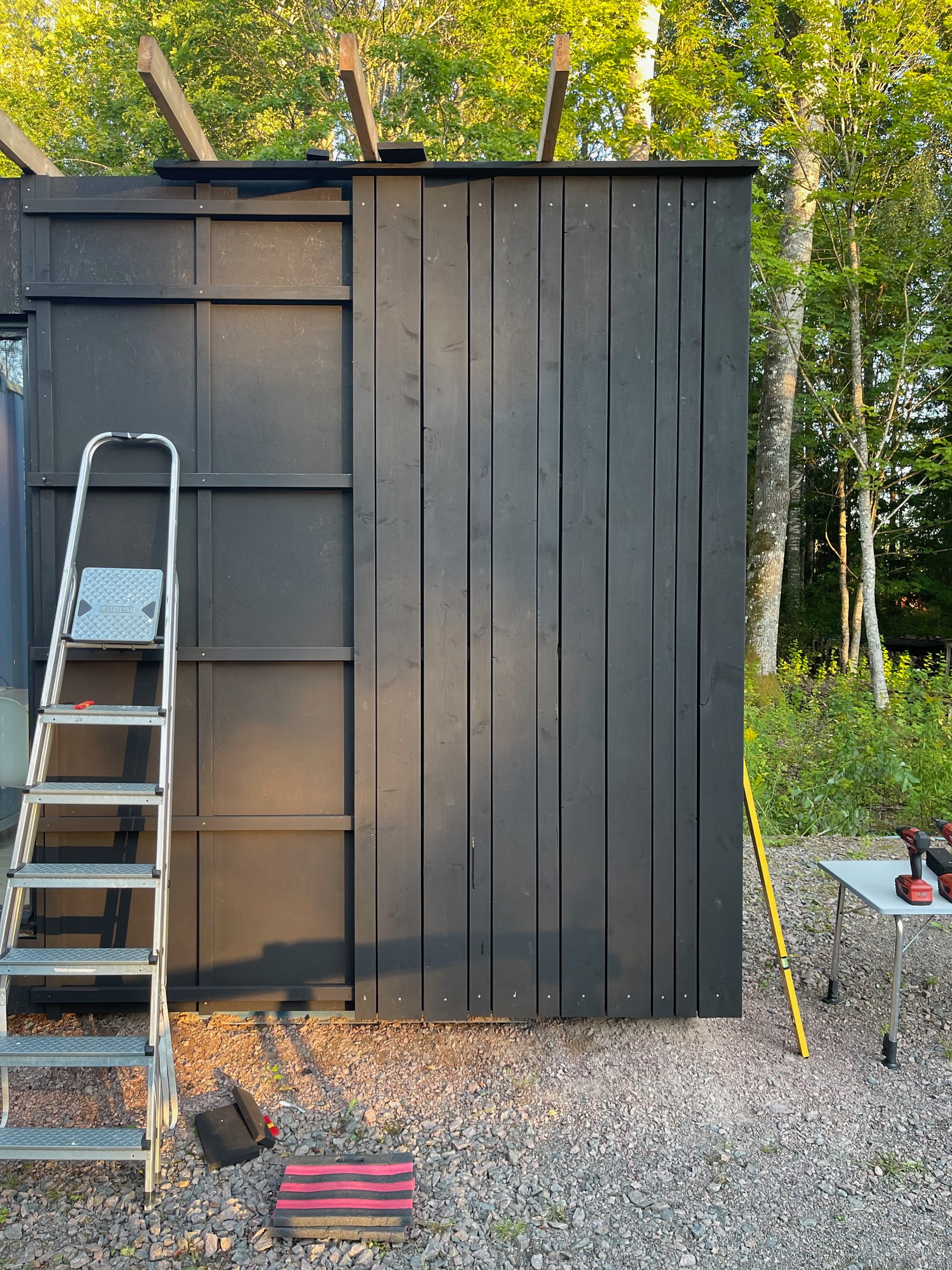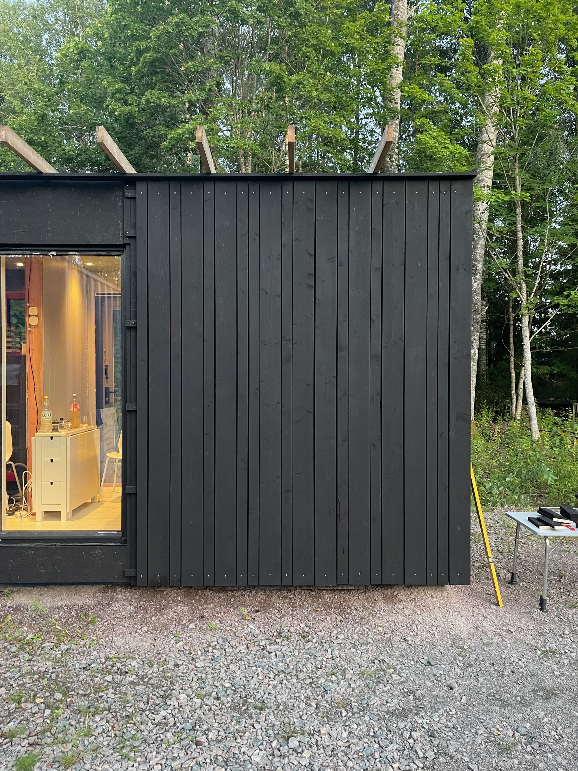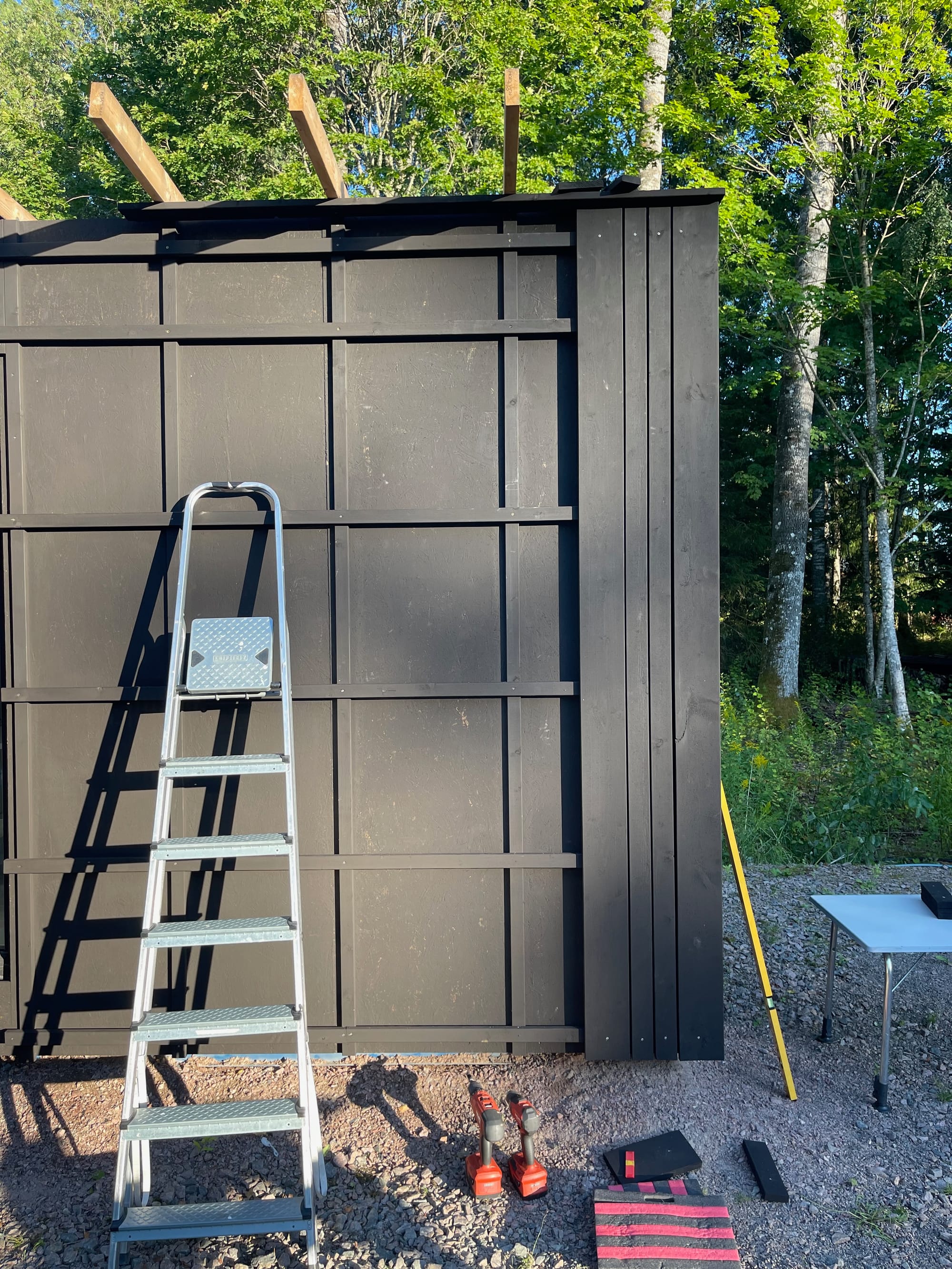 Dus misschien toch maar gebruik maken van de technieken die men hier gebruikt? En..... Yakisugi hebben we hier nog nergens gezien dus.... dan toch maar op onderzoek gaan naar een mogelijkheid om zwarte verf te vinden. En wat blijkt? Hier in Zweden, waar zo ongeveer alle huizen in het buitengebied de unieke en karakteristieke rode kleur hebben, bestaat van hetzelfde merk verf ook een zwarte variant. Prachtig diep zwart en mat, precies wat wij mooi vinden.