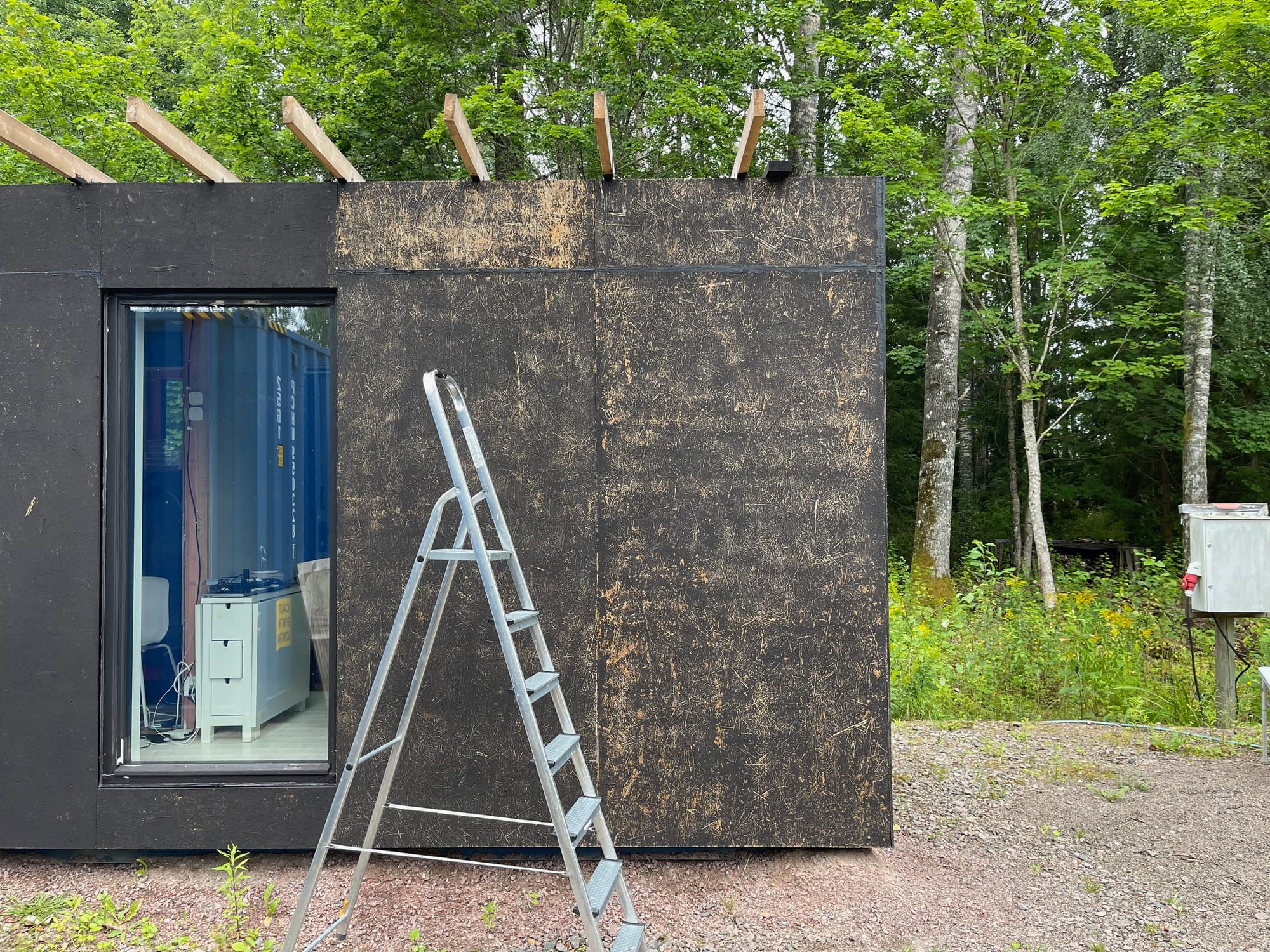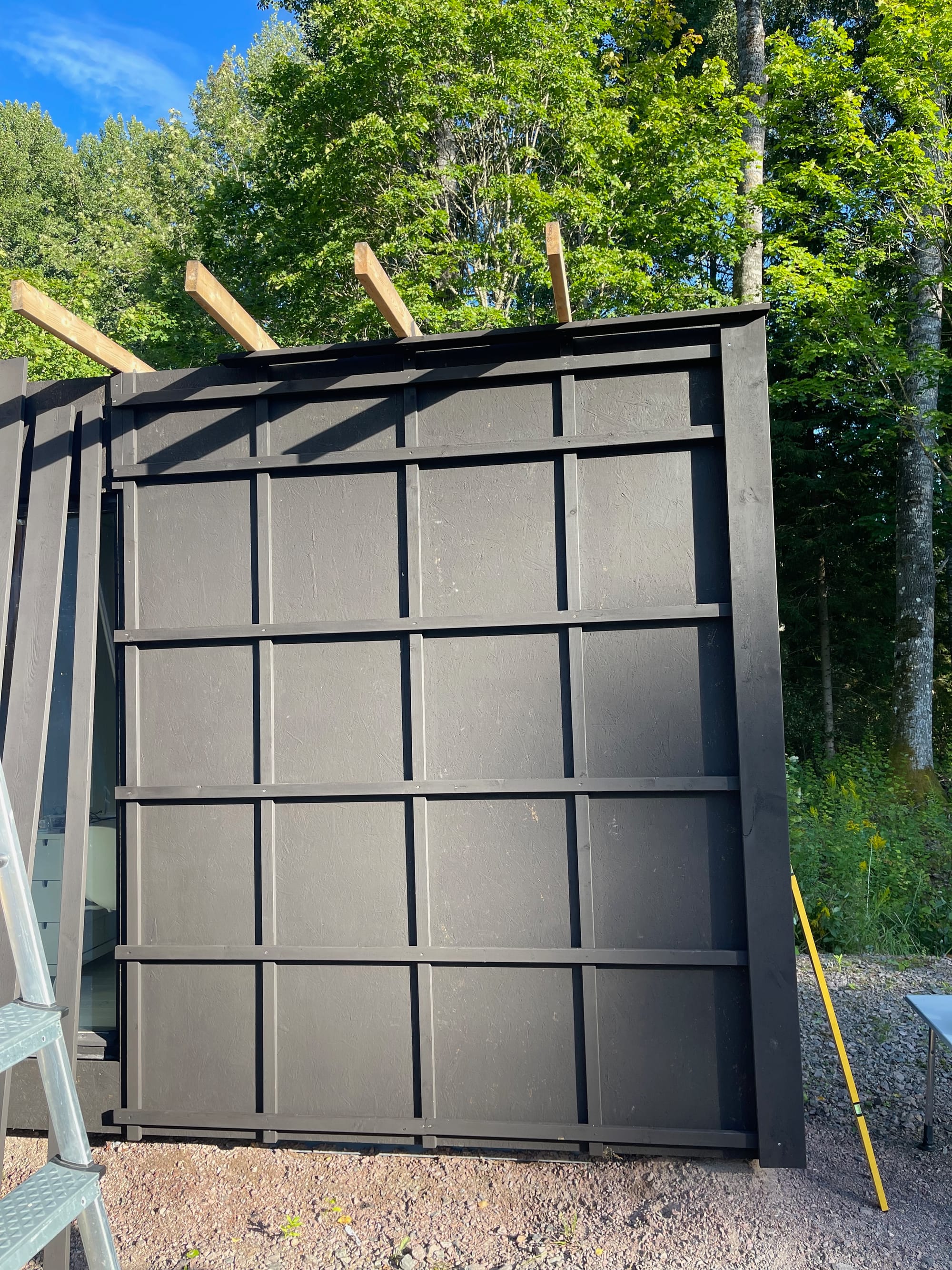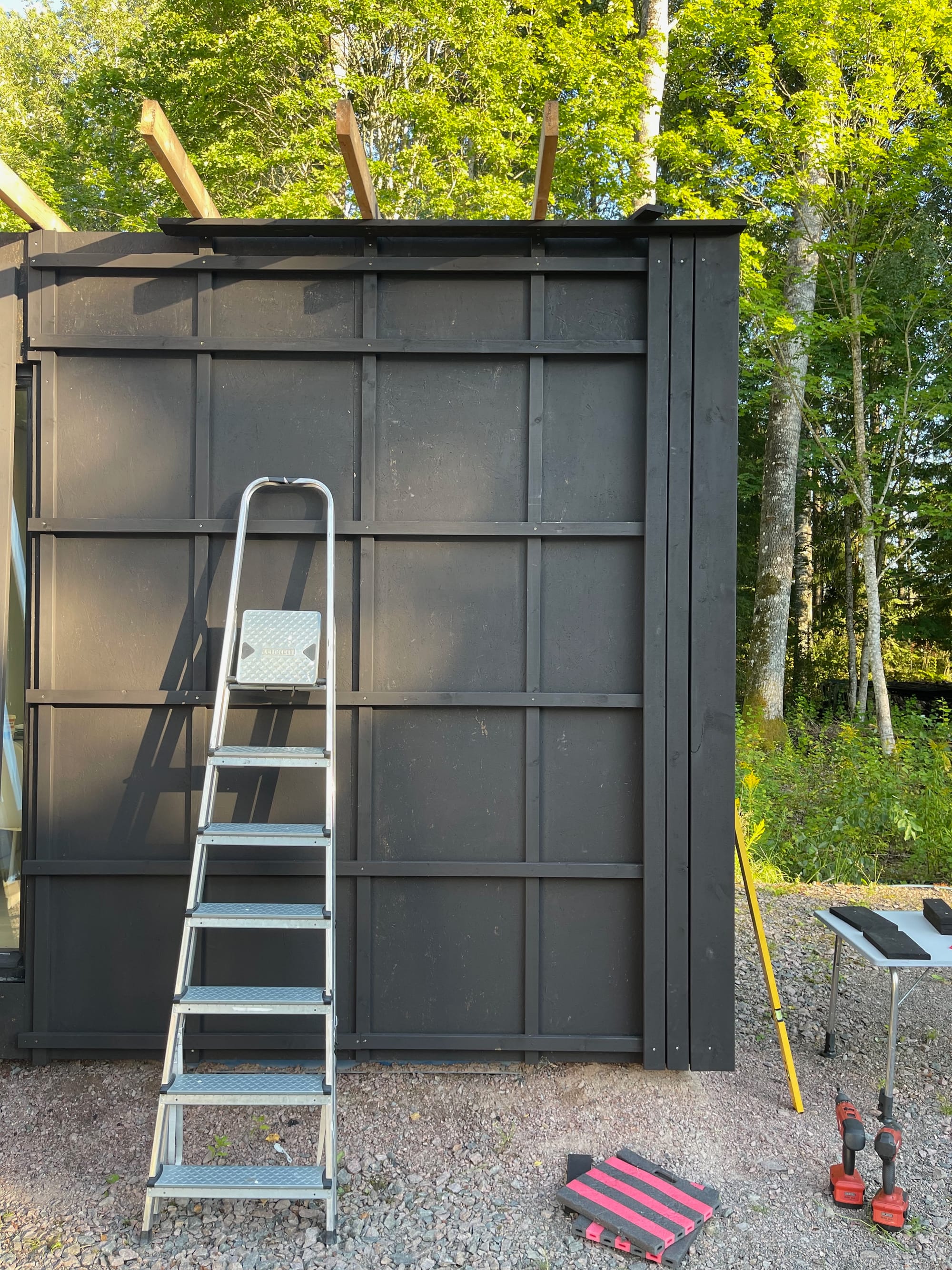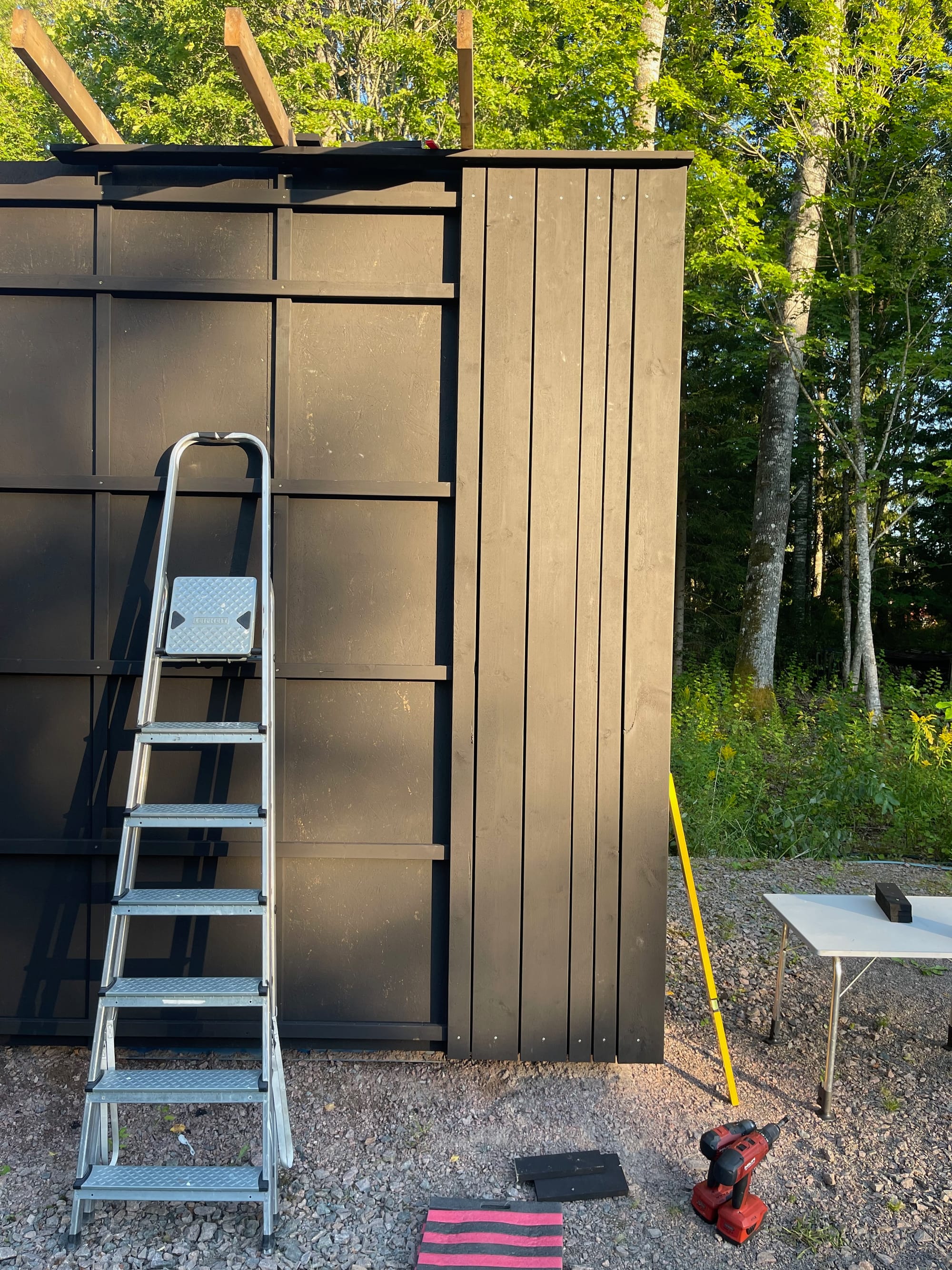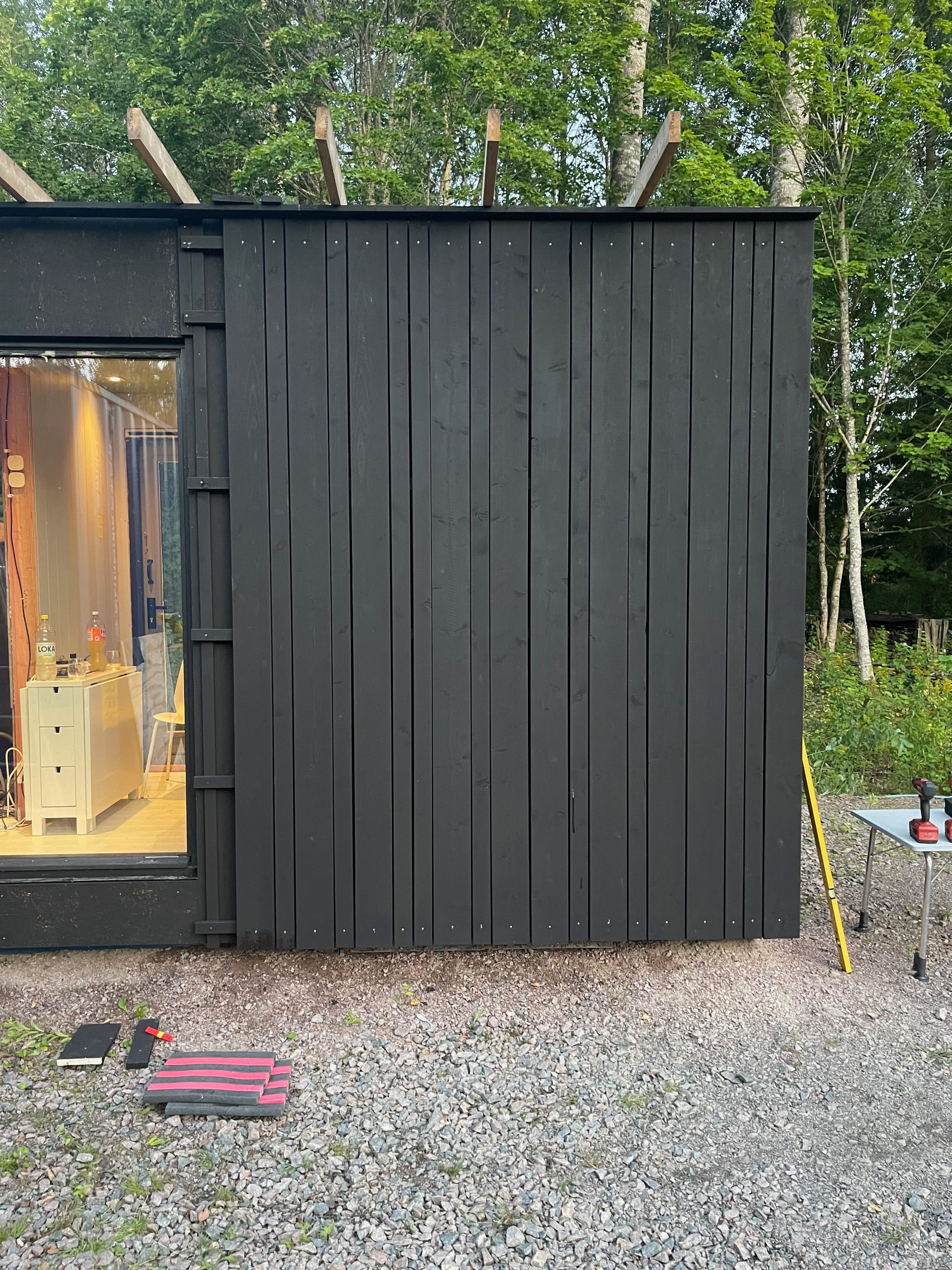 Dus misschien toch maar gebruik maken van de technieken die men hier gebruikt? En..... Yakisugi hebben we hier nog nergens gezien dus.... dan toch maar op onderzoek gaan naar een mogelijkheid om zwarte verf te vinden. En wat blijkt? Hier in Zweden, waar zo ongeveer alle huizen in het buitengebied de unieke en karakteristieke rode kleur hebben, bestaat van hetzelfde merk verf ook een zwarte variant. Prachtig diep zwart en mat, precies wat wij mooi vinden.