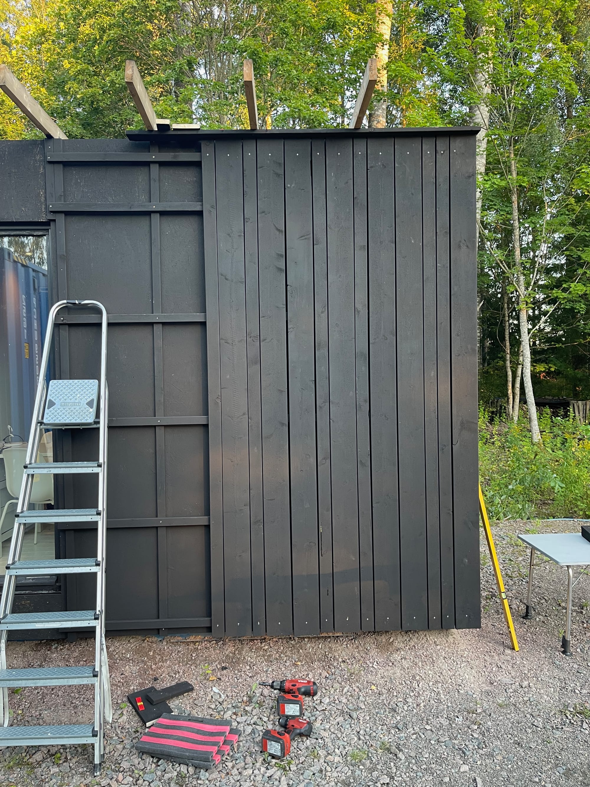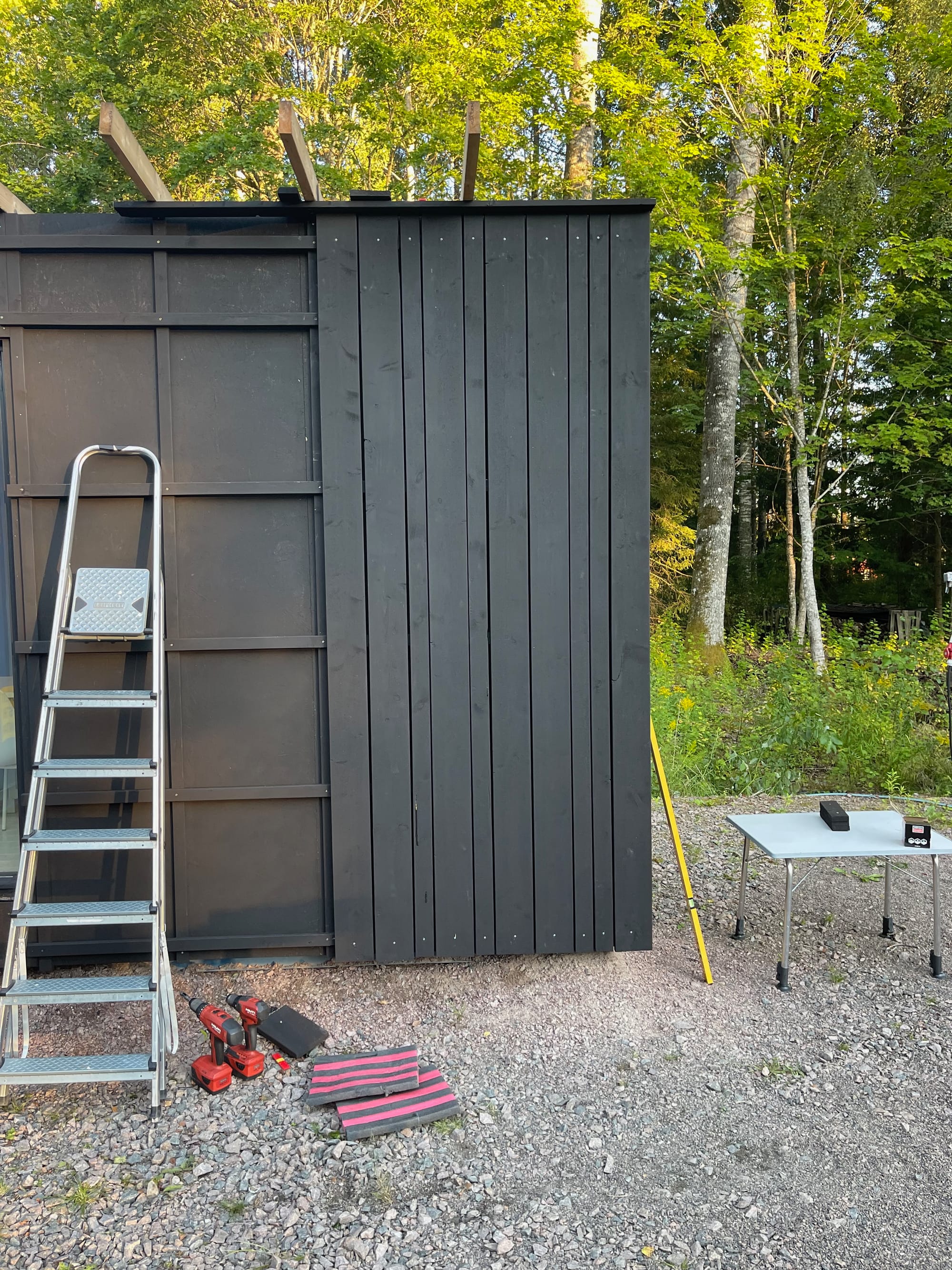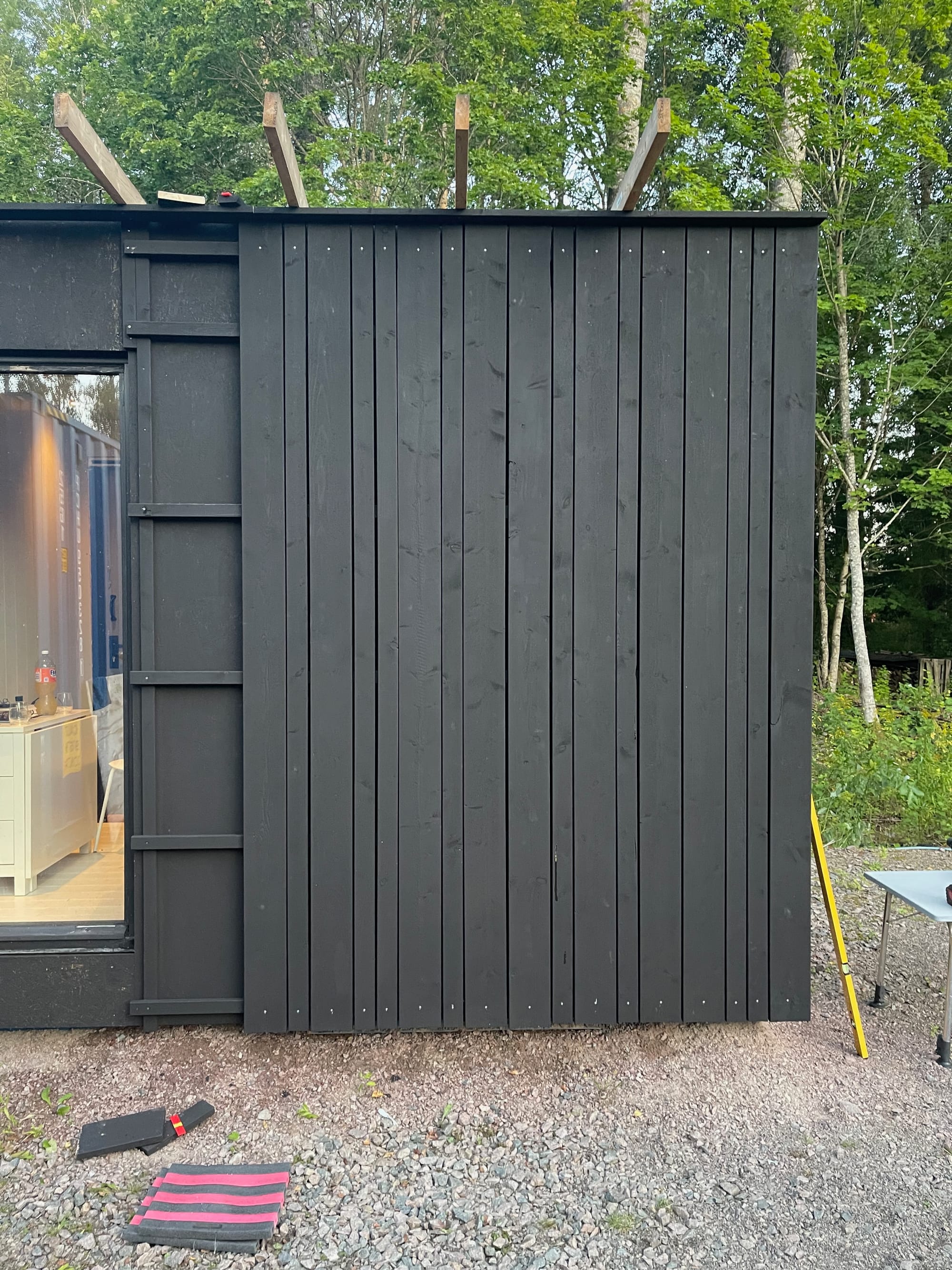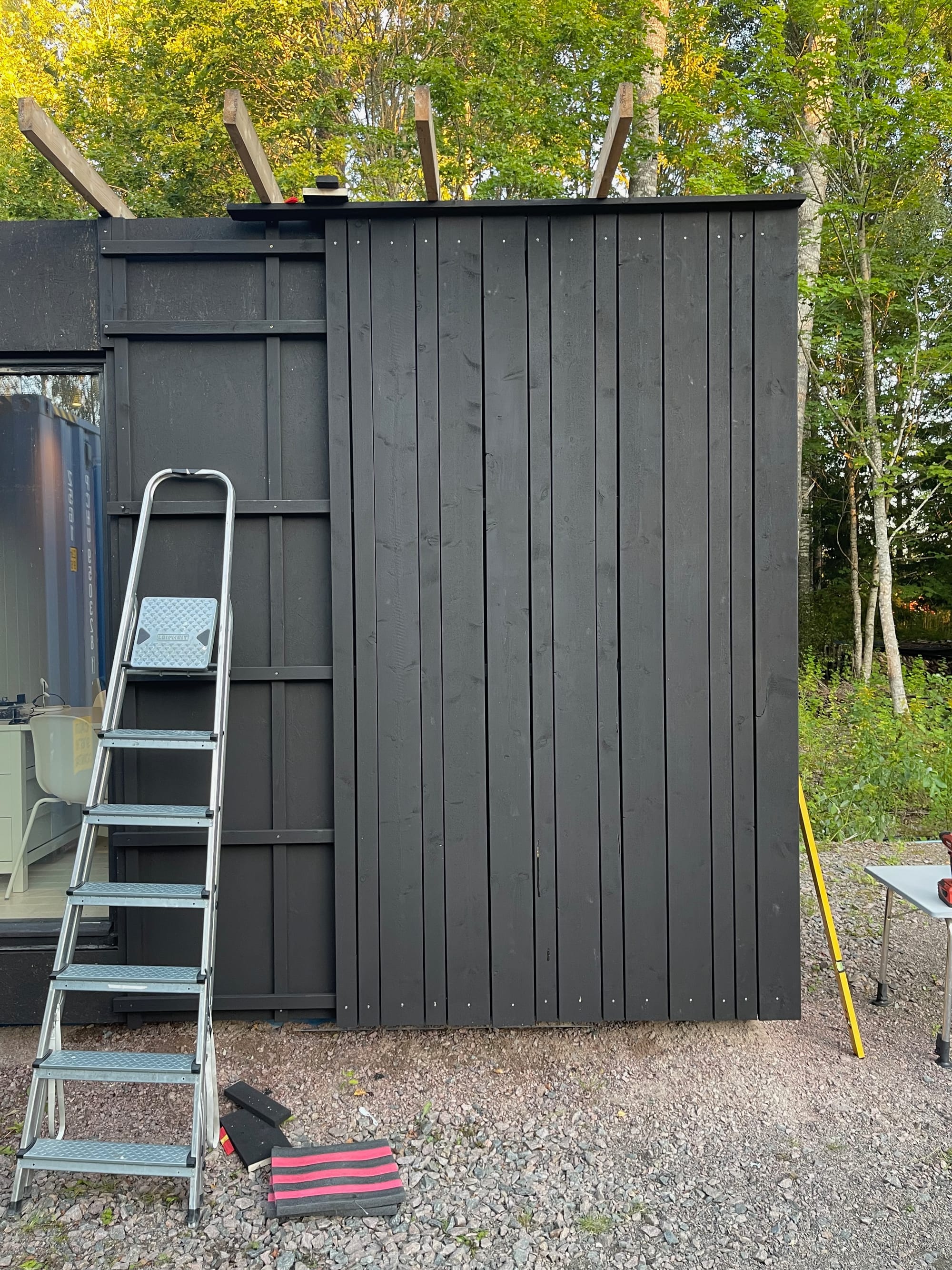 De laatste dagen hebben we in de avond nog wat ruimte om samen aan de slag te gaan met de buitenafwerking van de container. We hebben 20 planken gehaald van 2 verschillende breedtematen (70mm en 145mm), onbehandeld ruw geschaafd grenen, dat ik 2 keer in de verf zet. We gebruiken hier Falu Vapen Svart Rödfärg voor. Misschien weten jullie het nog maar een heel groot aantal blogs geleden (en inmiddels ook een heel aantal jaartjes geleden) hadden we bedacht dat we de cladding met planken zouden bekleden die door middel van Yakisugi weerbestendig gemaakt zou worden. De techniek bestaat uit het gecontroleerd laten verbranden van de bovenlaag van de plank waardoor een mooie textuur ontstaat. Inmiddels weer een aantal jaren later, komen we er ook wel achter dat: