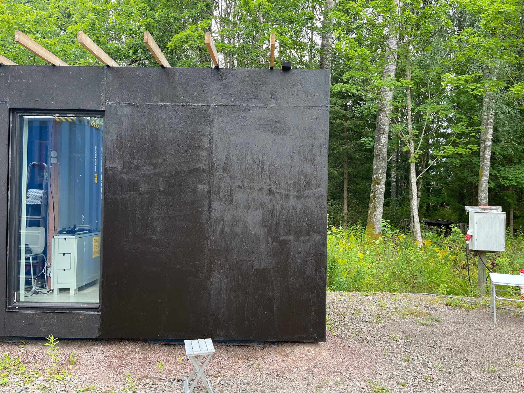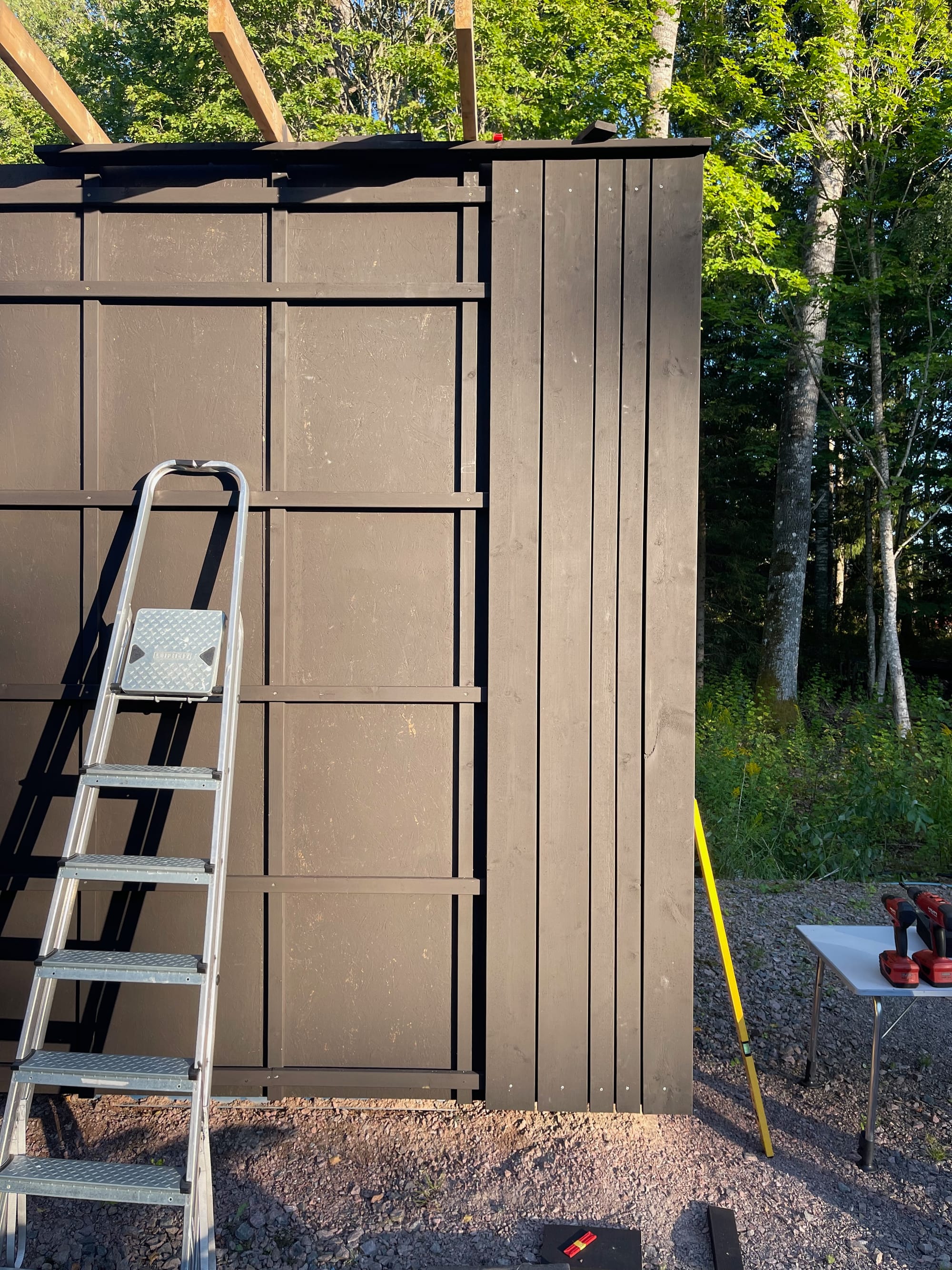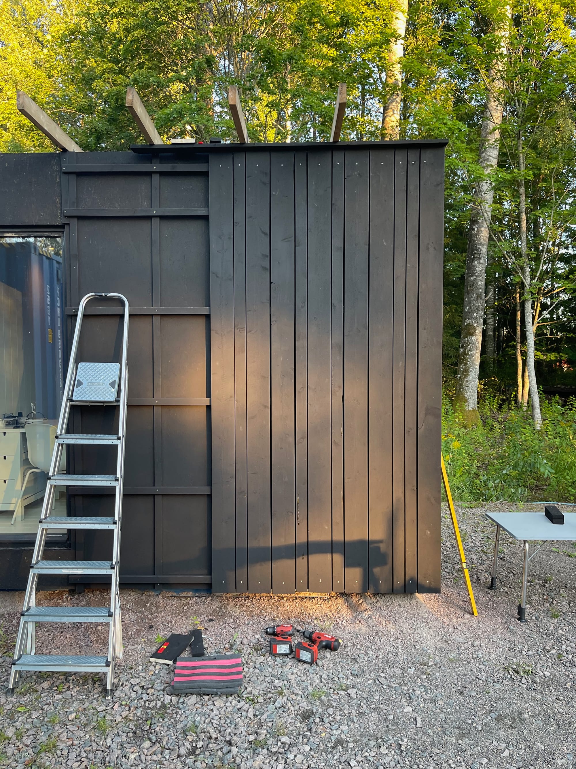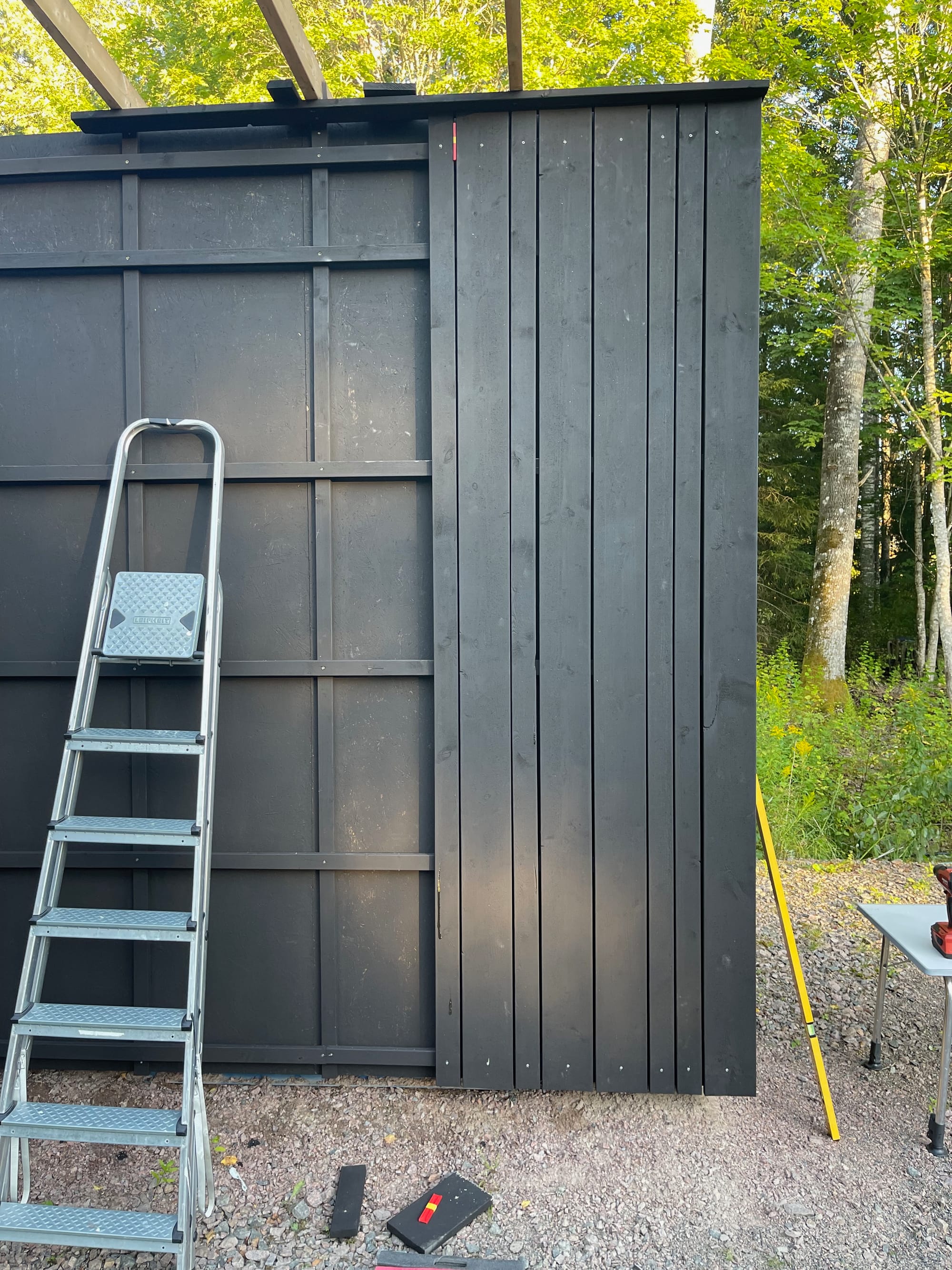 De laatste dagen hebben we in de avond nog wat ruimte om samen aan de slag te gaan met de buitenafwerking van de container. We hebben 20 planken gehaald van 2 verschillende breedtematen (70mm en 145mm), onbehandeld ruw geschaafd grenen, dat ik 2 keer in de verf zet. We gebruiken hier Falu Vapen Svart Rödfärg voor. Misschien weten jullie het nog maar een heel groot aantal blogs geleden (en inmiddels ook een heel aantal jaartjes geleden) hadden we bedacht dat we de cladding met planken zouden bekleden die door middel van Yakisugi weerbestendig gemaakt zou worden. De techniek bestaat uit het gecontroleerd laten verbranden van de bovenlaag van de plank waardoor een mooie textuur ontstaat. Inmiddels weer een aantal jaren later, komen we er ook wel achter dat: