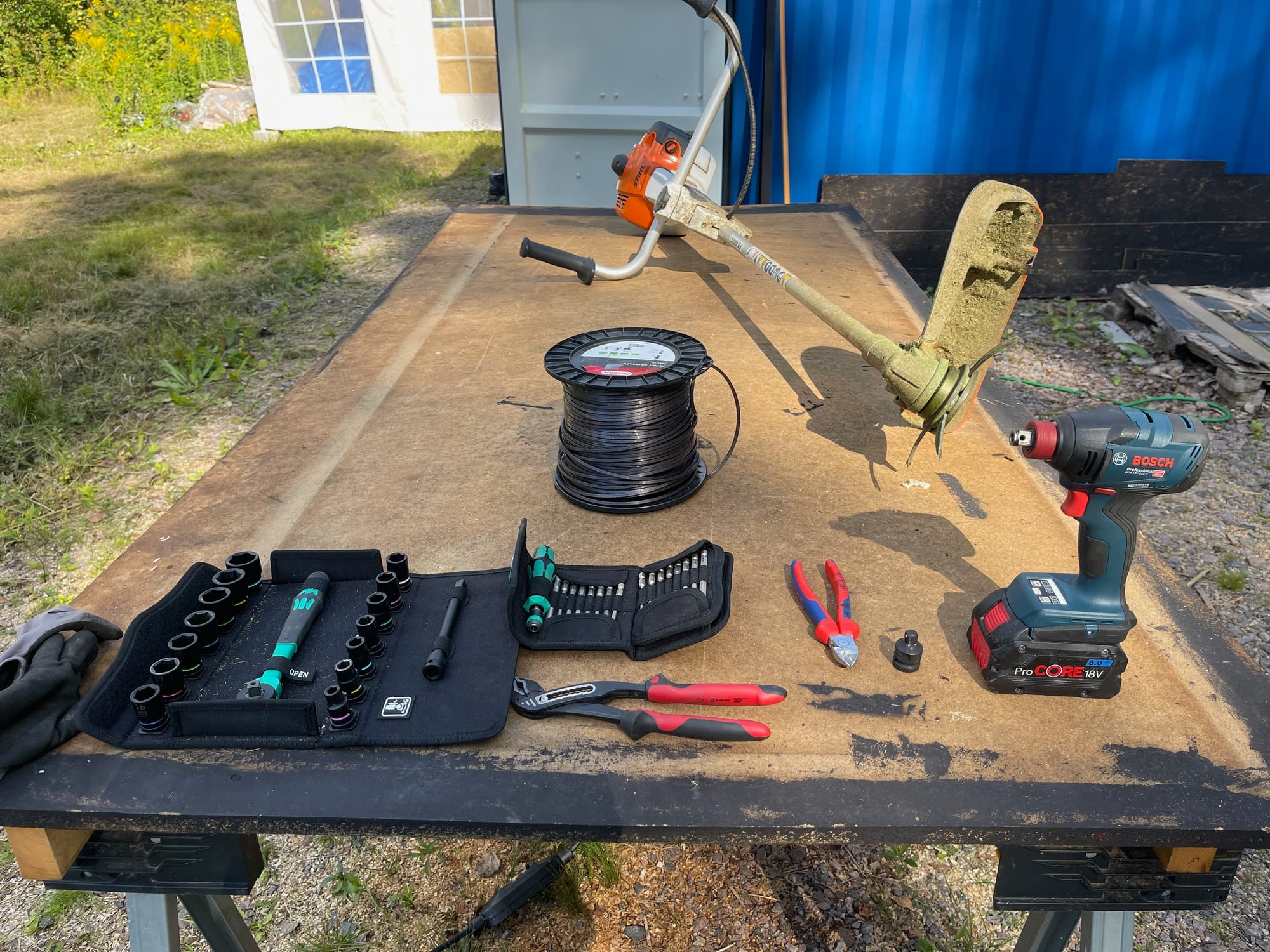 Maar de belangrijkste reden van onze trip, is het bijhouden van ons terrein. Ik noem het grasmaaien maar eigenlijk is het bosmaaier. Gelukkig hebben we een mooi apparaat, die de klus goed aankan. Zo af en toe de draden vervangen en je kan weer een paar uur verder.