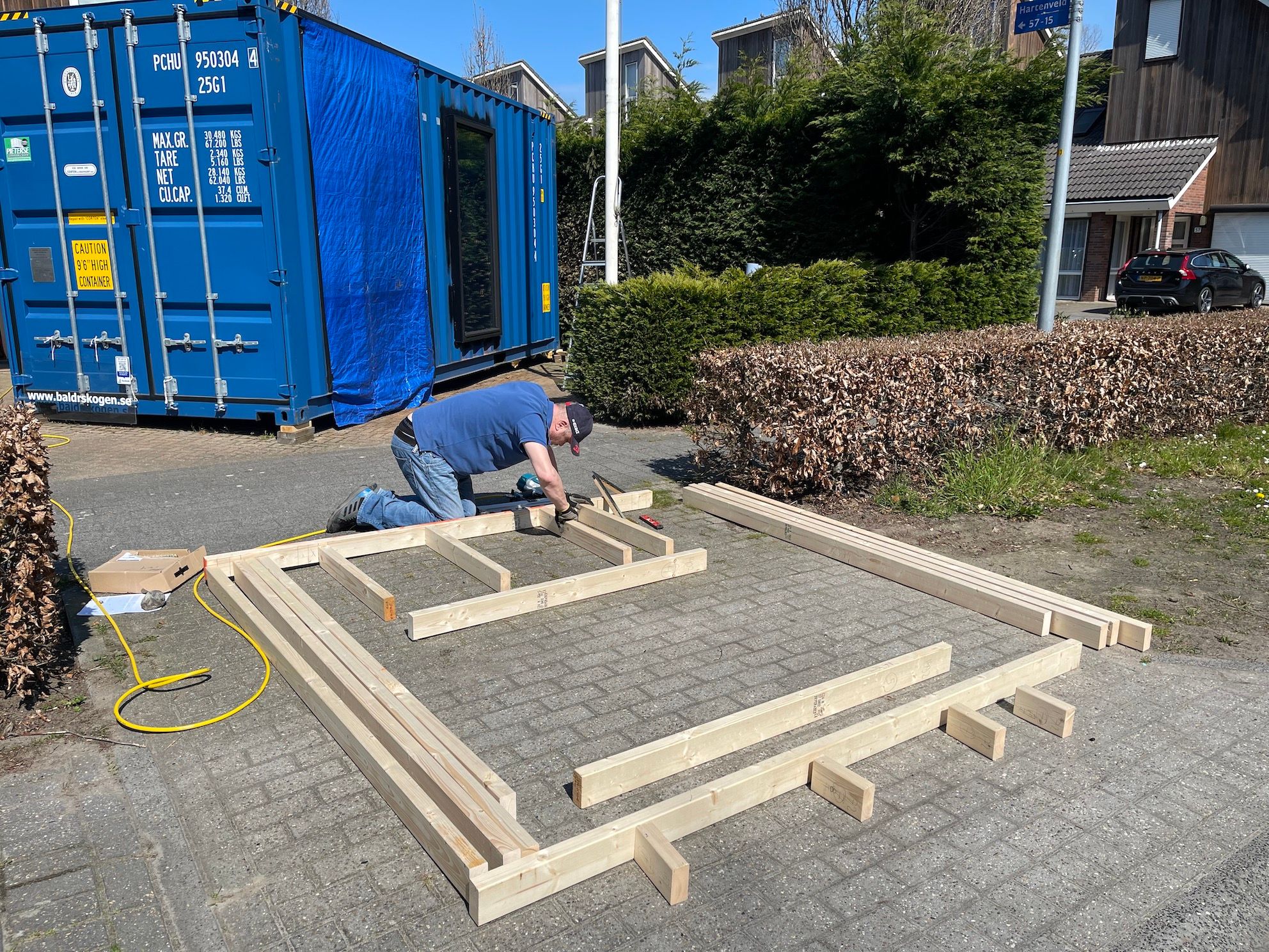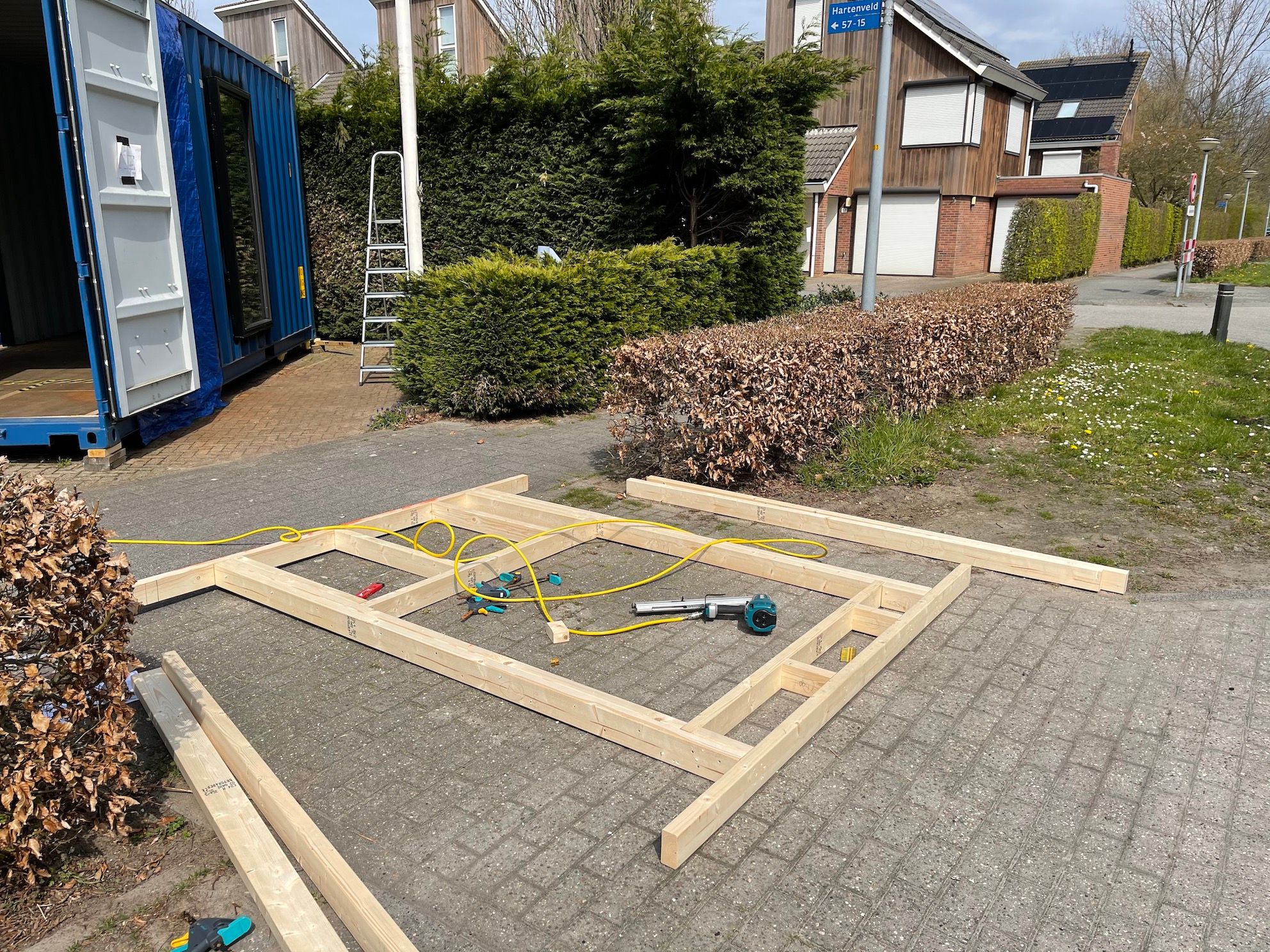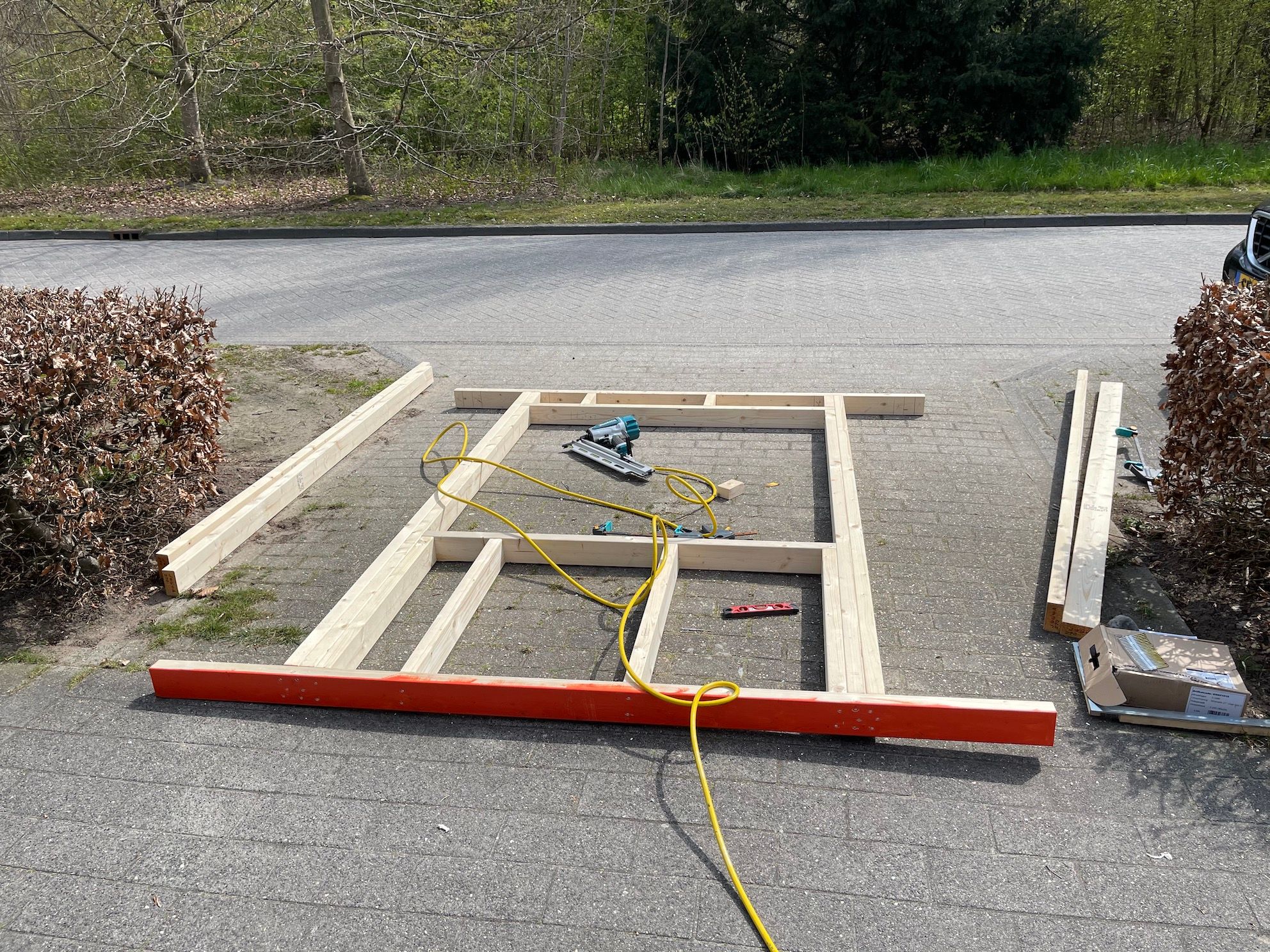 Leerpunt van het vorige frame was ook dat sommige delen moeilijk bereikbaar waren met het spijkerpistool omdat de balken dicht bij elkaar lagen. Nu we opnieuw starten, werken we van binnen naar buiten bij het opbouwen van het frame waardoor we nooit in de problemen komen met het spijkerpistool.