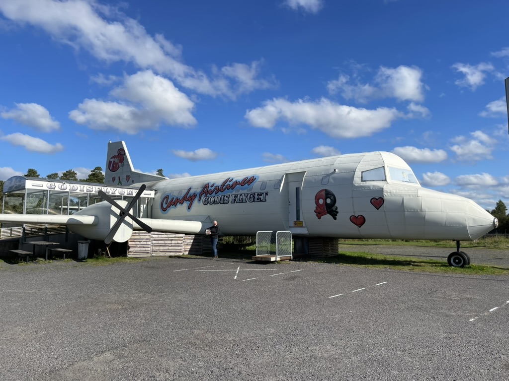 Op de terugweg rijden we eindelijk eens een keer tijdens openingstijd bij het snoepjesvliegtuig langs. Ik denk dat we minstens al 20 keer zijn langsgereden midden in de nacht, vroeg in de ochtend, laat in de avond, kortom, altijd buiten openingstijden. Ik kan de verleiding dan ook niet weerstaan om te stoppen en met een bak van meer dan een kilo snoep onze weg weer te vervolgen. Oh, en een paar kilometer verder zit er nog een snoepwinkel naast een pompstation, dus die pakken we gelijk ook nog maar even mee. Hier houden we ons in hoor: twee blikjes met pepermuntjes en een paar schepjes snoep die ze in het vliegtuig niet hadden.