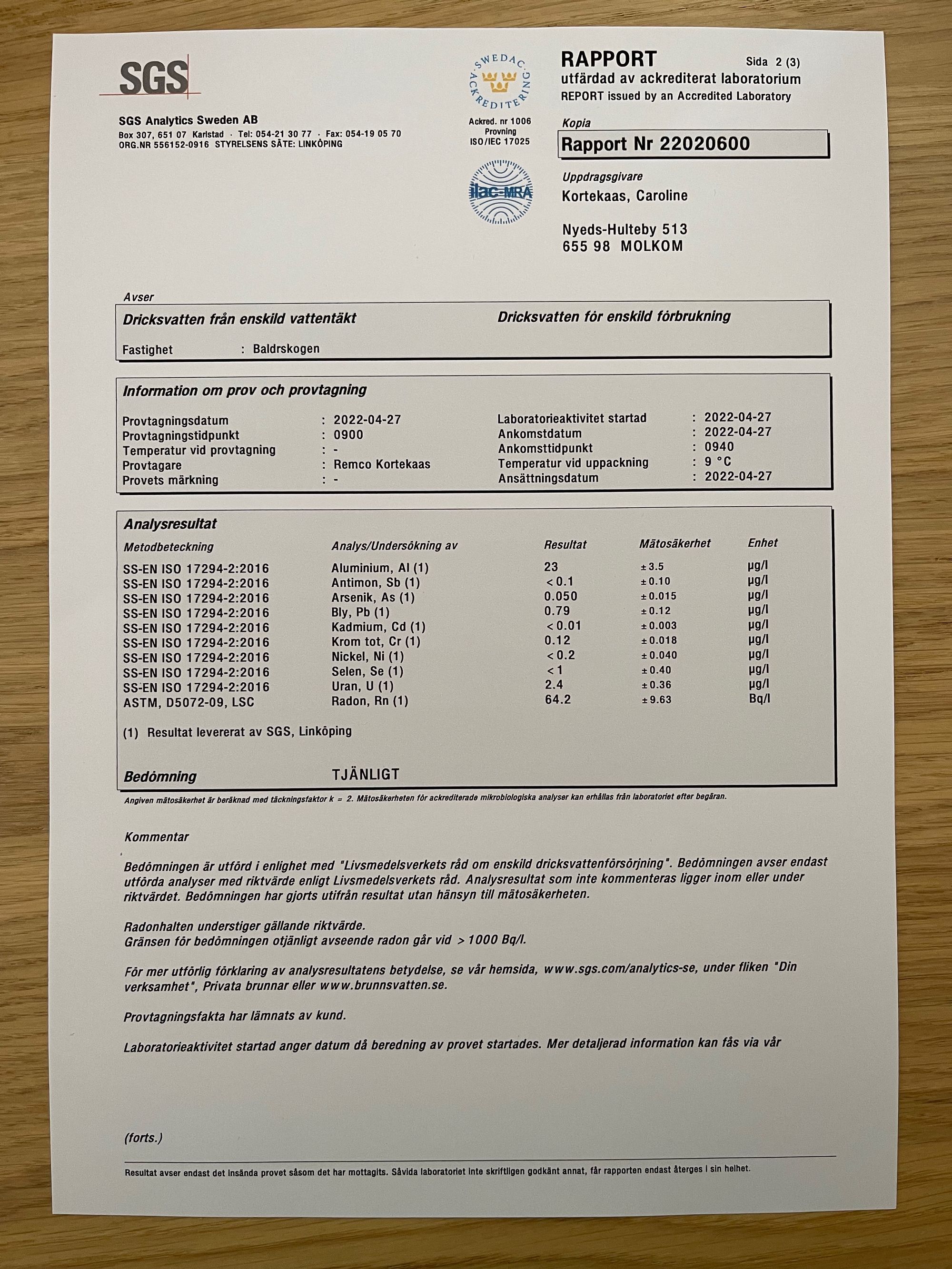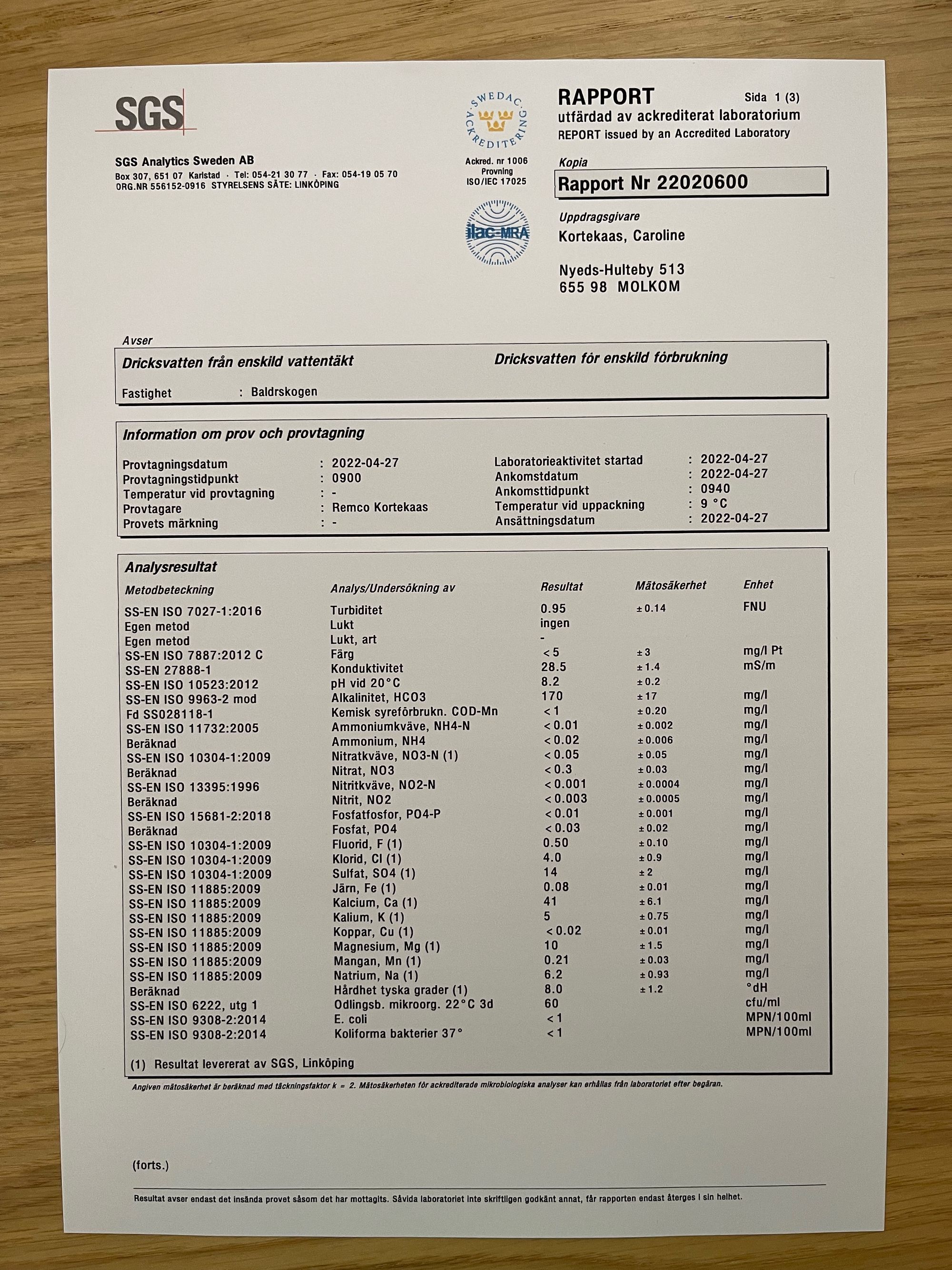 We sturen voor de zekerheid de uitslag ook naar onze kontrollofficer Jakob en ook al is water niet zijn specialisme, hij bevestigt wat wij al dachten: de uitslag is "tjänligt” wat betekent dat de bron OK is om te gebruiken als zoetwater voorziening.