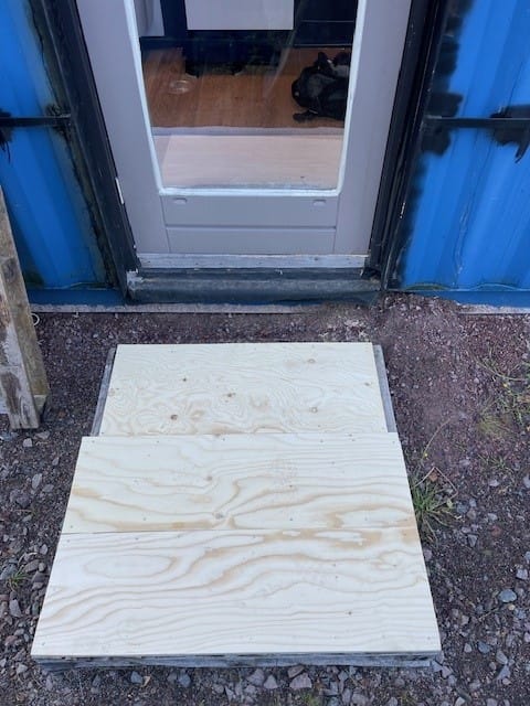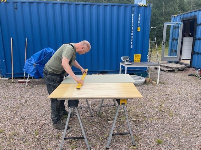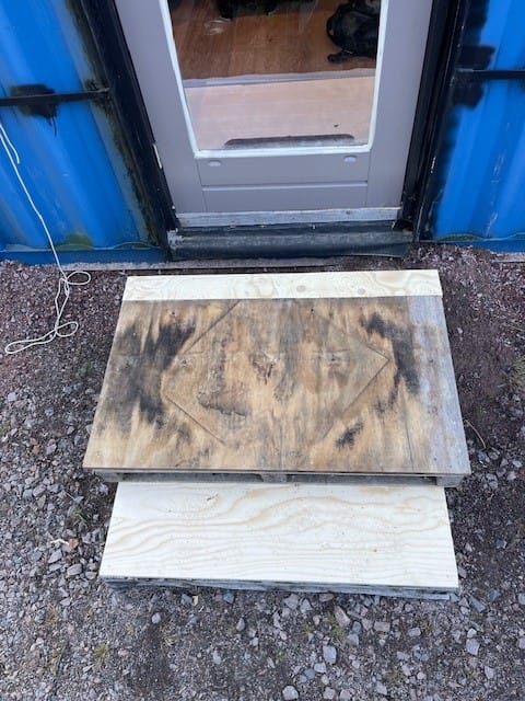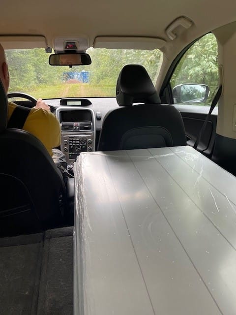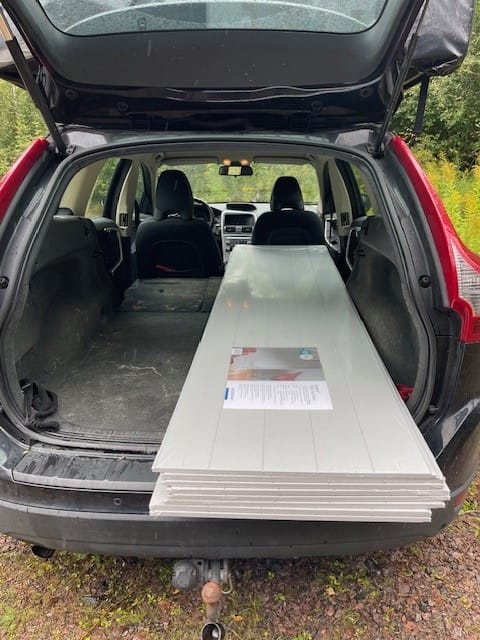 De bezorger is uiterst vriendelijk en geïnteresseerd in wat we hier - in the middle of nowwhere - aan het doen zijn. En wij vinden het natuurlijk geen probleem om dat uit te leggen 😄. Met een palletwagen laadt de bezorger de wandpanelen uit zijn vrachtwagen en zet ze neer aan het begin van onze oprijlaan. Wij laden vervolgens de spullen in de auto in en rijden - met de achterklep open - richting onze opslagcontainer.