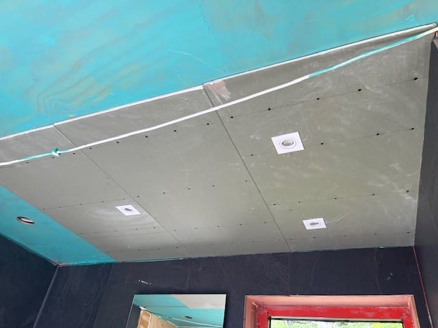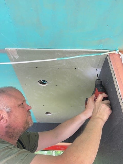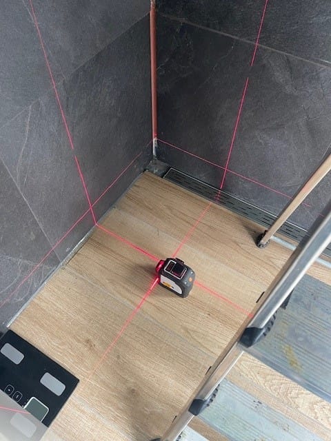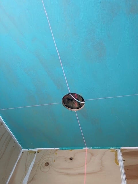 Om in de gipsplaten de gaten voor de spotjes op de juiste plaats te krijgen, maken we gebruik van de laser. Op die manier kunnen we precies zien waar het midden van het gat zit en als we de gipsplaat dan tegen heb plafond aan houden, kunnen we exact aftekenen waar het midden is. Bij de eerste 2 gaten is het uitmeten nog maar net goed gegaan, maar bij de volgende gaten gaat het steeds beter.