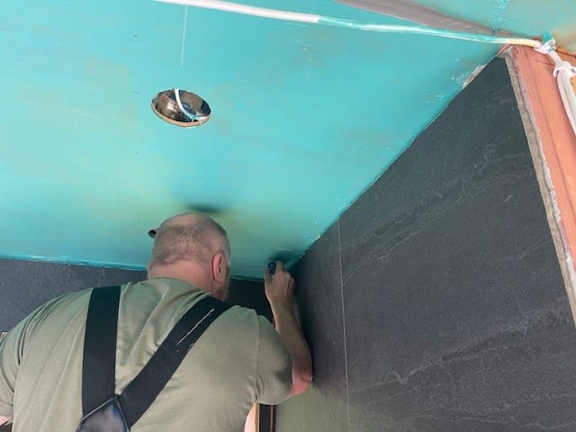 Nu we weer veilig in en uit de container kunnen stappen, hijs ik me op een ladder om het grote raam bij ons bed, aan de buitenzijde nog een keer goed af te kitten. Dit wat het 2e raam dat we ooit gemaakt hebben en de aansluiting tussen stalen frame en container was niet helemaal optimaal. We hebben het met pur al voor een groot deel afgewerkt, maar een goede laag asfaltkit gaat zorgen voor een nog betere afdichting. Het voordeel van deze klus is ook, het hoeft niet netjes, als het maar wel degelijk is. Het komt namelijk niet in het zicht omdat we de buitenkant van de container toch nog verder gaan afwerken met hout.