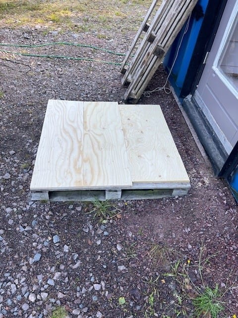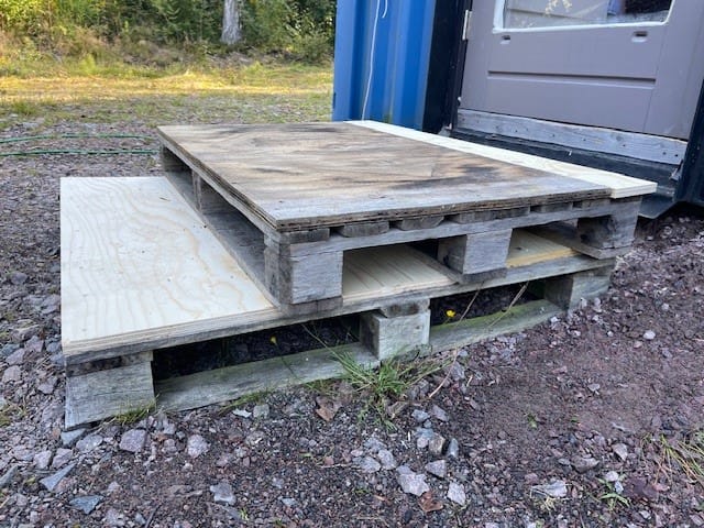 De pallets zijn aan elkaar vastgemaakt en inmiddels ligt er bovenop een grote rubberen mat (ook vastgemaakt). Niets kan meer schuiven.