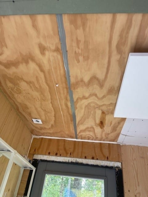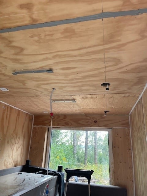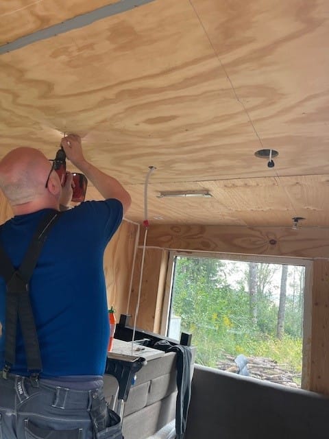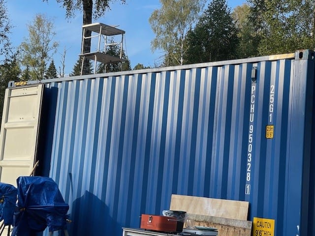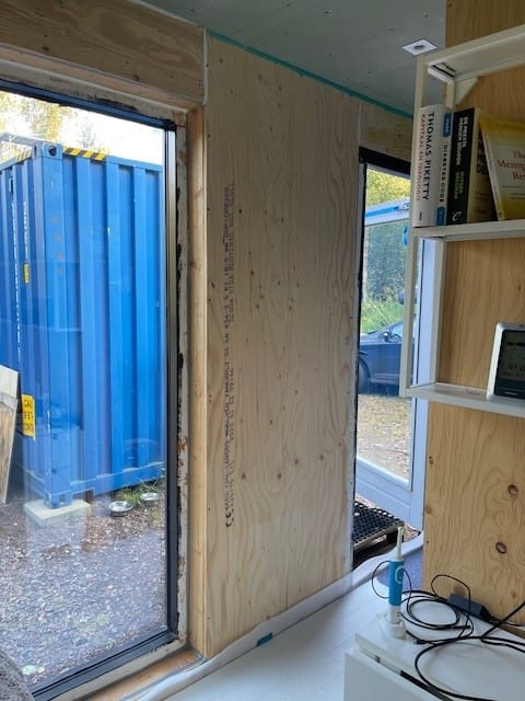 We gaan direct richting de Drive-in en halen een mega grote ladder maar lang nog niet de grootste die ze hebben. De ladder is niet goedkoop maar we hebben er eerdaags toch ook een nodig als we aan de slag gaan met het afwerken van de container aan de buitenzijde en het aanbrengen van het dak. We nemen gelijk ook een grote plaat spaanplaat mee om onze werkbank uit te gaan breiden zodat we daar straks de wandpanelen goed op maat kunnen zagen.