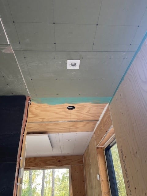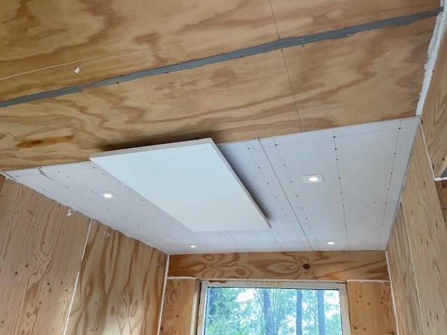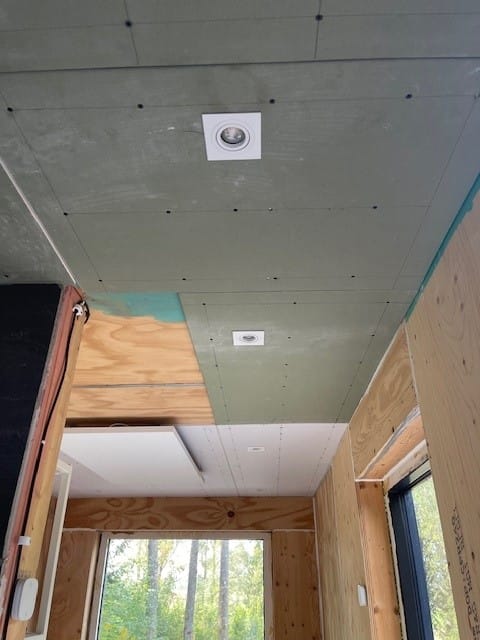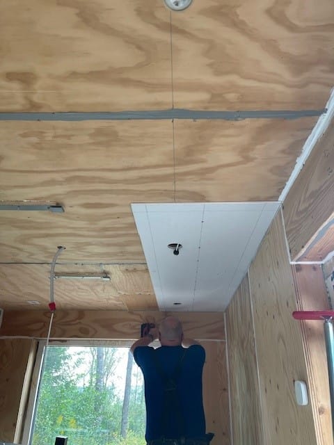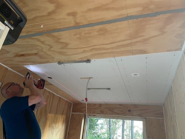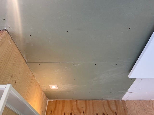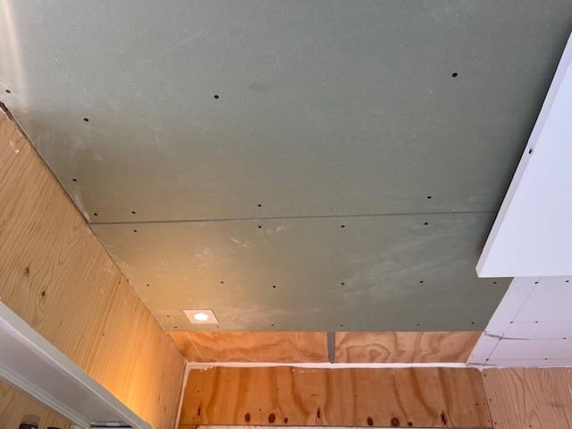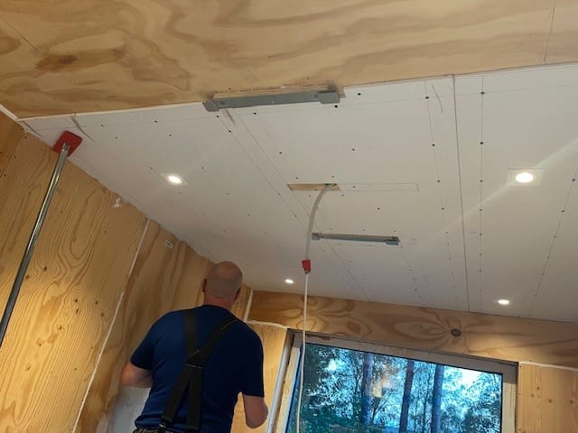 Het gipsplafond maken we vandaag verder af. Alles loopt soepeltjes en tegen de middag is de klus klaar.