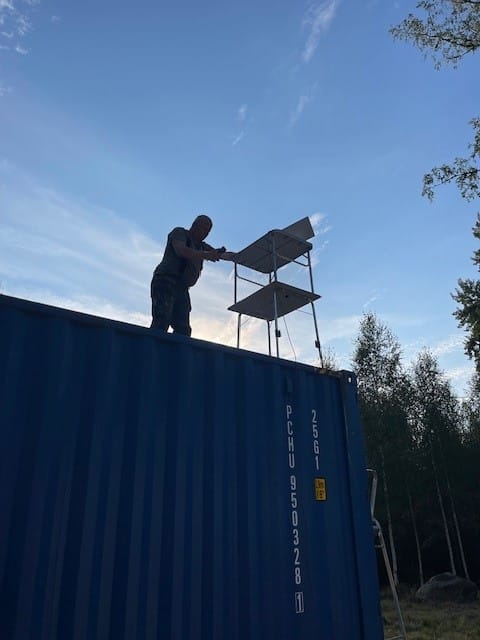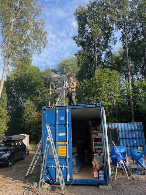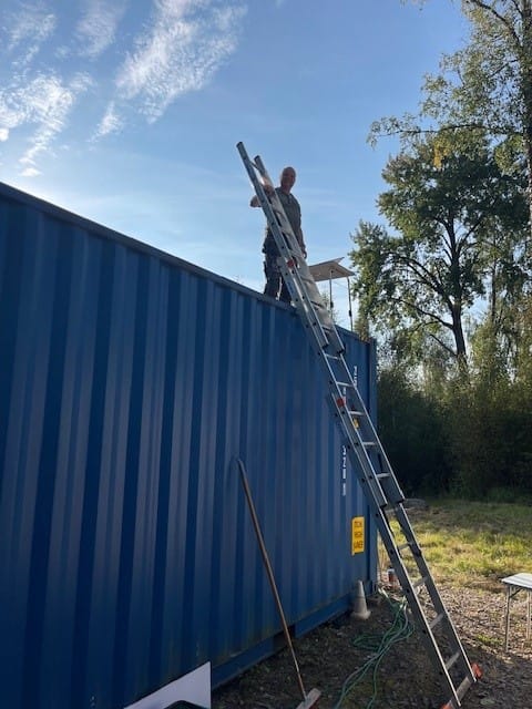 Met de nieuwe ladder is het makkelijk om op de container te komen en Remco bouwt een Elon-tower met 2 campingtafeltjes en plaatst te schotel erop. Nog een paar keer goed uitlijnen en dan maar even afwachten welk effect dit heeft.