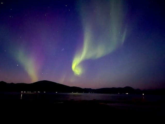 Maar ondanks dat we veel onderweg zijn, zien we de meest fantastische dingen zoals overstekende elanden en meehollende rendieren, schitterende vissershuisjes, we genieten van een stokvisburger en zien het Noorderlicht.
