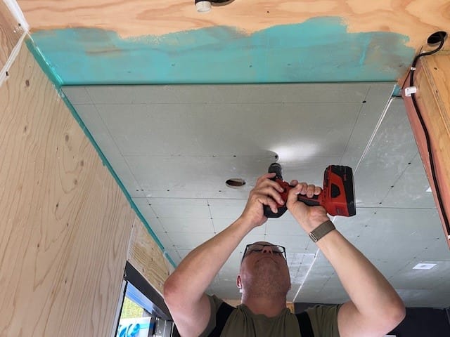 We gaan vandaag verder met de gispplaten voor het plafond en als snel komen we erachter dat we vergeten zijn om de kniptangen mee te nemen. En die hebben we wel nodig want er moet nog het een en ander gewijzigd worden aan de stroomvoorziening van het thermopaneel (grillplaat) die boven ons bed hangt. Dus snel maar even naar de Bauhaus om van het goede rood-blauwe merk (Knipex) een tangetje te halen. En als we toch in de winkel zijn, nemen we gelijk gipsplamuur, afdekzijl en plamuurmessen mee.