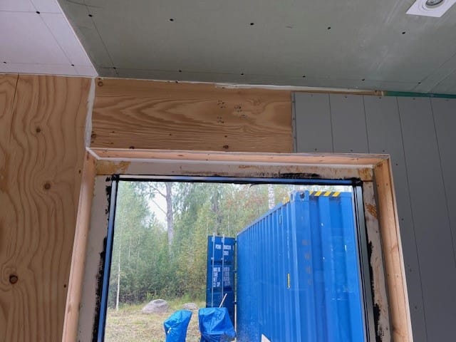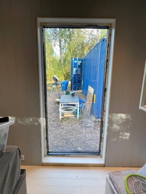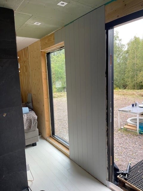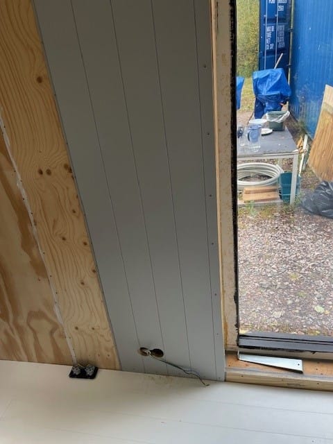 Vandaag zijn we begonnen met de afwerking van de kozijnen. Vier mooie witte planken, die we met kleine spijkertjes en lijm vastzetten.