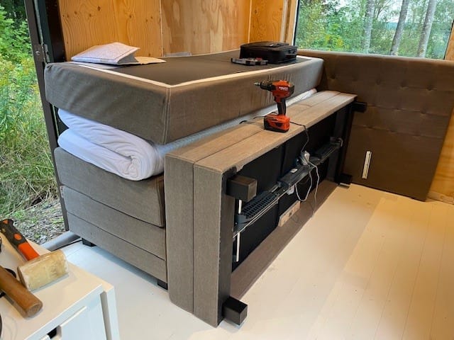 We gaan aan de slag met de wandpanelen. Eerst het bed aan de kant. Inmiddels hebben we het bed al meerdere keren moeten verplaatsen en we worden er steeds handiger in π