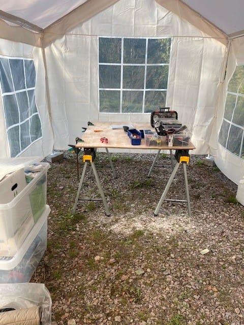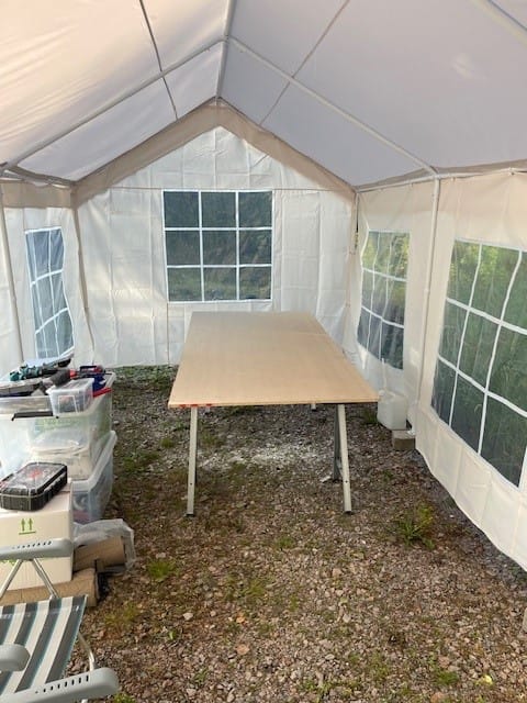 Als Remco de slagboor uitpakt en de stekker in het stopcontact steekt, blijkt dat een van de pinnen van de stekker is afgebroken! Er zit niets anders op dan weer teruggaan om het apparaat te ruilen. Daar waar we dachten dat het neerzetten van de tent een klein klusje zou worden, zijn we er uiteindelijk de hele dag zoet mee. Maar uiteindelijk staat de tent prachtig strak, zijn de scheerlijnen ook aangebracht en lachen we maar weer om het voorval van de hamerboor. Inmiddels zijn we er wel achter dat iedere klus in Zweden, minstens 2 of misschien wel 3 keer zo lang duurt als je had verwacht.