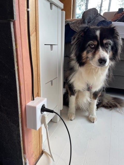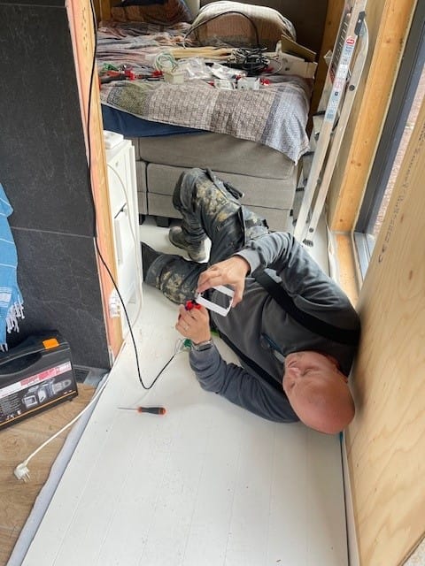 Dit is de eerste dag van onze vakantie en we starten dan ook in een vakantietempo op. Remco gaat verder met de elektriciteit. Toen we de grillplaat voor het eerst hadden opgehangen, liepen er allerlei snoeren over het plafond richting het tussenwandje en de meterkast. Het was een wildgroei aan kabels, snoeren en stekkers en zag er natuurlijk niet uit maar het werkte uiteraard allemaal prima. Maar nu is het tijd om ook dit netjes te maken. De draden van de grillplaat heeft Remco boven het plafond weggewerkt en daar ligt ook de Shelly (wifi-schakelaar) om de plaat aan- en uit te zetten. De draadloze thermostaat is onderweg via Amazon richting de Coop in Molkom en zal naar verwachting woensdag arriveren. Vanuit een elektriciteitsdraad vanuit het plafond gaat Remco een wandcontactdoos aansluiten op het tussenwandje maar.... we komen erachter dat we wel de wandcontactdozen hebben meegenomen maar de opbouwdoos - die nodig is om de wandcontactdoos aan de muur te maken - die hadden we niet. Jullie mogen 1 keer raden wat we dus zijn gaan doen........ tromgeroffel .... ja hoor, we zijn een ritje naar de Bauhaus gaan maken. Dit stopcontact is nog niet de definitieve versie want we moeten nog iets bedenken voor het afwerken van de zijkant van het tussenwandje, maar daar wachten we mee totdat we de douchewand gemonteerd hebben.