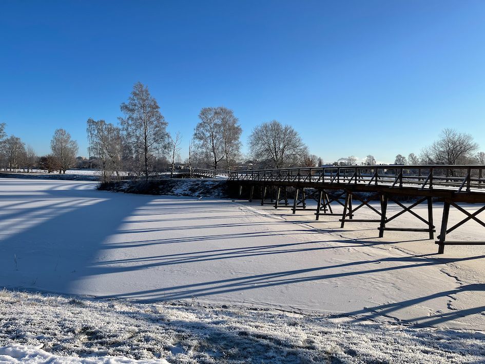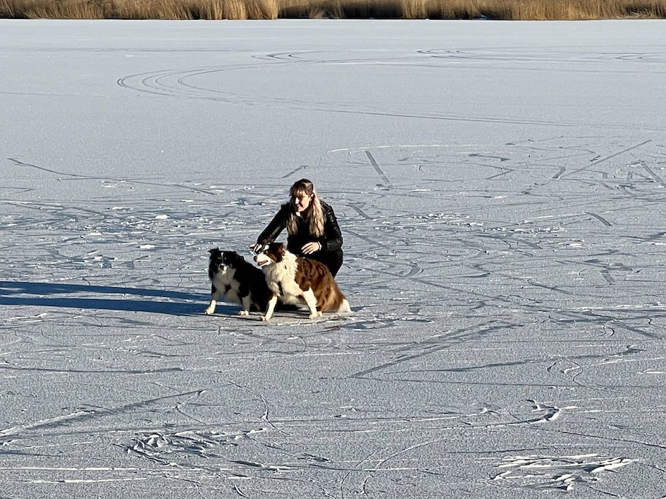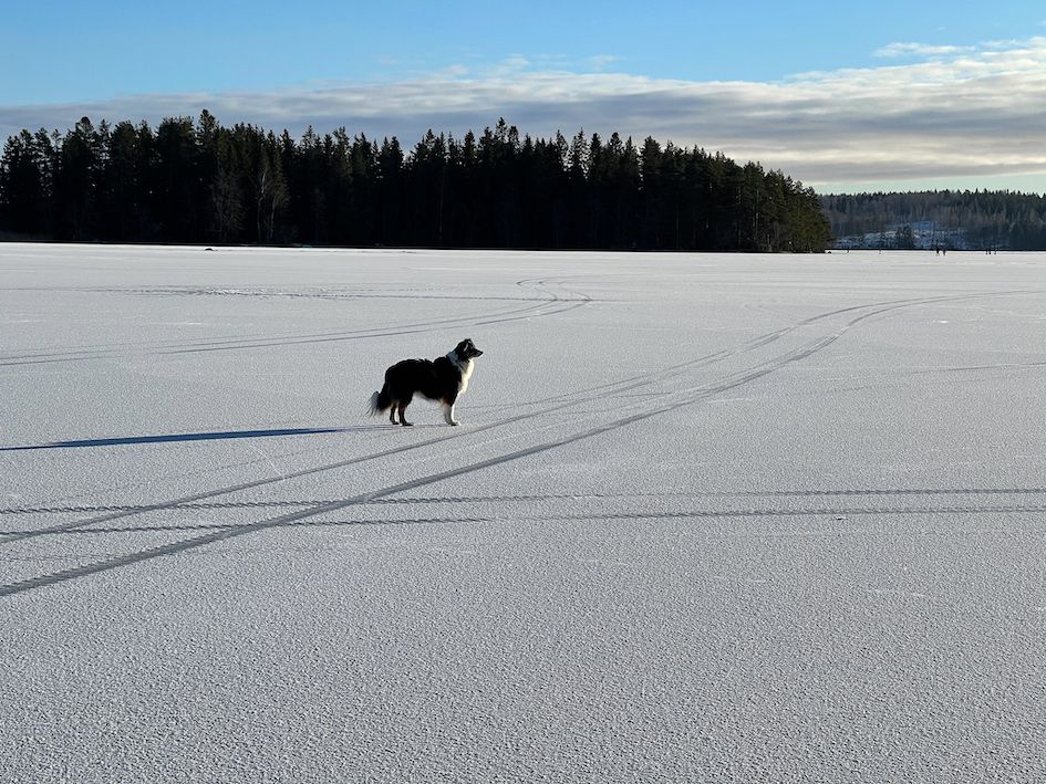 We dalen af richting ons kavel en stappen weer in de auto. We stoppen bij het meer van Molkom omdat we zien dat er allemaal mensen op het ijs staan, wandelen, schaatsen etc. Ook wij besluiten het meer op te gaan. Het is een bijzondere ervaring, daar waar we in oktober nog foto's maakten van een mooie zonsondergang in het water van dit meer, staan we nu op een volledig bevroren meer.