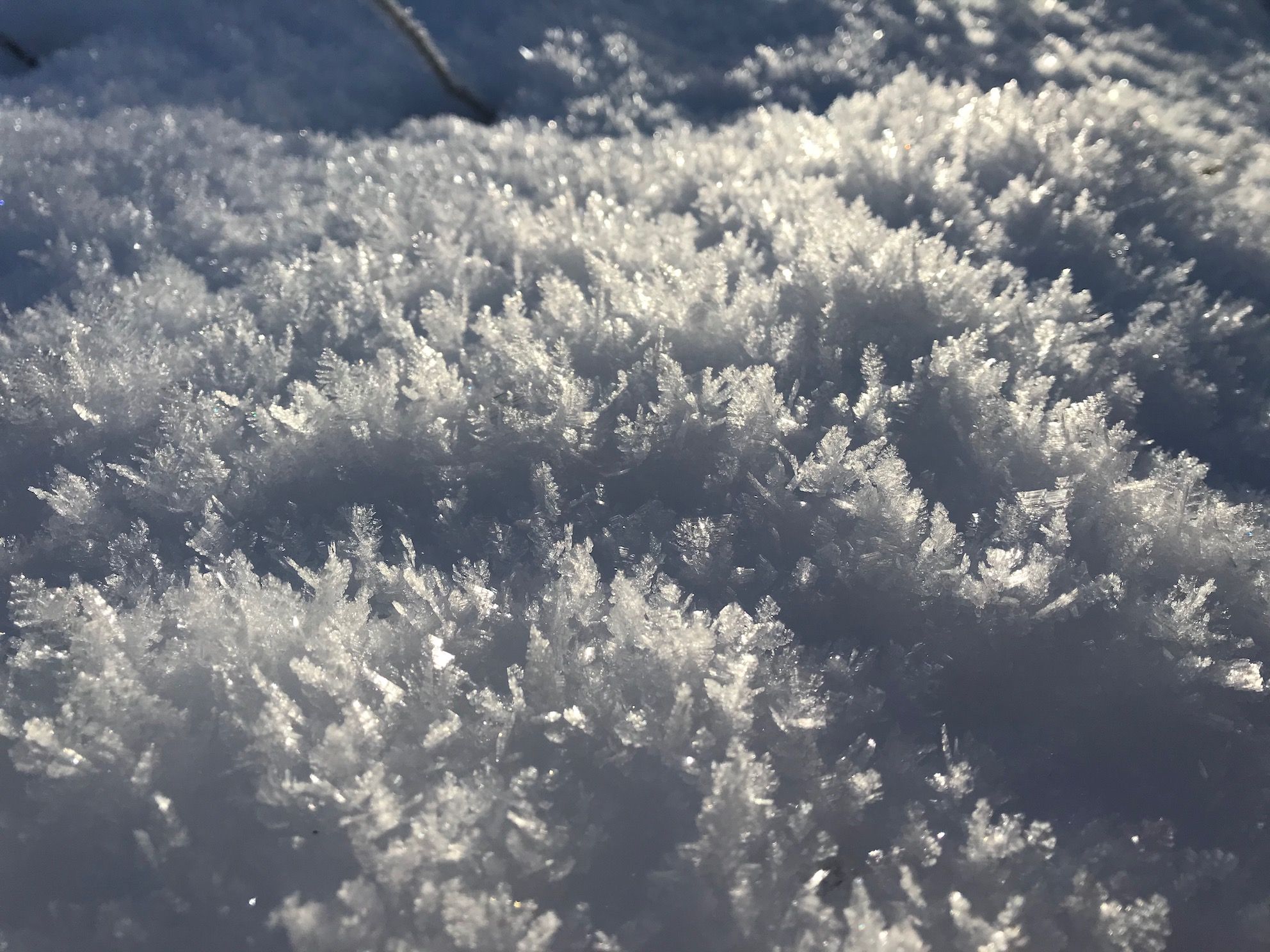 De sneeuw die gevallen is heeft een andere structuur dan die in Nederland. Deze sneeuw heeft hele grote kristallen en als je erop loopt knispert en kraakt het veel meer dan we gewend zijn.